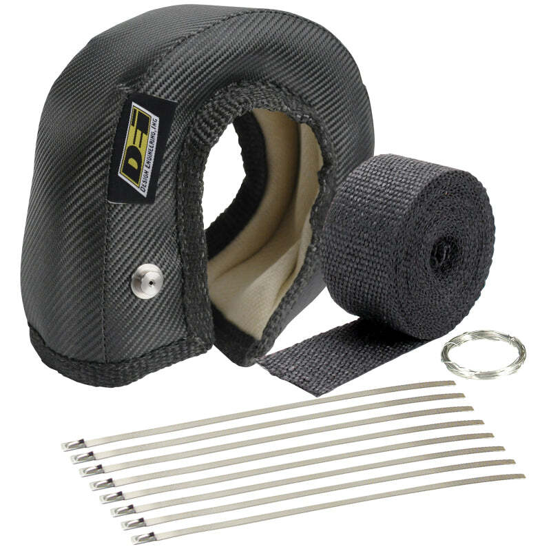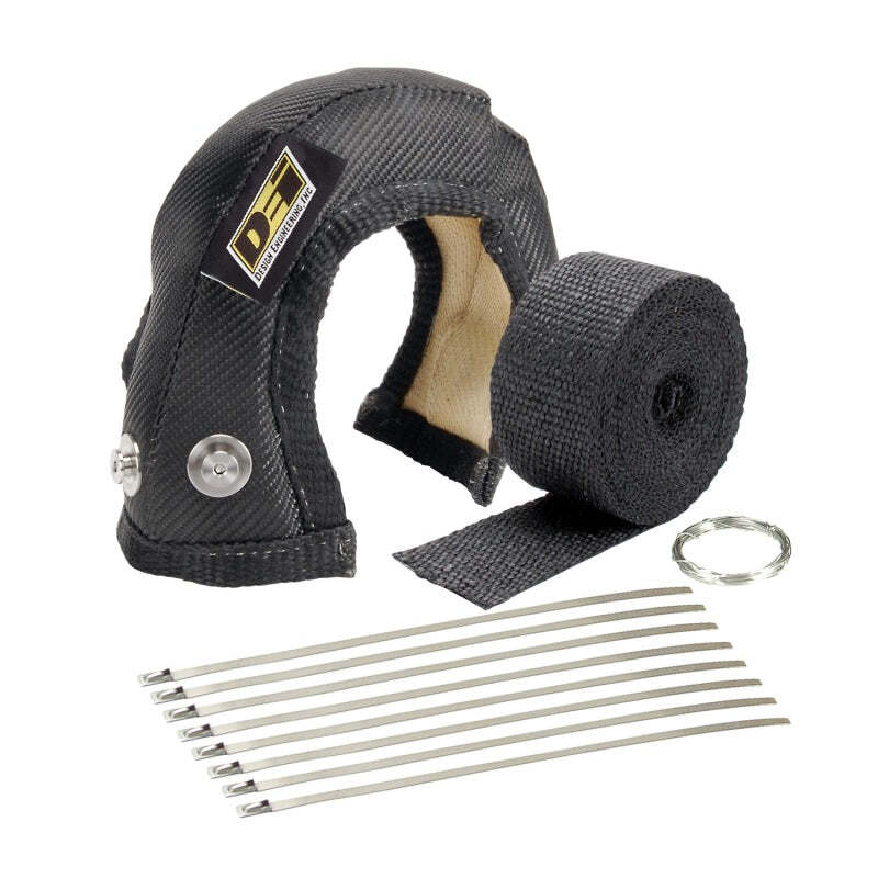 Turbo Shields solve the problem of extreme underhood heat, stops heat damage of painted or carbon fiber hoods and helps turbos spool faster. DEI recognized the need for new Turbo Shield applications, and now offer Turbo Shields in the smaller turbo sizes. Unlike cheap, knock-off copies, DEI Turbo Shields use an exclusive combination of premium heat resistant textiles and newly designed stainless steel attachment anchors. DEI Turbo Shields are used to maintain a more consistent temperature in the turbo, increasing efficiency and decreasing turbo lag. In addition to Garrett(R) brand turbo housings, the ONYX Series(TM) Turbo Shields will fit several other popular turbo brands including Mitsubishi(R) and others. Strong riveted anchors to secure shield Black carbon fiber look Ultimate thermal barrier reduces turbo lag Double reinforced seams inside & outside Available as Shield only or in a kit Each Kit includes: 1 - Turbo Shield 1 - 2in x 15ft roll of Black Wrap 2 - 20in Stainless Steel Locking Ties 1 - 5ft roll of fastening wire Turbo Shield Kit; T4; Onyx; Turbo Shields solve the problem of extreme underhood heat, stops heat damage of painted or carbon fiber hoods and helps turbos spool faster. DEI recognized the need for new Turbo Shield applications, and now offer Turbo Shields in the smaller turbo sizes. Unlike cheap, knock-off copies, DEI Turbo Shields use an exclusive combination of premium heat resistant textiles and newly designed stainless steel attachment anchors. DEI Turbo Shields are used to maintain a more consistent temperature in the turbo, increasing efficiency and decreasing turbo lag. In addition to Garrett(R) brand turbo housings, the ONYX Series(TM) Turbo Shields will fit several other popular turbo brands including Mitsubishi(R) and others. Strong riveted anchors to secure shield Black carbon fiber look Ultimate thermal barrier reduces turbo lag Double reinforced seams inside & outside Available as Shield only or in a kit Each Kit includes: 1 - Turbo Shield 1 - 2in x 15ft roll of Black Wrap 2 - 20in Stainless Steel Locking Ties 1 - 5ft roll of fastening wire T4 Turbo Housings