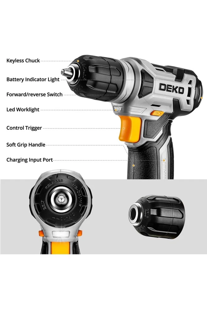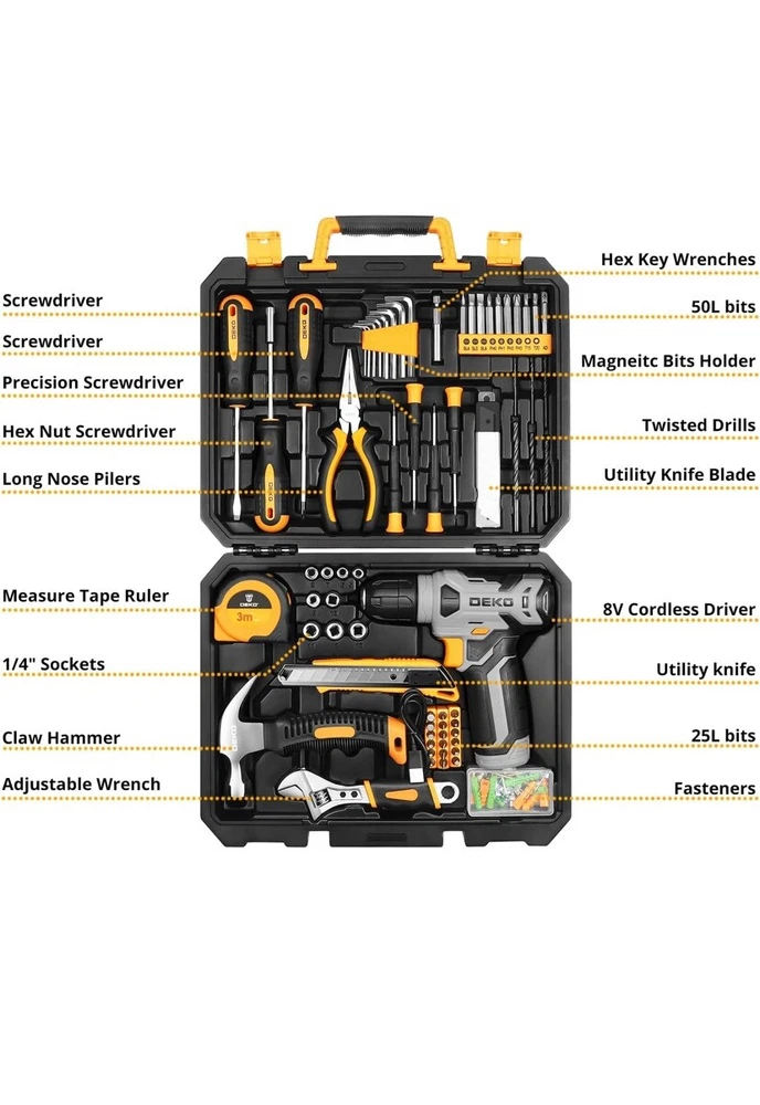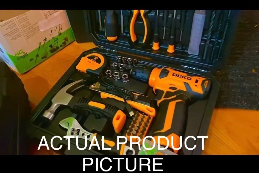 NO RETURNS ACCEPTED ON BRAND NEW ITEMS SEE MANUFACTURER FOR ANY CONCERNS IF YOU HAVE ANY QUESTIONS PLEASE ASK. Item is brand new I have one myself and don’t leave the house without it you never know when you can use any of the tools it’s universal and gets small jobs done and even big ones at times. 【Lightweight Cordless Drill】The 8V drill set can be used for drilling in wood and plastic, and tightening/loosening screws.Press the switch to adjust the speed of the electric drill, the maximum no-load speed of the mini drill is 800r/min. The net weight of the hand drill is only 1.65 pounds, and it is easy to operate with one hand. 【Rechargeable Battery】This drill is supplied with a type-C 1.5A charging cable.A universal charger or USB output(5Vd.c) can charge the small drill.The battery indicator light is at the back of the drill. 【Multi-functional Tool Kit with Drill】This tool set contains the most practical and advanced tools for design, repair or maintenance. This tool box is perfect for decoration, furniture assembly, drilling, cutting, gardening, office or daily home maintenance. 【Package Included】8V Cordless Drill, hex nut screwdriver, Screwdriver, precision Screwdriver, twisted drills, hex key, magneitc bits holder, 50L bits, 25I bits, 1/4" sockets, Measure Tape Ruler, fasteners, claw hammer, adjustable wrench, Utility Knife Blade, Utility knife, Long Nose Pilers, User Manual.
