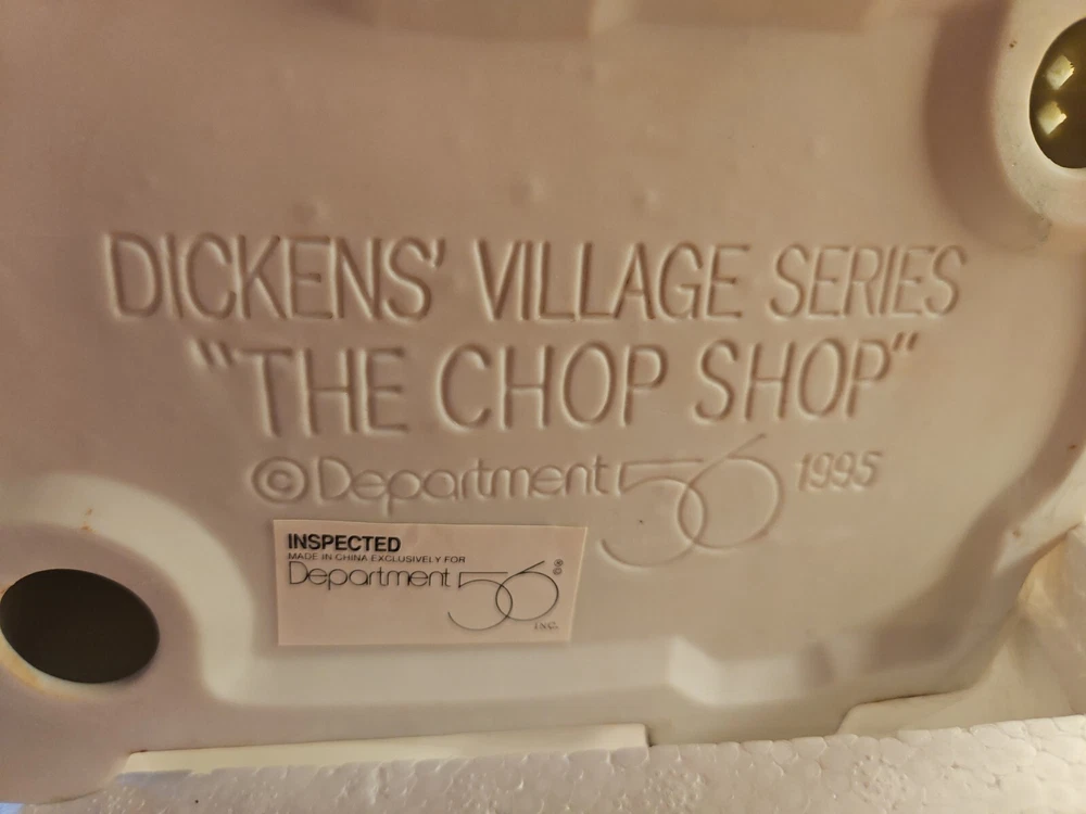 Type:Christmas VillageColor:MulticolorTheme:SeasonalRoom:ShopAntique:NoShape:ShopCollection:Dickens VillageMaterial:PorcelainFeatures:Boxed, Hand PaintedSubject:The Chop ShopBrand:Department 56Country/Region of Manufacture:ChinaSeller Notes:“No chips or cracks”Occasion:ChristmasPackaging:BoxYear Manufactured:1995Original/Reproduction:OriginalTime Period Manufactured:1990-1999