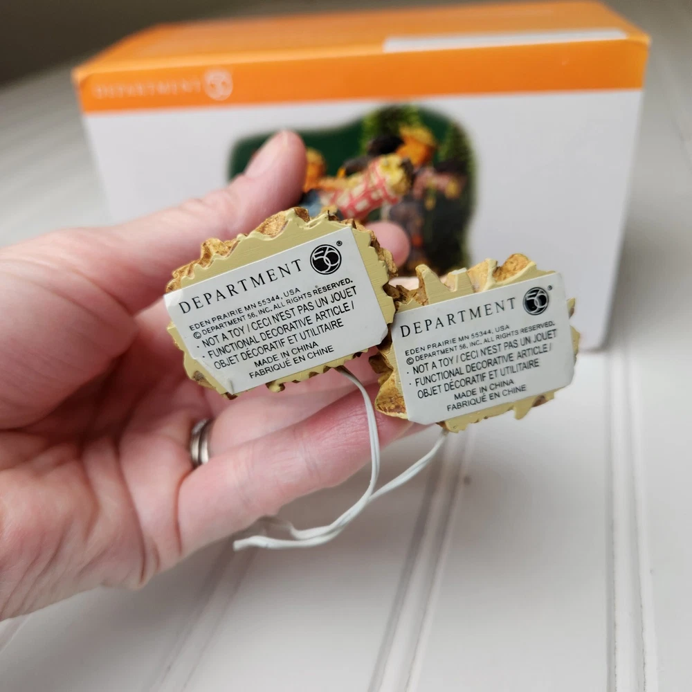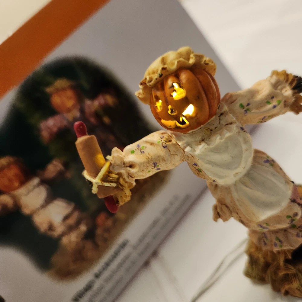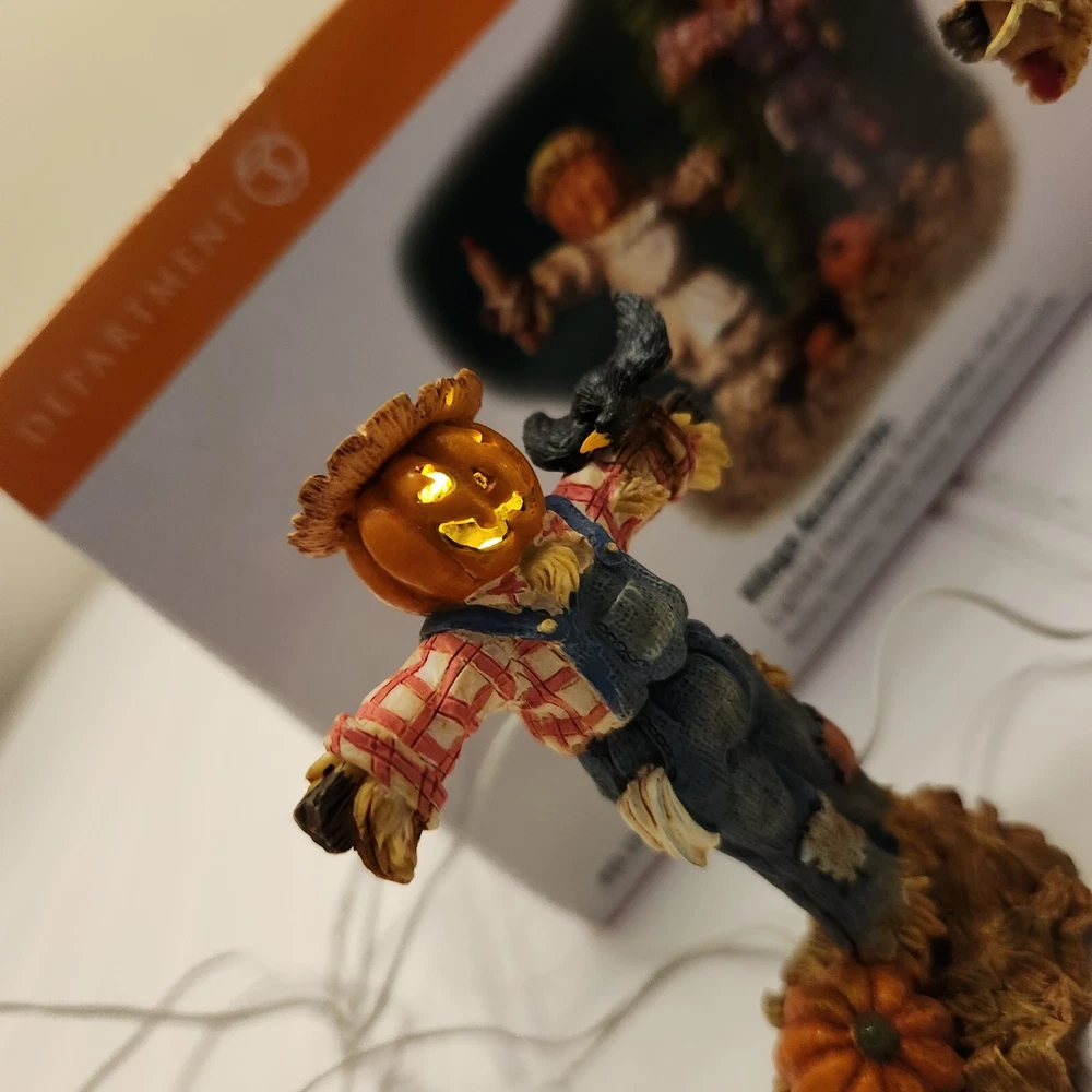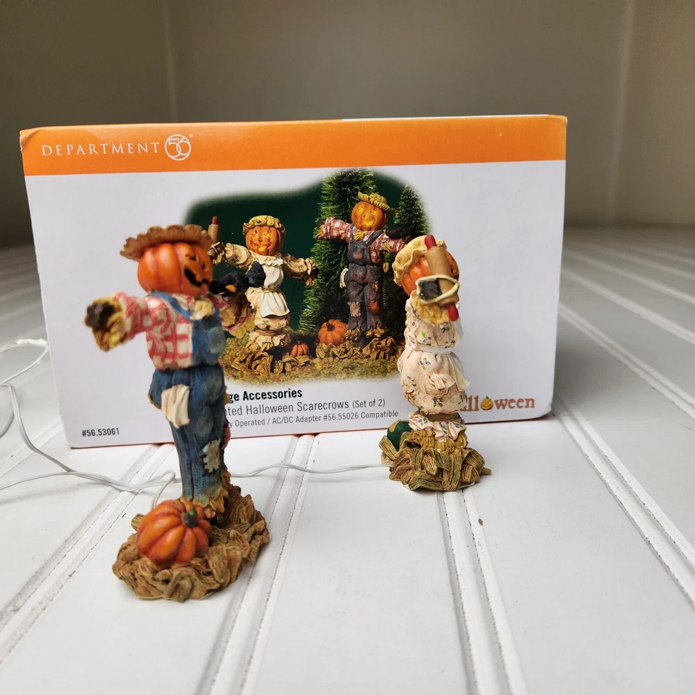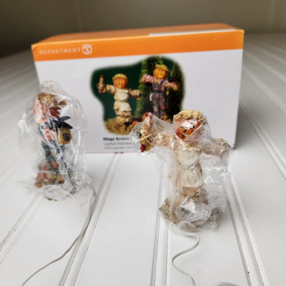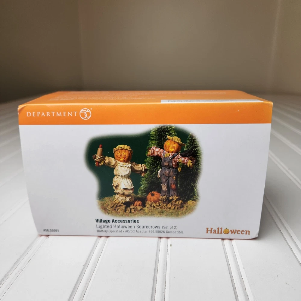 This is a DEPT 56 Halloween Village accessory featuring LIGHTED HALLOWEEN SCARECROWS, which are new open box. It is a collectible item that would make a spooky addition to a Halloween-themed display or village. This accessory is perfect for decorating during the Halloween season and would add a festive touch to any holiday display. Takes two c batteries not included. New open box never displayed. Batteries not included