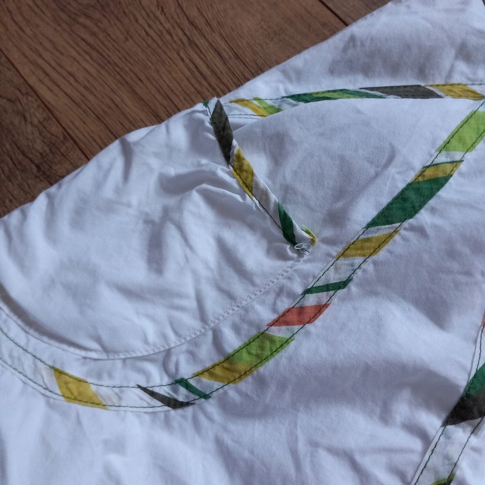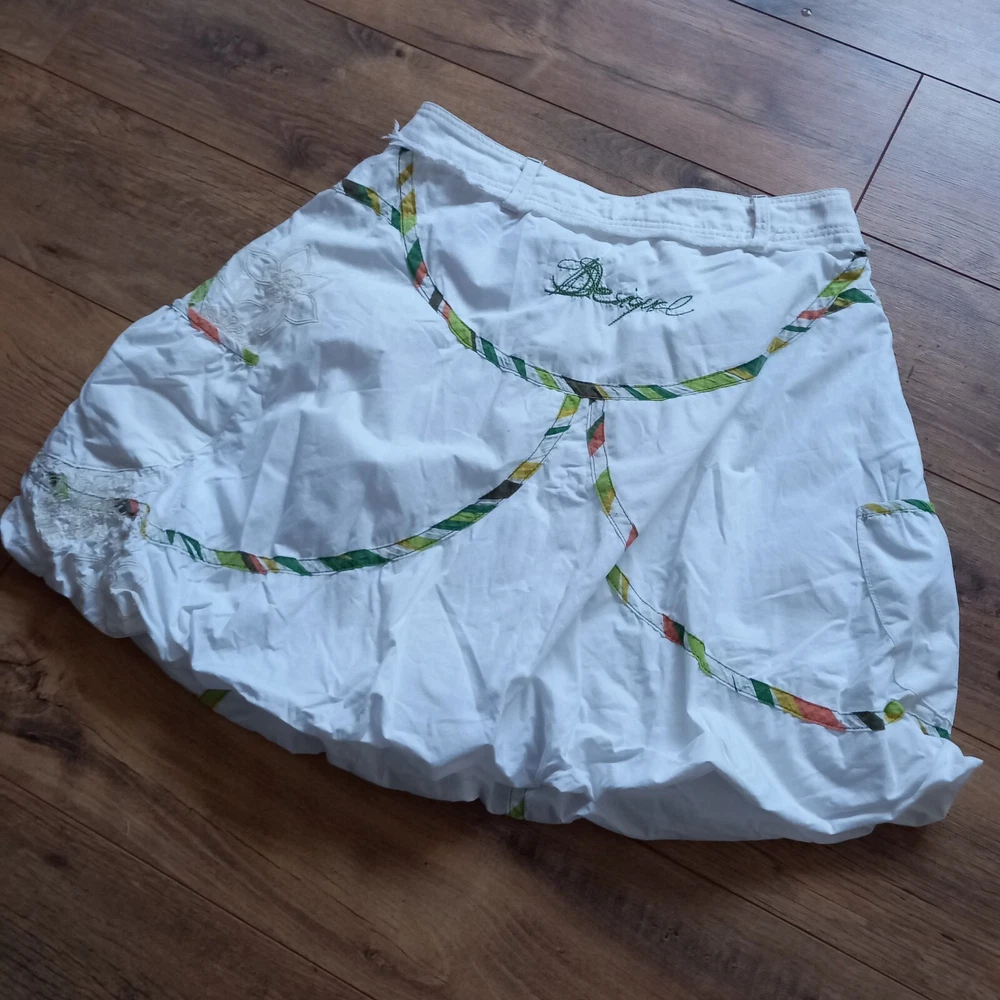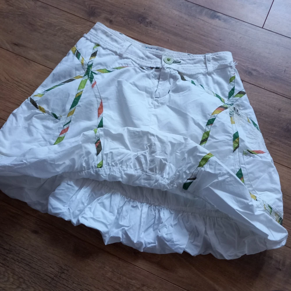 Good condition with no faults found. Unusual bubble hem vintage Desigual iconic design from Spain. Inner label been removed but has 14" across waistband which is in denim, rest of skirt is cotton. Measures 19" in length approx, 19" across hip area. Waist is low so probably best fits a uk 6 or poss 8.