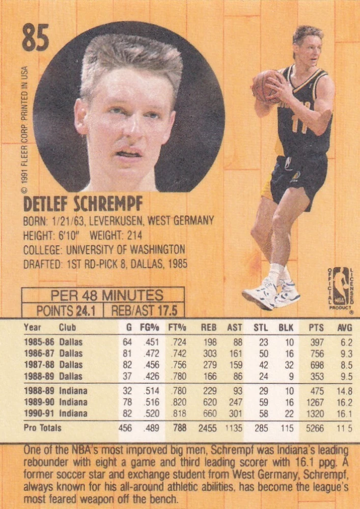 Elevate your collection with the 1991-92 Fleer #85 Detlef Schrempf card, a must-have for basketball enthusiasts and collectors alike. Featuring the Indiana Pacers' notable power forward, this card captures the essence of Schrempf's dynamic presence during the early '90s NBA era. Manufactured by Fleer, it's part of the iconic base set, providing authenticity and a slice of basketball history. Crafted in the United States, this standard-sized card is made of sturdy card stock, ensuring its longevity. It's an original print from the 1991-92 season, reflecting the NBA's vibrant legacy without the addition of an autograph. Ideal for fans of the sport or collectors seeking to commemorate Detlef Schrempf's contribution to basketball, this card is a timeless piece of sports memorabilia.