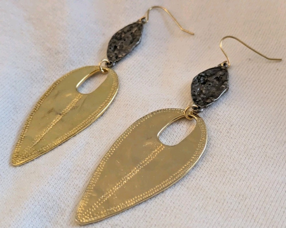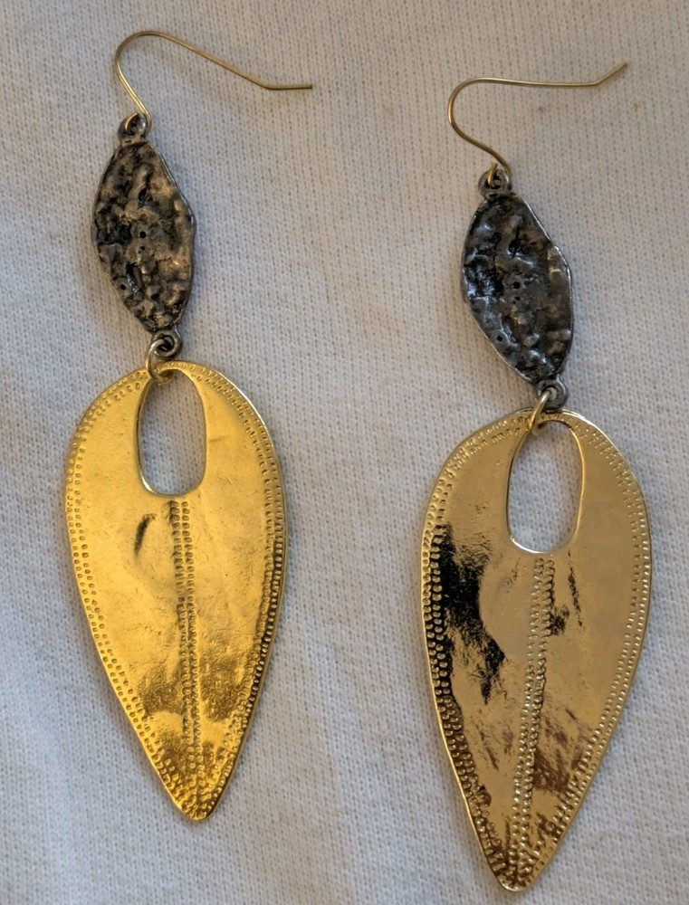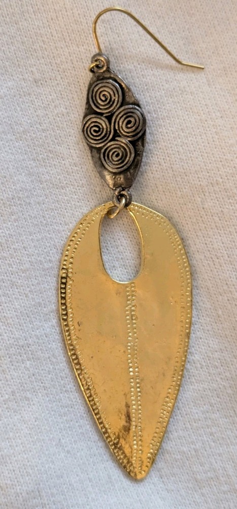 Pre owned beautiful Boho/Hippie african tribal drop earrings gently used fish hoop wires. These are a tribal style of earrings made from gold tone and silver tone metal. The silver tone links have rune style spirals. These are fun to wear and they look great on