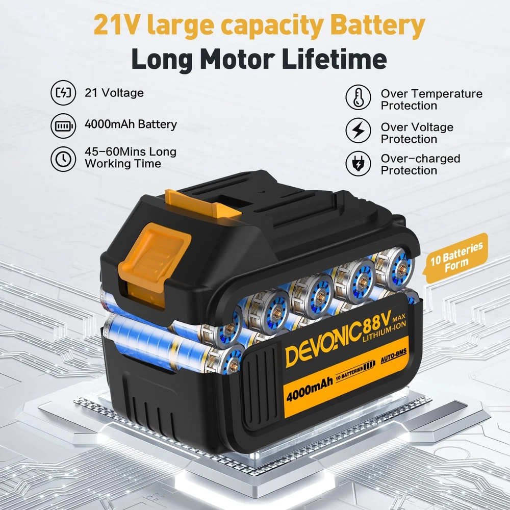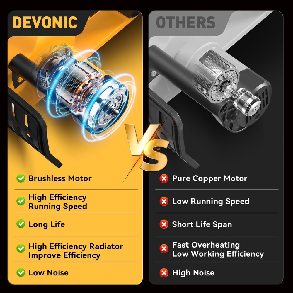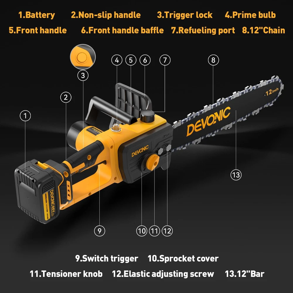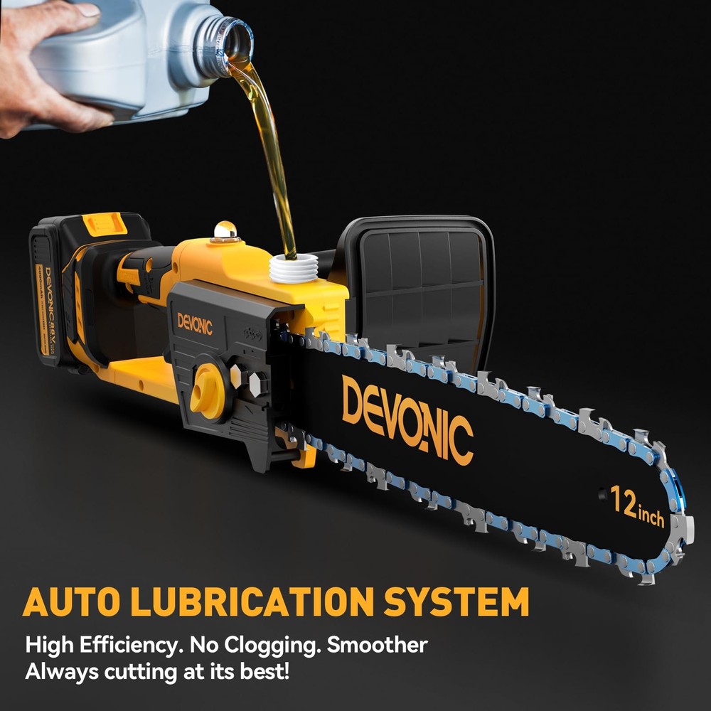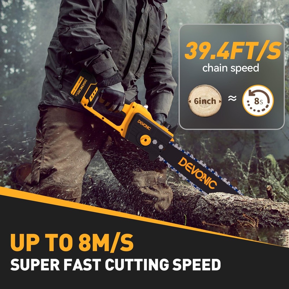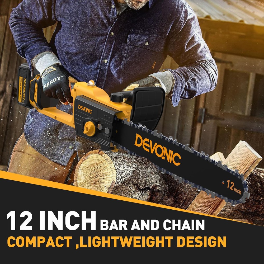 The Devonic Mini Chainsaw 12 Inch Cordless, a powerful and efficient tool designed to meet all your wood cutting and tree trimming needs. This handheld electric chainsaw features a larger cutting surface with a 12-inch cuttable face length and a total steel plate length of 9 inches, allowing you to tackle thicker trees effortlessly. Built with a high-quality guide chain and a pure copper motor, this mini chainsaw ensures smooth and fast cutting, significantly improving your cutting efficiency. Whether you’re pruning branches or cutting firewood, the Devonic Mini Chainsaw delivers reliable performance every time. Equipped with a 20V 2000mAh rechargeable lithium battery, this battery-powered chainsaw offers extended usage times. For even longer operations, it comes with two batteries that can be charged at any time, ensuring you’re always ready for the next task. Despite its powerful capabilities, the Devonic Mini Chainsaw is lightweight and portable. It comes with a compact suitcase that perfectly stores all accessories, making it easy to carry around. The quick and easy assembly process means you can set it up in just 1 minute, making it an ideal tool for both beginners and experienced users. The upgraded copper wire high-efficiency motor provides longer run-time, more torque, and greater power, reducing wear and tear and extending the lifespan of your chainsaw. This ensures that your handheld chainsaw will be a reliable companion for many years to come. 【Powerful And Efficient Cutting】Well built with 1000 watts super power BRUSHLESS motor, the mini chainsaw takes only 10 seconds to cut through a 12inch thick branch. Greatly Save your valuable time, energy and money for trimming yard. 【Efficient Brushless Motor】 This electric chainsaw has a strong BRUSHLESS motor that doubles its lifespan and reduces energy usage by 50%. It also produces only 35% of the noise compared to similar products.Experience uninterrupted and efficient cutting performance for effortless backyard or garden transformations. 【Rechargeable Long Life Battery Pack】The DEVONIC electric chainsaw is equipped with 2pcs 21V 4000mAh high-energy lithium battery pack that's removable and rechargeable.Providing long-lasting use. It can be conveniently and quickly charged at any time. If you do not use the chainsaw for an extended period, please fully charge the batteries before storing them. 【Convenience and Safety】The Mini Chainsaw cordless With an ultra-light body of 5 lbs with an ergonomic grip, it is ideal for gardening work by women and the elderly.Equipped with safety measures to protect body safety: ①Switch lock to prevent accidental start. ② Flaps to prevent splashing wood chips. ③Goggles to protect your eyes. 【2 Years Warranty& Professional Service】Every DEVONIC Mini Chainsaw Battery Powered comes backed by a 24-month hassle-free replacement warranty, eliminating the need for returns. Our professional service team is dedicated to resolving your concerns within 24 hours. Get a prompt and satisfactory response.