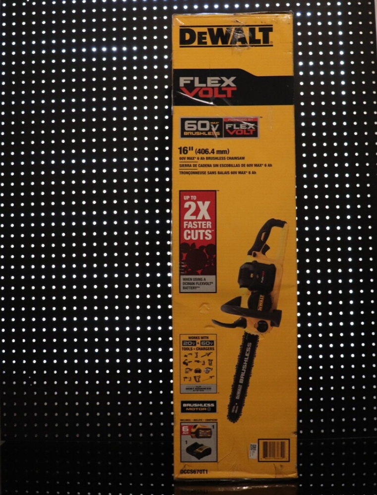 Tackle heavy-duty cutting tasks with confidence using the DEWALT DCCS670T1 60V MAX FLEXVOLT 16" Chainsaw Kit * Designed for demanding applications, this powerful cordless chainsaw delivers gas-like performance with the convenience of battery power. Includes: ✅ DEWALT DCCS670 60V MAX* Chainsaw ✅ User manual and original retail packaging Key Features: ⚡ 60V MAX FLEXVOLT Battery System * – Powers through tough cuts, compatible with 20V/60V tools 🌲 16” Oregon Low-Kickback Bar & Chain – Ideal for storm cleanup, firewood, and jobsite use 💨 Brushless Motor – Delivers longer runtime, better efficiency, and enhanced durability 🔒 Chain brake for kickback protection 🔁 Automatic oiling system and tool-free tensioning for easy maintenance