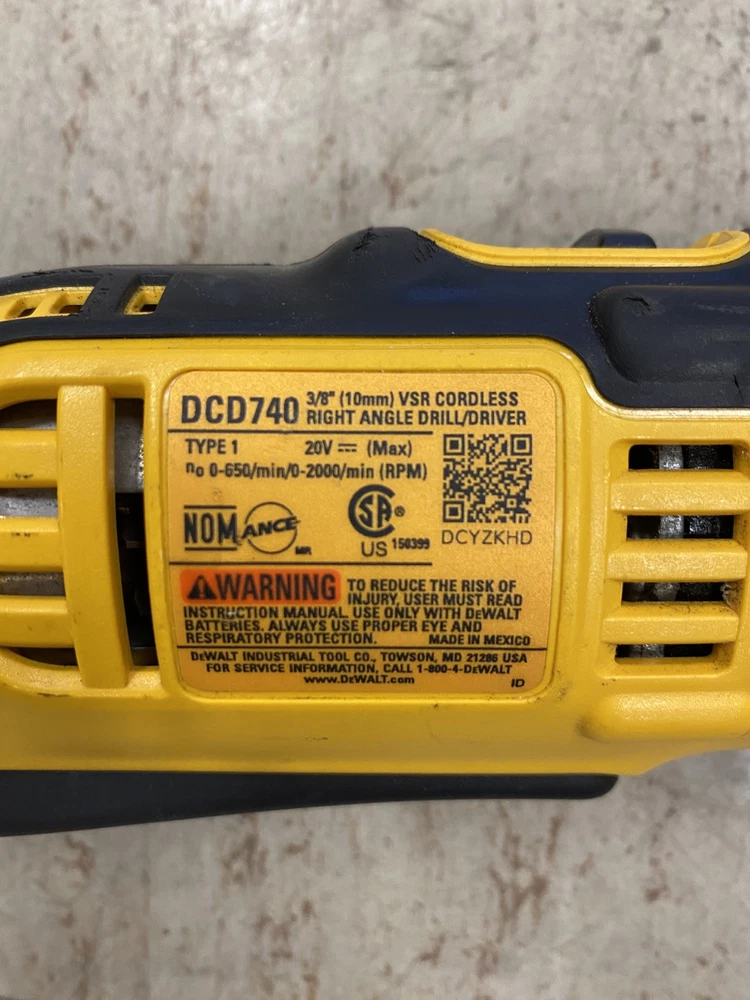 Number of Items in Set:1Type:Right Angle DrillMPN:DCD740Chuck Size:3/8 inModel:DCD740Brand:DEWALTMaximum Torque:35 NmBattery Technology:Lithium-Ion (Li-Ion)Power Source:BatterySpeed:1800 RPMVoltage:18 V