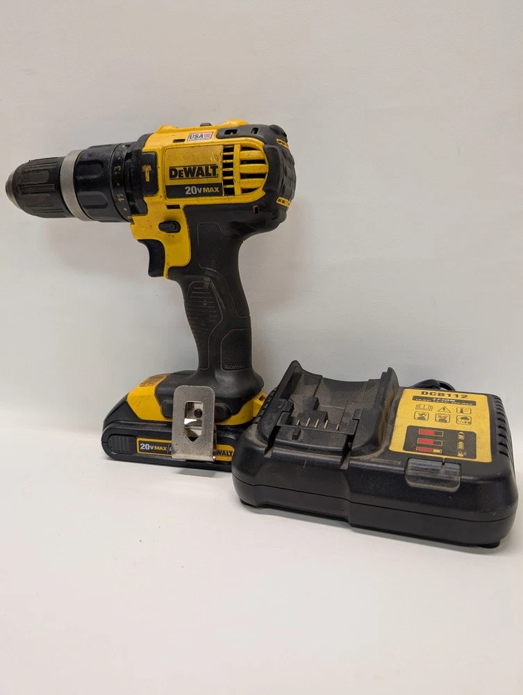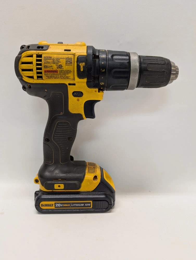 Type: Hammer Drill Number of Items in Set: 3 Charging Time: 90 Seller Notes: “Preowned; good condition” Auxiliary Handle: No Maximum Torque: 350 UWO Battery Included: Yes Brand: DeWalt Color: Yellow Battery Capacity: 1.5Ah MPN: DB9AVXE Power: Battery Speed: 2000 Country/Region of Manufacture: Unknown Voltage: 20V Features: Lightweight, and durable Motor Type: Brushed Chuck Size: 1/2 Number of Batteries: 1 Set Includes: Drill, Battery and Charger Battery Technology: Lithium Ion Cable Length: N/A Power Source: Battery Model: DCD785 Chuck Type: Keyless