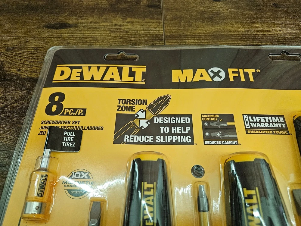 The DeWalt Max Fit Phillips/Slotted Assorted Screwdriver Set includes 8 pieces of screwdrivers designed for various tasks. With a cushion grip feature, it provides comfortable handling during use. The set is suitable for standard (SAE) measurements and comes in a sleek black color, reflecting the high-quality and durability characteristic of the DEWALT brand. Perfect for home improvement and workshop projects, this screwdriver set is a reliable tool for both professionals and DIY enthusiasts.