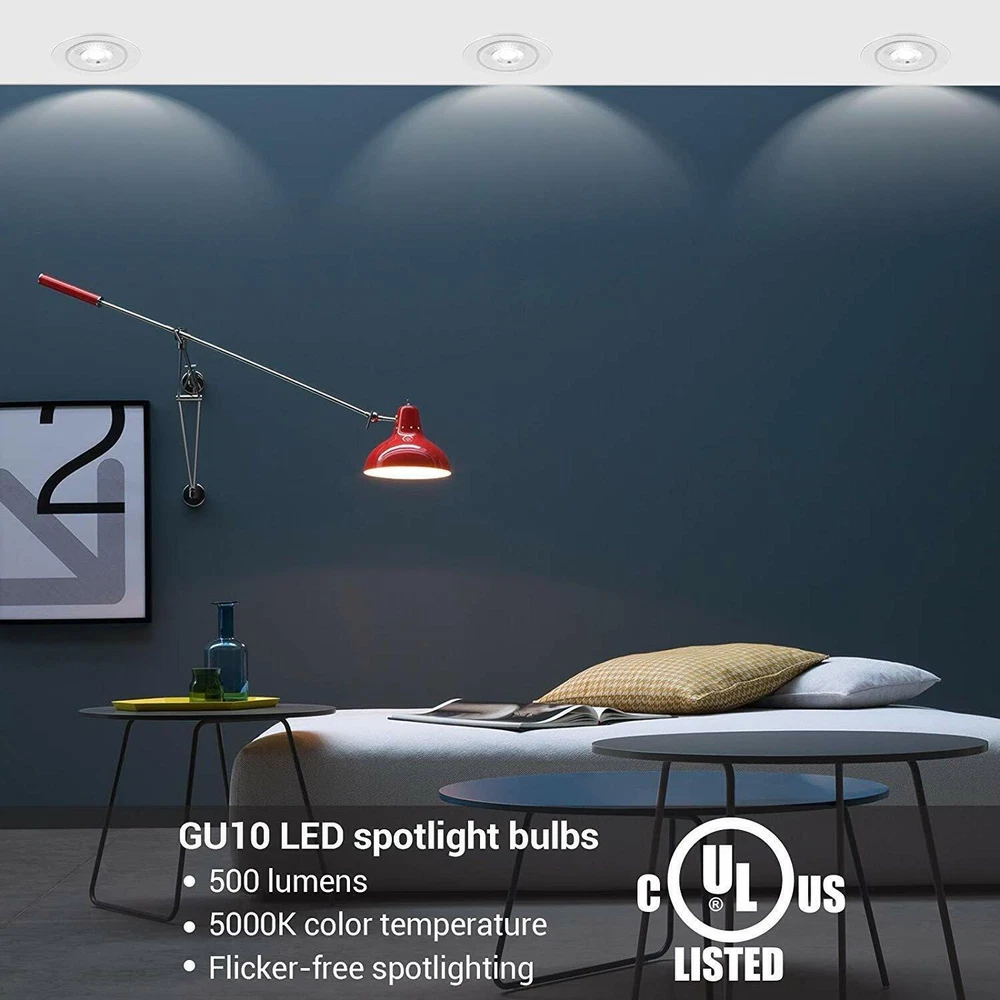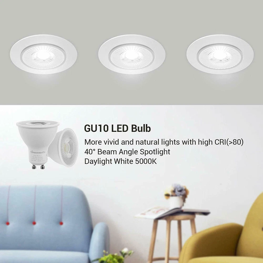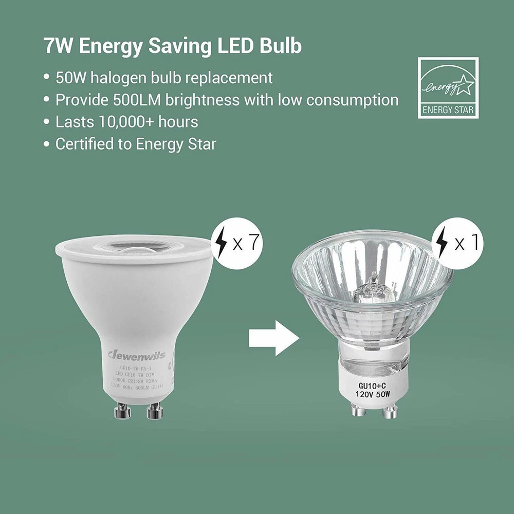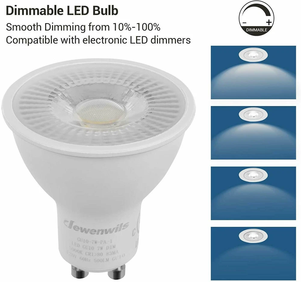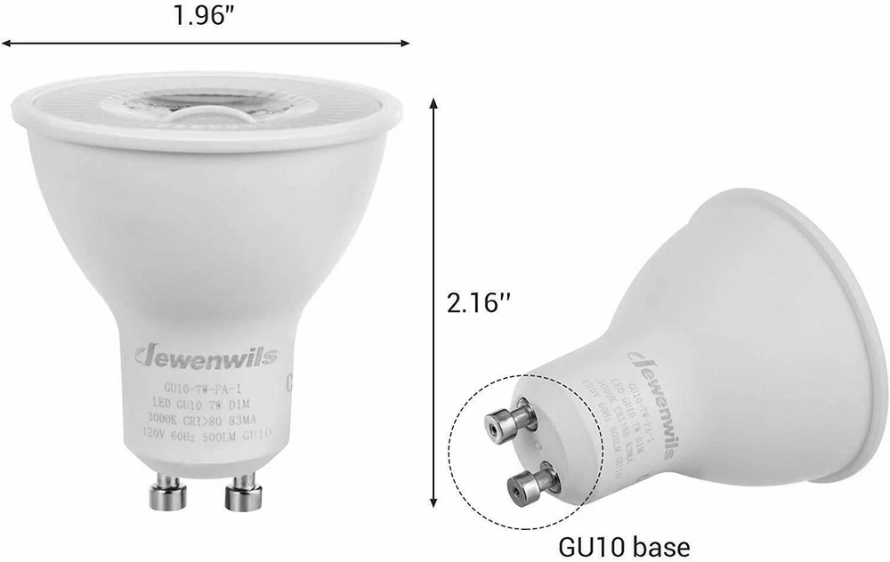 DEW ENWILS 10-Pack/6-Pack GU10 LED Dimmable Bulb, 500LM, 5000K/3000K Warm White Daylight Track Light Bulb, 7W(50W Halogen Equivalent) LED Bulbs, UL Listed 3000K 10 Pack LED Dimmable Bulb-GU10 Base 3000K Warm White DEWENWILS GU10 base spotlights are aimed to replace your current 50-Watt halogen ones, these 7W LED bulbs are rated to last 10, 000 hours, much longer lifespan than the equivalent incandescent lights, saving your money and time. Can be fully dimmable, works with any dimmer switch(NOT included), adjust its brightness to meet any occasion. Choose a dependable high quality 120-Volt GU10 bulb for residential or commercial applications. Size: 1.96*2.16 inch Wattage: 7W(50w equivalent) Lumen: 500LM Beam Angle: 40 degree Package: 10 Pack Color Temperature: Warm White(3000K) 6 Pack LED Dimmable Bulb-GU10 Base 3000K Warm White DEWENWILS GU10 base spotlights are aimed to replace your current 50-Watt halogen ones, these 7W LED bulbs are rated to last 10, 000 hours, much longer lifespan than the equivalent incandescent lights, saving your money and time. Can be fully dimmable, works with any dimmer switch(NOT included), adjust its brightness to meet any occasion. Choose a dependable high quality 120-Volt GU10 bulb for residential or commercial applications. Size: 1.96*2.16 inch Wattage: 7W(50w equivalent) Lumen: 500LM Beam Angle: 40 degree Package: 6 Pack Color Temperature:Warm White(3000K) Voltage: 120V AC 5000K 10 Pack LED Dimmable Bulb-GU10 Base 5000K Color Temperature DEWENWILS GU10 base spotlights are aimed to replace your current 50-Watt halogen ones, these 7W LED bulbs are rated to last 10, 000 hours, much longer lifespan than the equivalent incandescent lights, saving your money and time. Can be fully dimmable, works with any dimmer switch(NOT included), adjust its brightness to meet any occasion. Choose a dependable high quality 120-Volt Gu10 bulb for residential or commercial applications. Size: 1.96*2.16 inch Color Temperature: Daylight White(5000K) Wattage: 7W(50w equivalent) Lumen: 500LM Beam Angle: 40 degree Package: 10 Pack 6 Pack LED Dimmable Bulb-GU10 Base 5000K Color Temperature DEWENWILS GU10 base spotlights are aimed to replace your current 50-Watt halogen ones, these 7W LED bulbs are rated to last 10, 000 hours, much longer lifespan than the equivalent incandescent lights, saving your money and time. Can be fully dimmable, works with any dimmer switch(NOT included), adjust its brightness to meet any occasion. Choose a dependable high quality 120-Volt Gu10 bulb for residential or commercial applications. Size: 1.96*2.16 inch Color Temperature: Daylight White(5000K) Wattage: 7W(50w equivalent) Lumen: 500LM Beam Angle: 40 degree