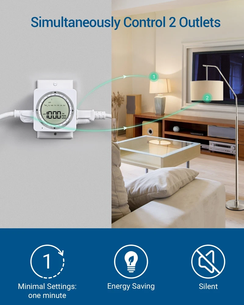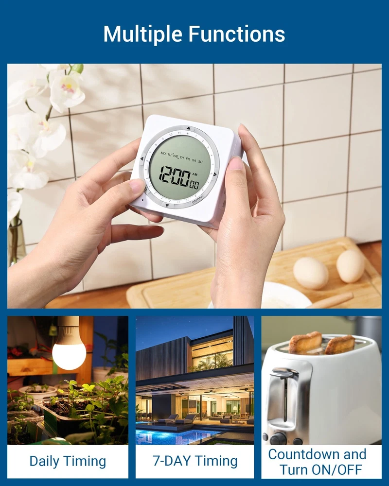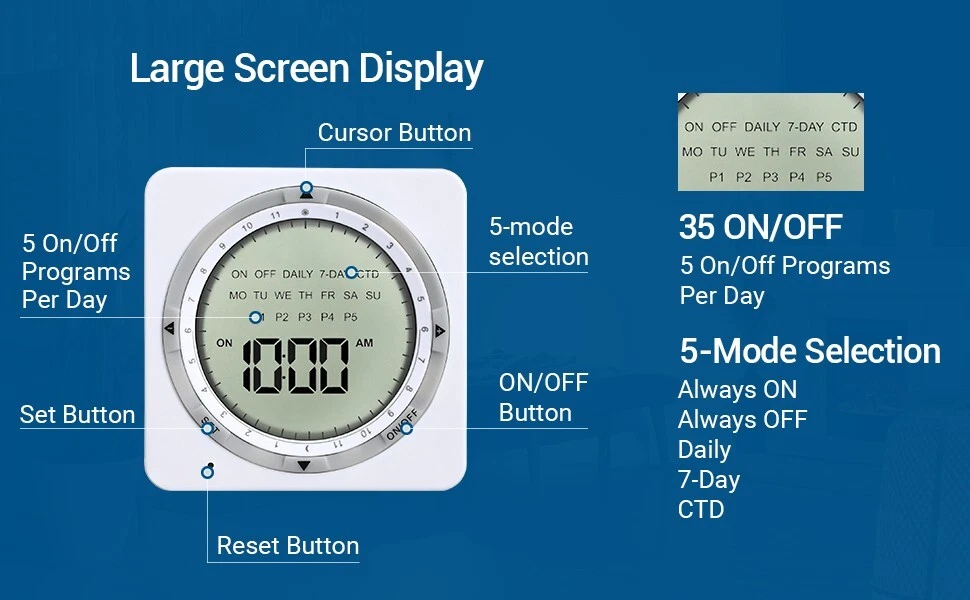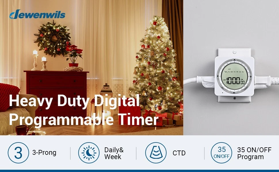 DEWENWILS Digital Timers for Electrical Outlets, Daily/7-Day/CTD, 120V 15A 1800W Indoor Light Timer, Dual 3-Prong Outlet, Easy to Program for Light, Lamp, Pump, Heater, Fan DEWENWILS is a professional manufacturer specializing in Home Improvement, Consumer Electronics, and Outdoor Equipment. Our primary aim is to provide you and other valuable members of the community with higher-quality products. A satisfying shopping experience is amongst our top priorities. Specifications: Upgraded super large display makes clearer and more intuitive 35 switching times can be set, the minimum setting can be accurate to 1 minute the time display can be accurate to 1 second Input Voltage: 120VAC, 60Hz Max Power Rating: 15A, 1800W Before initial use, plug the timer in for at least 30 minutes to charge the internal battery Do not connect any devices which may exceed the maximum ratings of this timer.