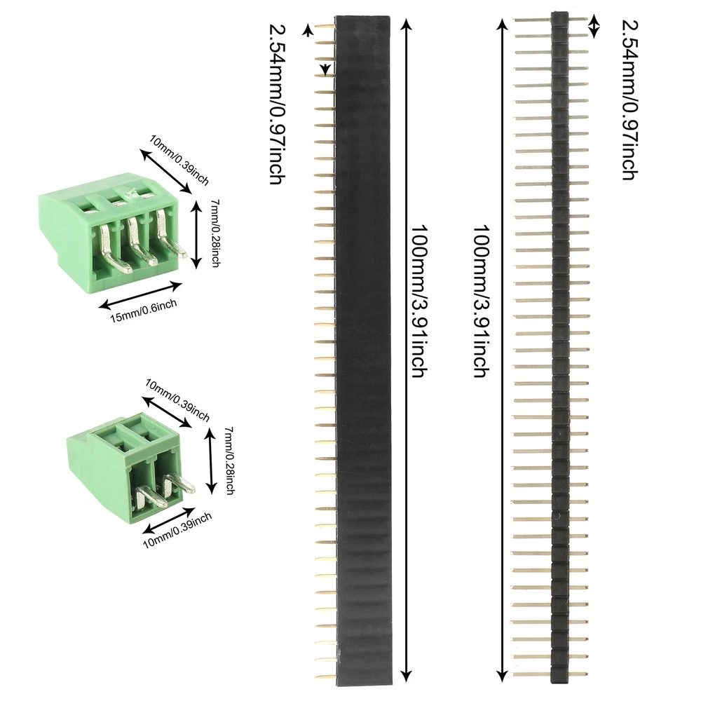 ★ High Quality set of bare PCB with the etched FR4 glass-epoxy circuit board; ★ Solder-able Circuit Protoboards for DIY Electronic Project; 2/3Pin Plug-in Screw PCB Terminal Block Connector; Fit to all sorts of prototype and production PCBs ★ Quality certified; With this proto board you will be able to create or incorporate unique projects into a reliably weatherproof enclosure. ★ Wonderful selection of PCB boards which fit to various electronic projects; With thickness of 1.6 mm and standard 0.1" spacing with a 0.05" offset grid for more flexibility Components Features: PCB Board features and info: - 8 pcs 2 x 8 cm (168 solder points) with a matrix of 6 by 28 Plated Through Hole (PTH) - 8 pcs 3 x 7 cm (240 solder points) with a matrix of 10 by 24 PTH - 5 pcs 4 x 6 cm (280 solder points) matrix of 14 by 20 PTH - 5 pcs 5 x 7 cm (432 solder points) matrix of 18 by 24 PTH - 2 pcs 7 x 9 cm (806 solder points) matrix of 26 by 31 PTH ★ ★ Header Sockets - 10 pcs 1 x 40 Pin Male Header Pin - 10 pcs 1 x 40 Pin Female Header Pin Pitch 0.1'/2.54mm; pin length 11.5mm / 0.45'; ★ ★ Terminal Blocks - 6 pcs 2 Pole Terminal, (2.54-2P) - 6 pcs 3 Pole Terminal, (2.54-3P) ★ Electrical Specification Rated Voltage: 150V/AC; Rated current: 6A; Contact Resistance: 20m Ohm MAX; Insulation; Resistance: 5000M Ohm/1000V; Dielectric Strength: 1250V/1 min ★ Mechanical Specification Temp range: -40F ~ +105C; Torque: 0.1 Nm; Wire range: 26~18AWG; MAX Soldering: +250C for 5 Sec; Strip length: 4.5mm; Pitch 0.1'/2.54mm Terminal blocks; Poles: 2P, 3P ★ Part and Material Screw: M1.5 Steel Zinc plated; Wire guard: Brass, Ni plated; Pin header: Brass, Tin plated; Housing: PA66, UL94V-0 100 % SATISFACTION GUARANTED ★ Excellent quality; Easy soldering; Double sided board with plated-thru holes allows components to be easily soldered to either side of the board THIS IS NOT YOUR NORMAL PERF BOARD! ★ This board is much higher quality with plated-through-holes and annular rings that will not lift off the PCB under normal soldering conditions MUTI-PURPOSE ★ General purpose prototyping circuit board for analog and digital use; With pre-tinned plated holes; Extra accessories to make life easy for you (Screw Terminal Block and Headers) THE FLEXIBILITY OF HAVING CHOICES ★ Great assortment of size and perfect for quickly prototyping stackable circuits; female and male header pin plus screw terminals for your ease and satisfaction PACKAGE COMPONENT ★ 28 Pcs of double sided PCB prototype board in 5 different size with mounting holes or slots on each board corner; 20 Header Socket (female and male); 12 pcs 2/ 3Pole Mount Screw Terminal