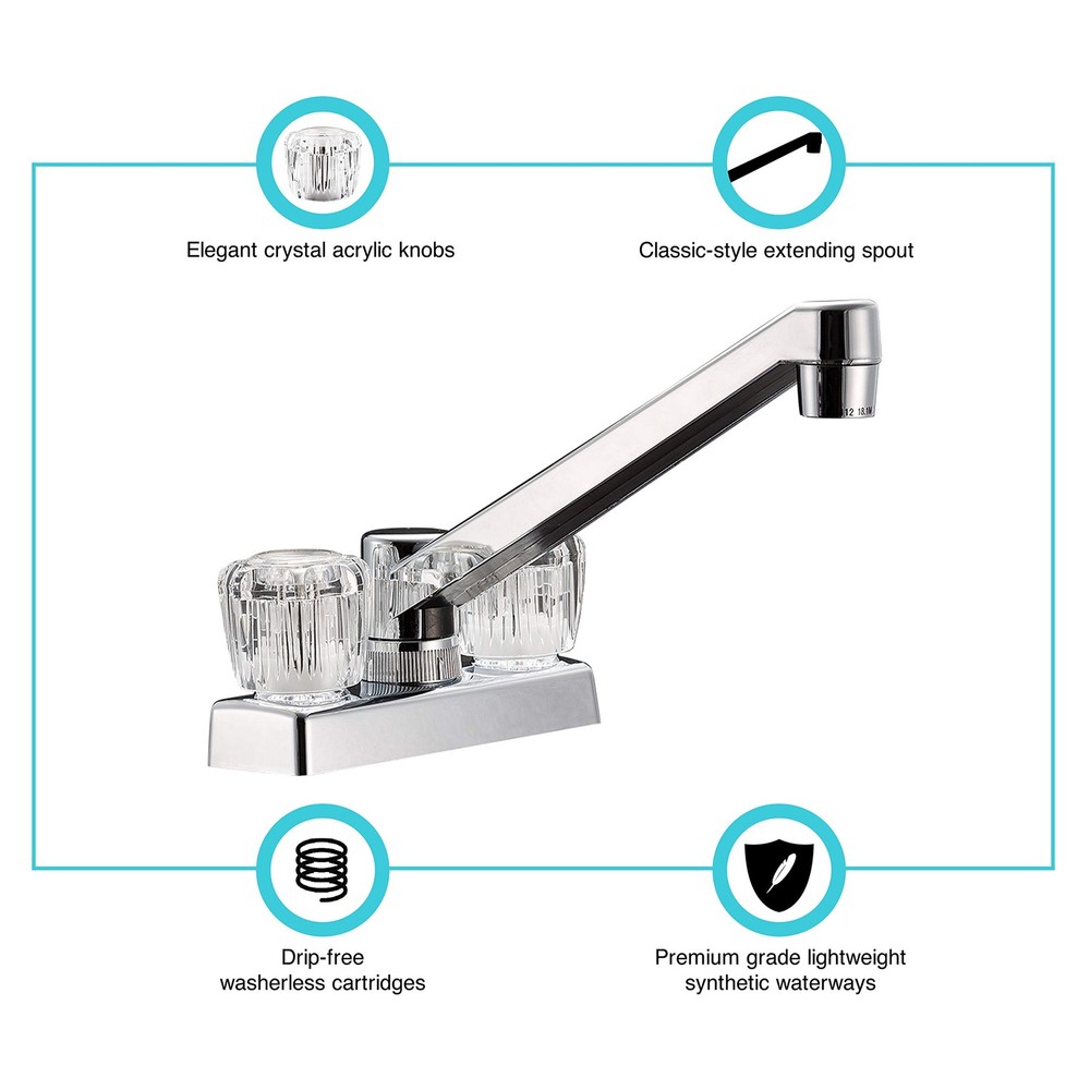The easiest and most-economical way to modernize any recreational vehicle’s space is to replace the existing plumbing hardware. You can give your vehicle a fresh new look with , all while increasing the functionality, with our extensive line of entire units and replacement parts. Replacing plumbing hardware instantly updates the entire look of your space. Our product line is so vast and stylistically-versatile that you will find what you are looking for, and won’t have to worry about the potential of clashing with your recreational vehicle’s decor...it will compliment it! Find the product that will blend best with the rest of your space with . Why : Our plumbing hardware solutions will brighten your space and you will wonder why you didn't make this small investment sooner! It may even inspire you to replace all your plumbing items for an instant and noticeable upgrade. We have oodles of products in all styles, and price points, to match your existing decor. Seriously. Broke the door on your shower box, but everything else works fine in the unit? We've got that replacement door. Don’t spend loads of money for a new unit. Get the parts you need with . We’ve got everything to get your rig looking beautiful. Refresh your vehicle’s look today! Who is : is a leading RV plumbing fixture manufacturer with years of industry experience and expertise. Our experience, combined with our relationships with the very best manufacturers, allows us to provide premium quality products at an affordable price so that you can enjoy quality, long-lasting use in your recreational vehicle. is a proud American company with USA-based Customer Support. Features | This faucet’s petite and classy design features dual acrylic crystal knobs and a convenient far reaching spout. This model’s knobs make for easy operation to quickly adjust the temperature and water flow and comes with drip-free washerless cartridges. ensures that whatever you’re cleaning you’ll be doing so comfortably! Design | This elegant faucet is made with premium grade lightweight synthetic waterway construction and has a sturdy design to keep the unit firmly in place on the sink top when vehicle is in motion. This model is fully functional for washing everything from small dishes to large pots and pans, and the polished and versatile design blends with virtually all kitchen décor styles. Quality | You can update your sink quickly and easily with this stylish faucet knowing that you are not compromising functionality or durability. Although this recreational vehicle faucet takes up a lot less space than a traditional faucet, it does not skimp on quality and power due to its size. As with all products, this model is lead-free certified. Installation | This 2-hole with 4” spacing faucet can be installed easily, so no plumber is needed. Feel free to do it yourself! To attach, effortlessly use a wrench and a screwdriver to tighten it into place and attach water connections. This is the perfect sized faucet for smaller galley and bar sinks. Specifications | Total length of this faucet is just over 8.14”, width 6.13”, and height is 6.48”. Flow rate 1.8 GPM. UPC and CUPC Certified. is a proud American company with USA-based Customer Support so if you have any issues with your product you can relax knowing that everything will be taken care of.