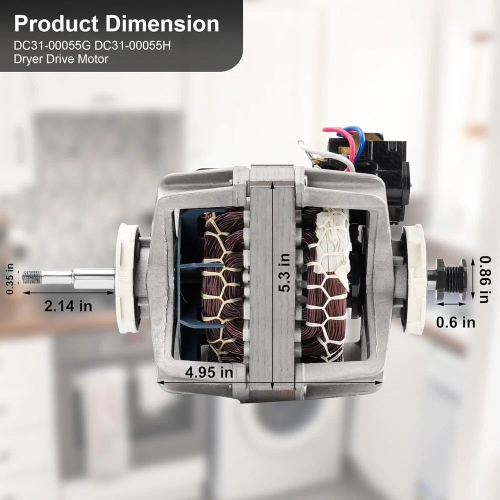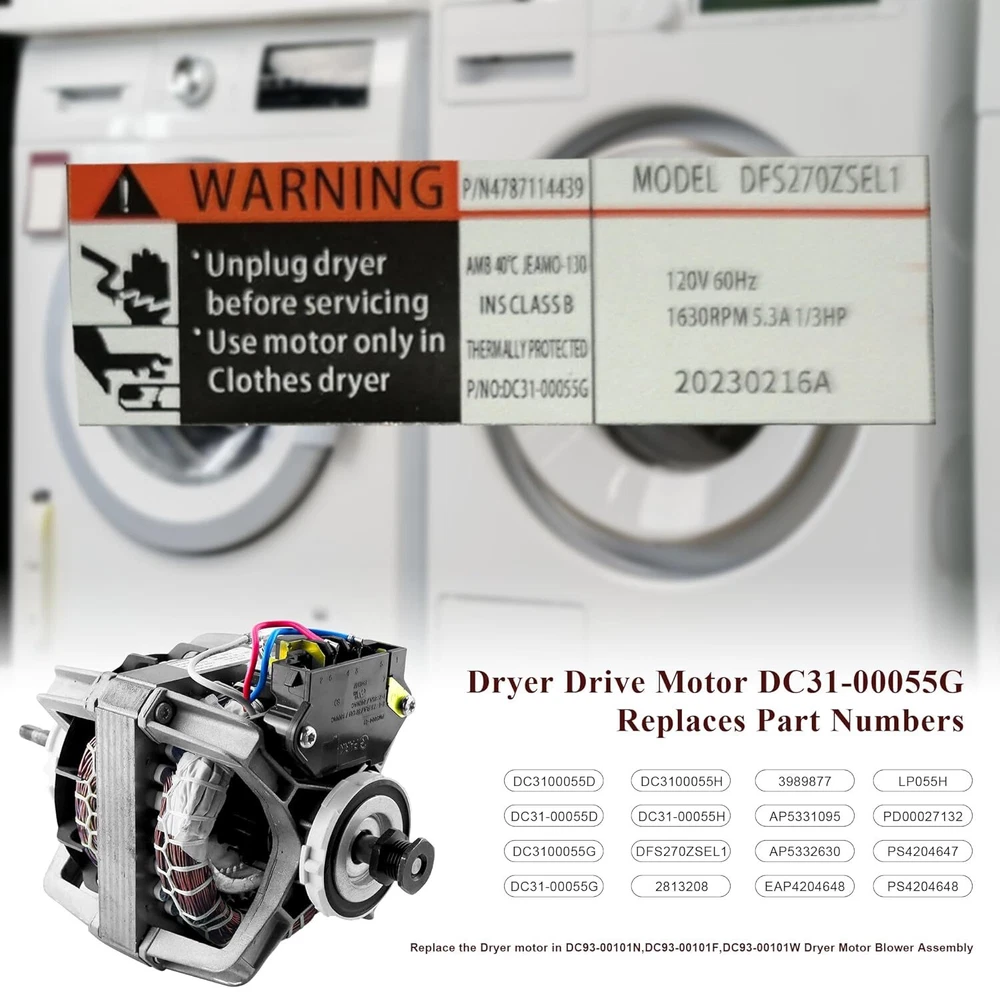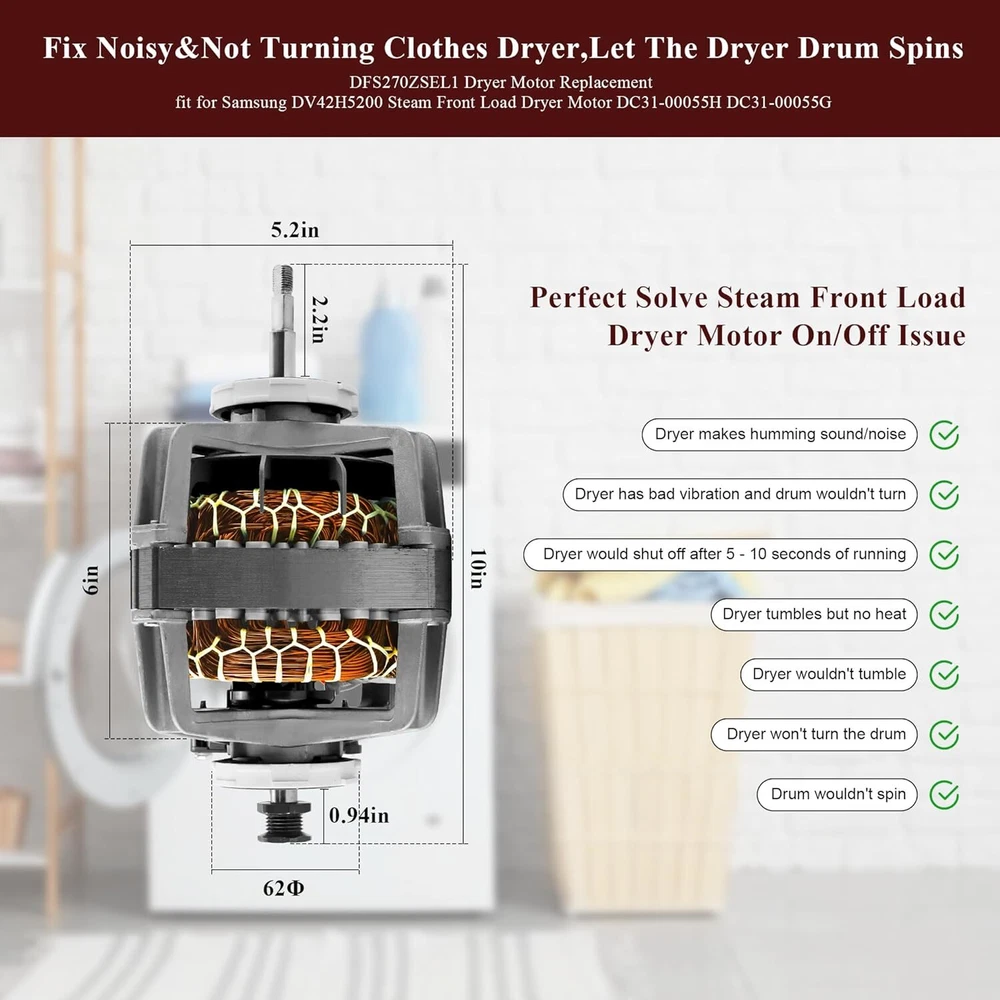 DFS270ZSEL1 Dryer Motor fit for Samsung AP5331095 Dryer Motor fit for Samsung DFS270ZSEL1 DC31-00055H DC31-00055G DC31-00055D fit for Samsung DV45K6200EZ DV328AEW DV40J300EW DVE50R5400V prime&swift Product Details Brand: prime&swift Model Name: DFS270ZSEL1 Dryer Motor fit for Samsung Dryer Motor DC31-00055G DC31-00055D DC31-00055H Speed: 1630 RPM Voltage: 120 Volts Horsepower: 0.33 hp Powerful Motor: DC31-00055G dryer drive motor made from superior-quality red copper motor. The thick red copper wires were tightly wrapped around on high silicon steel sheets providing strong power for powerful drum spinning,quieter operation Dryer Motor DFS270ZSEL1 fit for Samsung clothes dryer DV4 DV5 DV3 DVE DVG DV2 series like DV42H5200 DV45H6300 DV45H7000 DV42H5600 DV48J7770 DV42H5400 DV45K6500 DV45K6200 DV50K7500 DV50K8600 DV48H7400 DV330AEW DV350AER DV40J3000 DV42H5000 DV52J8700 Drive Motor DC31-00055G AP5331095 fit for Samsung: DV5451AEW DV220AEW DV405ETPA DV48J7700 DV5471AEP DV210AEW DV330AGB DV331AEW DV393ETPA DV405GTPA DV457EVGS DV457GVGS DV45K7600 DVE45M550 DVE60M990 DV330AEB Quieter Motor: DC31-00055G DFS270ZSEL1 dryer motor fit for Samsung DV42H5200 Steam Front Load Dryer;Dryer motor made of thick red copper wire motor which ensures a higher rotation efficiency, stable performance, and low operating noise Fix Iissues for Samsung dryer motor: dryer makes humming sound/noise,dryer has bad vibration and drum wouldn't turn,dryer would shut off after 5 - 10 seconds of running,dryer tumbles but no heat,dryer wouldn't tumble,dryer won't turn the drum Easy To Install: Disconnected all the power and wear work gloves;Remove the top panel,front panel,back panel then remove drum,Remove the motor clamps,Remove the air duct then the blower wheel,Disconnect wires,remove drive motor,Install new motor Important repair note: Fan blade bolt attached to the motor shaft uses reverse threads,Lefty=tighty; Make sure the motor locator tab is properly inserted into mounting bracket slot; 120V 60Hz 1630RPM 5.3A 1/3HP Part Function: DFS270ZSEL1 Dryer Motor fit for Samsung DFS270ZSE DC31-00055G AP5331095;Dryer drive motor used in clothes dryer and turns the drive belt that spins the dryer drum;DC31-00055H DC31-00055G DC31-00055D fit for SAMSUNG dv328aew/xaa dryer motor