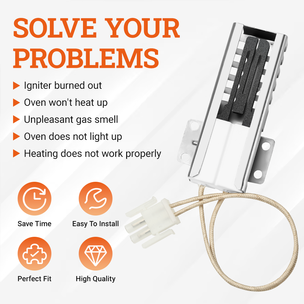 If you are unsure if your machine model matches, please contact customer service to confirm before placing an order. 【PRODUCT INCLUDED】: oven igniter includes 2 ceramic wire nuts,1 connector plug,and two connecting wires.Perfectly solve the problem of oven not heating or heating slowly,extending the service life of the oven. 【UPGRADED IGNITORS】: DG94-00520A fits for Gas Range oven ignitor.Using safe and high-quality materials,it effectively reducing preheating time,and regulating temperature normally,Our product has undergone aging testing,but due to its special material,there may be occasional discoloration issues,which will not affect its effectiveness.Please rest assured that our product quality meets OEM standards. 【COMPATABLE MODELS】: DG94-00520a igniter Compatible with nx58h5600ss/AA NX58F5500SS/AA NX58K9500WG/AA FX710BGS/XA NX58K9850SS/AA NX58H5650WS/AA NX58H9950WS/AA NX58F5500SB/AA NX58F5700WS/AA NX583G0VBSR/AA NX58J5600SG/AA NX58J5600SG/AA NX58K9850SG/AA NX58M5600SB/AA NX58M5600SW/AA NX58M9420SS/AA NX58H9500WS/AC NX58M6850SS/AA NX58M6630SG/AA NX58R5601SG/AA NX58R5601SS/AA NX58R4311SS/AA NX58T7511SS/AA NX58R4311SG/AA NX58R6631SS/AA NX58R6631SG/AA. 【INSTALLATION INSTRUCTIONS】: Simply remove the old igniter and reconnect the new one( If wire connector does not match up you will need to cut off the connector and splice the wires with porcelain wire nuts). Unplug the cooktop before installing the oven igniter. 【AFTER-SALES SERVICE】: If you have any questions or dissatisfaction after receiving the gas oven igniter replacement,please contact us in a timely manner.We will solve them for you in a timely manner and give you a satisfactory result.