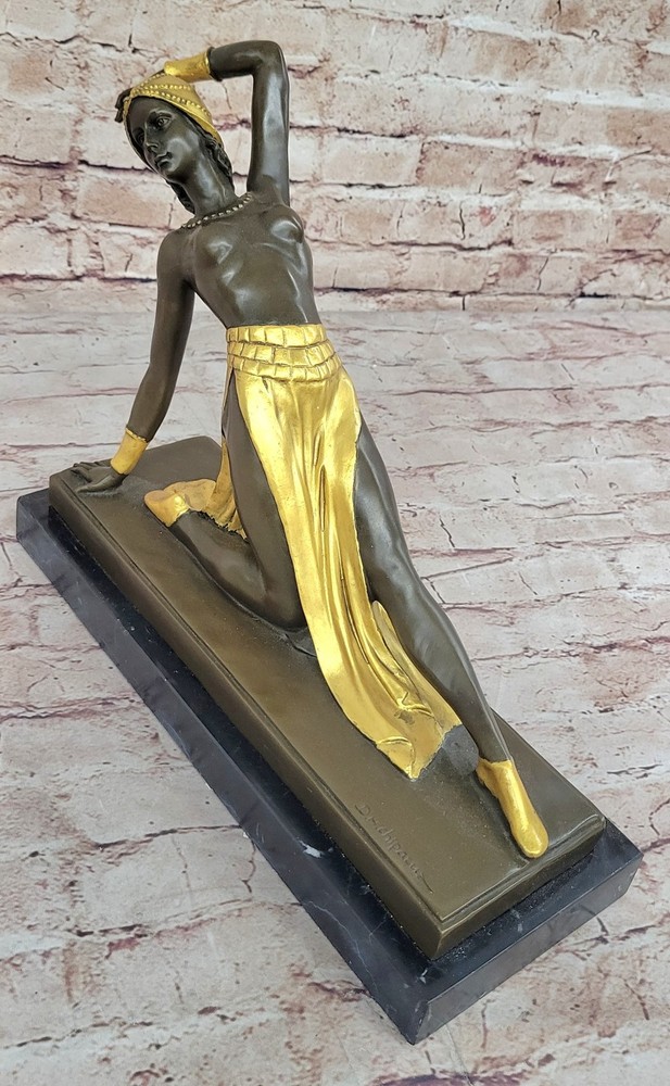 Condition : This sculpture is in perfect condition. Bronze Dimensions with Marble Base: Height 11" x Width 13" Marble Dimensions:13" X 5" Height without base:10" Weight:15 LBS Inventory:34EP175J7443 The Grace and Agility of "The Exotic Dancer" "The Exotic Dancer" is a mesmerizing bronze sculpture that captures the elegance and flexibility of a performer from the Ballet Russe, one of Chiparus' most renowned works. In this striking piece, the dancer is depicted in a graceful yet dynamic pose, kneeling on one knee while extending her other leg straight out in front of her. Her body leans back, supported by one arm, while the other arm curves gracefully around her head, showcasing the fluidity and agility of her movement. The elongated form of her pose accentuates the elegance of her figure, inviting admiration from all who gaze upon her. Intricate Detailing and Artistic Craftsmanship Every detail of the dancer's attire is meticulously rendered, from her skin-tight leotard that clings to her upper body to the flowing skirt that elegantly reveals her thighs through its slits. The gold belt cinches her waist, adding a touch of opulence to her ensemble, while gold beads and bangles adorn her neck and wrists, further enhancing her exotic appearance. The headpiece, adorned with intricate gold beads, completes the ensemble, harmonizing perfectly with her red dress. The careful attention to these details highlights the artistry of Chiparus and his ability to bring the vitality and energy of a ballet performance to life in bronze. A Masterpiece of Timeless Beauty Crafted using the ancient lost wax method, this 100% bronze sculpture is a testament to the timeless beauty and enduring appeal of Chiparus' work. The rich gold and brown patina adds depth and dimension to the piece, enhancing its visual impact. Signed by the artist, D.H. Chiparus, "The Exotic Dancer" is not just a sculpture; it is a celebration of the grace, agility, and elegance of the ballet, frozen in time for all to admire. This piece is a true collector's item, perfect for anyone who appreciates the intersection of art, dance, and history. SIGNED CHIPARUS EXOTIC DANCER ART DECO BRONZE SCULPTURE HOME DECORATION FIGURINE Video will open in a new window Using the eBay App? Paste link into a browser window: [isdntekvideo]