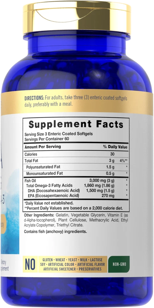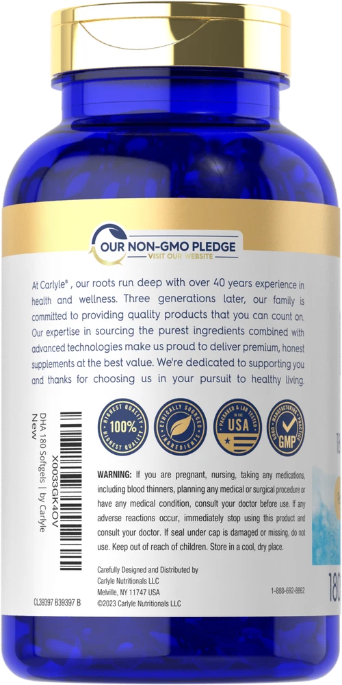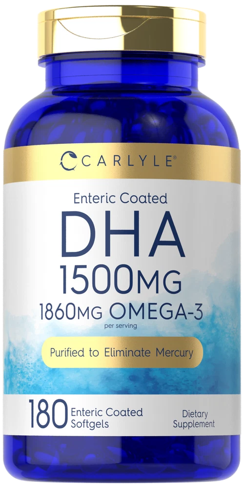 Daily Support from DHA: Research shows that a diet containing an abundance of Omega fatty acids can have many nutritional benefits. The oil derived from omega rich foods such as fish and many plants provides a wide variety of Omega-3 fatty acids such as DHA. A DHA supplement such as liquid, powder, gummies, and capsules provides a concentrated source of this nutrient to complement a strong diet. Carlyle Enteric Coated DHA: Get the nutritional benefits of DHA now in enteric coated softgels! Designed for men and women, our high potency formula provides 1,500 mg of DHA per serving plus EPA, all from premium quality fish oil. Our fish oil is purified, eliminating mercury to ensure pristine purity and high quality. Enjoy our supplement and get exceptional value with our 180-softgel supply! Rooted in Wellness: Our expertise in sourcing the purest ingredients combined with advanced technologies makes us proud to deliver premium, honest supplements at the best value. Carlyle Enteric Coated DHA is a testament to our commitment to excellence, made with powerful ingredients rooted in wellness. Thanks for choosing us in your pursuit of living healthy!