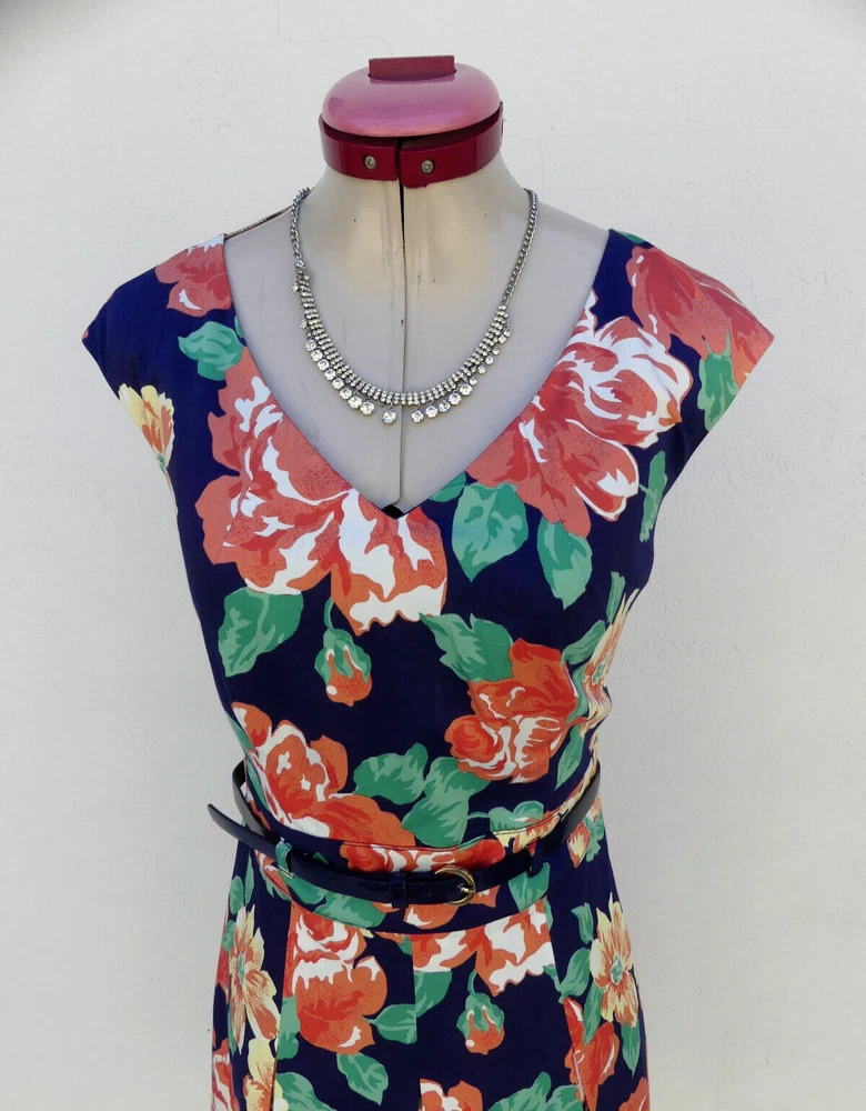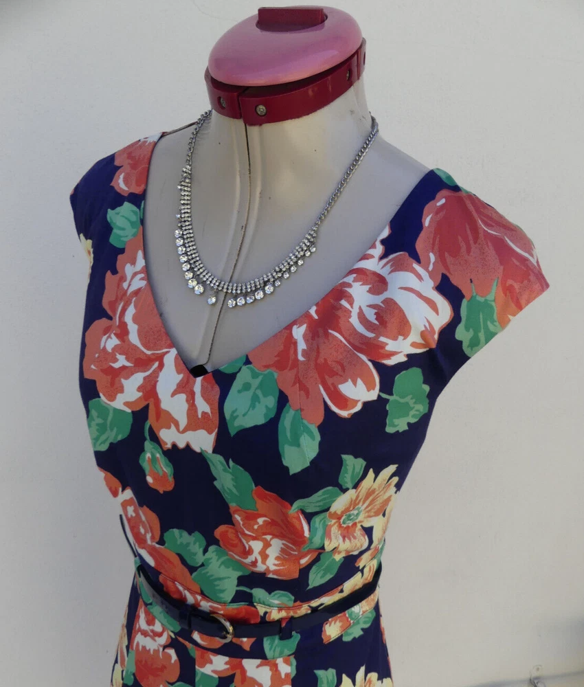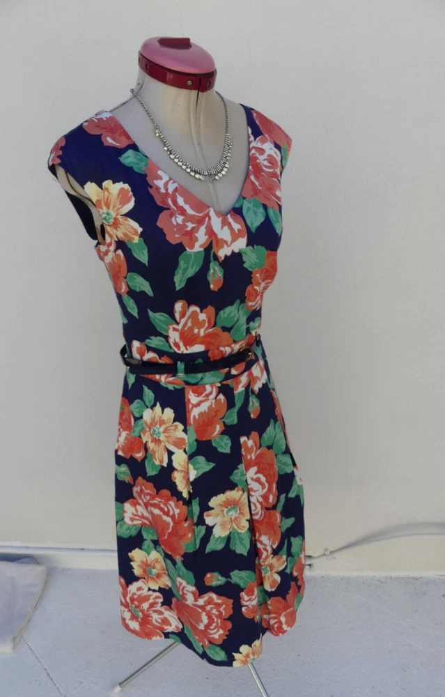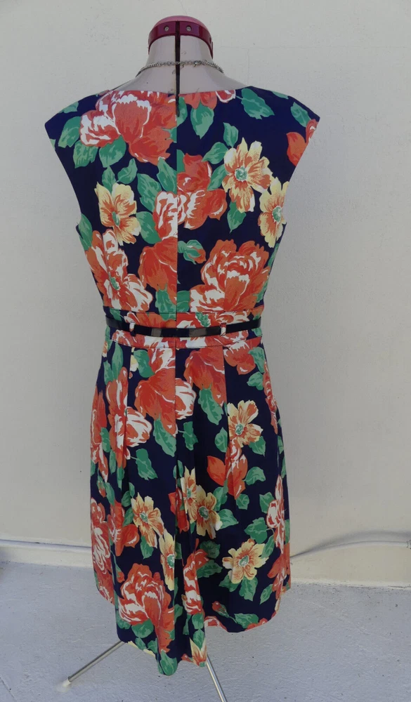 This gorgeous DRESS is sleeveless, with a v-neckline. It is fully lined and fastens with an invisible zip and hook & eye at the back. It is a Fit & Flare style, with a full, pleated skirt and comes with a matching navy blue belt with gold accents. It is navy blue, with a floral print in white, yellow, green, orange, peach and coral colours. It is from DIANA FERRARI and is a size 10, but please check the measurements below, to ensure a good fit. The approximate measurements are: Bust: 90cm Length: 95cm For any other measurements, please use the ‘Contact Seller’ button. It is in GOOD condition, with light wash/fade (it's not as dark as the photos have come out) and light pilling. Lots of other information about this fabulous dress can also be found in Item Specifics. DDD004 Please take a look at the tons of other gorgeous items I have available in your size! I love to combine postage and save you money! So if you are purchasing more than one item from me, please wait for me to send you a combined invoice, or press the 'Request a Total' button in your Cart before paying. I rate my items in the following way: BNWT / BNWOT: Brand New, With Tags or Brand New, Without Tags (some part of the tag will still be attached). New items that have never been worn. EXCELLENT: has been worn, but shows very few actual signs of wear. GOOD: has been worn and is showing light signs of wear. FAIR: has been worn and is showing more signs of wash/wear - or has a small fault, which will be clearly described in the listing I am only human and can make mistakes in my listings and descriptions - so if for any reason you are unhappy with your purchase, please contact me using the 'Contact Seller' button first, so we can quickly resolve the issue. This item comes from a SMOKE FREE HOME but the odd puppy hair may drift in due to the fact she is my darling shadow throughout the day.