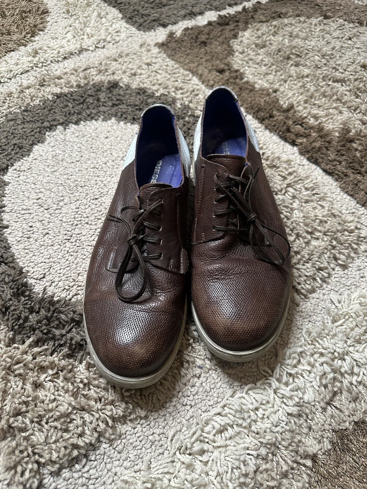 Elevate your style with these stunning brown color block oxfords from Diesel. Crafted with high-quality leather and designed in Italy, these shoes are perfect for the fashion-conscious man who wants to make a statement. The medium width and US shoe size 10 make them a comfortable fit for any occasion. These shoes are perfect for men who want to add a touch of sophistication to their wardrobe. The dark shade and perforated design add a unique touch that will make you stand out from the crowd. Whether you're dressing up for a formal event or just want to look sharp, these Diesel oxfords are the perfect choice.