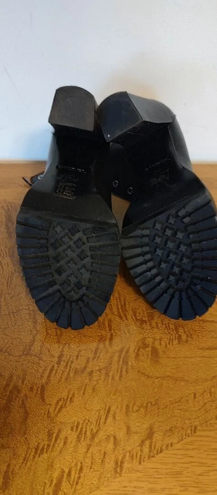 This gorgeous women's black leather platform ankle boot comes with leather buckled straps that can be used on the boots or not. Worn once for about 5 minutes but they didn't work for me since I have VERY difficult feet. 4.5" heel 2 sets of interchangeable buckle straps to place on the outside of the boot after lacing it up.