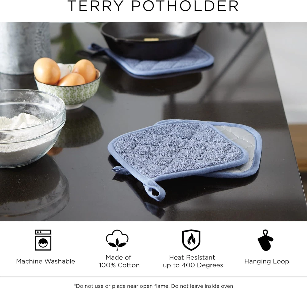 FOR YOU DII Basic Terry Collection Quilted 100% Cotton, Potholder, Blue, 3 Piece FEATURES Cotton QUALITY PRODUCT: Our pot holders and oven mitt sets are 100% cotton, quilted and padded adding durability and are heat resistant; Use to remove hot pots and pans from the oven, a baking dish from the microwave oven and cooking on your stove top HANGING LOOP FOR EASY ACCESS: Set of 3 pot holders, each measure 7 x 7 inch square; Use as hot pads for hot dishes, coffee pot, hot pot, cast iron or cooking pot. Protect counter tops from scratches, place mat under heavy cast iron set PROTECT YOU FROM HEAT: Heat resistant up to 400 degrees allowing safe removal of baking dishes and cast iron from the oven and hot pots from the stove; Stay safe - Do not use potholders or oven mitts in a hot oven or over an open flame GREAT GIFT CHOICE: Pot holders, hot pads and oven mitts are apartment essentials, make great hostess gifts, housewarming gifts and camping accessories; Pair with cooking utensils, kitchen utensil set and dish towels for a fun and thoughtful gift CARE TIPS: Pot holders and oven mitts are machine washable, durable and long lasting with daily use; Wash in Cold Water on Gentle Cycle & Tumble Dry Low; So many color options make coordination with kitchen accessories and dish towels easy and fun MORE DII KITCHEN POT HOLDERS OPTIONS - DII offers delightful Kitchen Linens including dishtowels, dish cloths, aprons, potholders and oven mitts, but for more options search: DII Pot holders or click the DII link at the top of the page to explore our other collection. DII offers full collections of trend based designs, bringing you fresh, innovative lines of quality home products for every season. Let DII products become a valuable part of your life. Item model number CAMZ75307 Global Trade Identification Number 00738215753076 Warranty Description Not applicable. Product Dimensions 7"L x 7"W Number of Pieces 3 Color Blue Brand DII Country of Origin China Shape Square Item Weight 4.8 ounces Batteries required No Outer Material Cotton Fill Material Cotton Manufacturer Excello Brio Refill Cotton Size Potholder Is Discontinued By Manufacturer No Fabric Type Cotton Product Care Instructions Machine Wash Colors Separately • Cold Water • Gentle Cycle • No Bleach • Tumble Dry Low Included Components Pot Holders 7.0 "w x 7.0 "w. Weight: 4.8 oz PAYMENT We accept all payments via Ebay using Credit Cards , PAYPAL , Apple Pay and many others SHIPPING We are always working hard to ensure your package arrives as soon as possible. Please understand that some factors like weather, high postal traffic, and the performance of shipping companies are outside of our control. DELIVERY & RETURN POLICY We offer a 30-Day Return Policy on items in which you are not completely satisfied with. You have the option of a full-refund or an exchange of the item. No returns are available on items shipped outside of the USA.