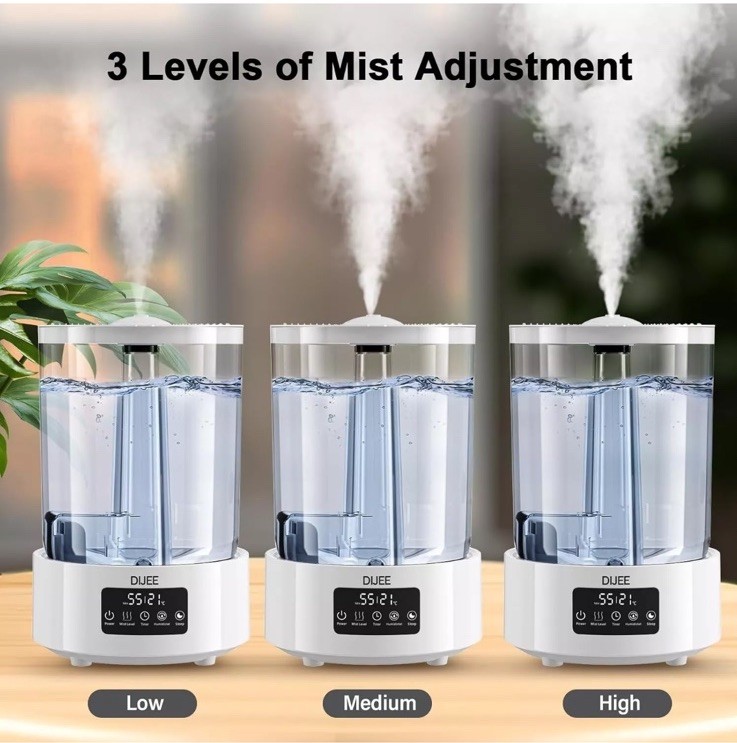 New item Open box just to verify product is complete The DIJEE Ultrasonic Smart Air Humidifier is a stylish and efficient tabletop humidifier with a large 5L tank capacity, perfect for use in the living room or bedroom. It offers cool mist humidification and includes features such as a digital display, remote control, and aroma diffuser for added convenience. The sleek white design and advanced technology make it a great addition to any home, providing a comfortable and healthier environment by improving indoor air quality.
