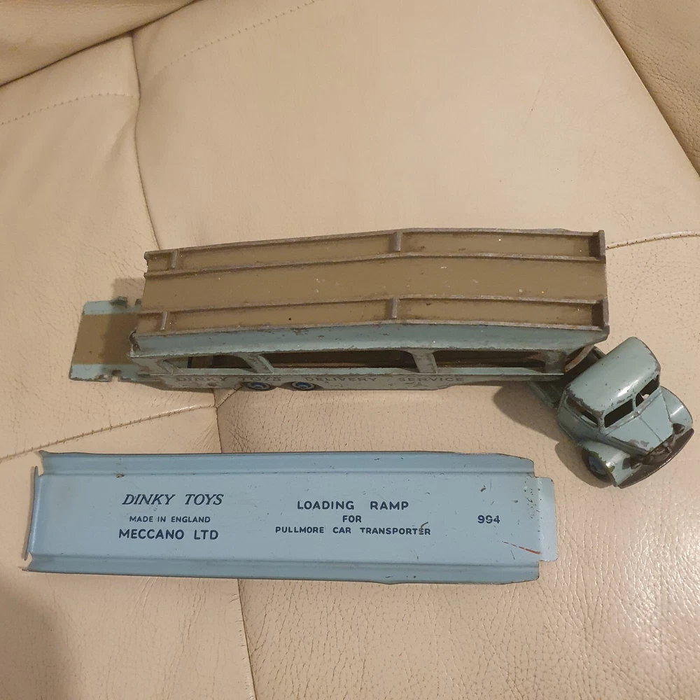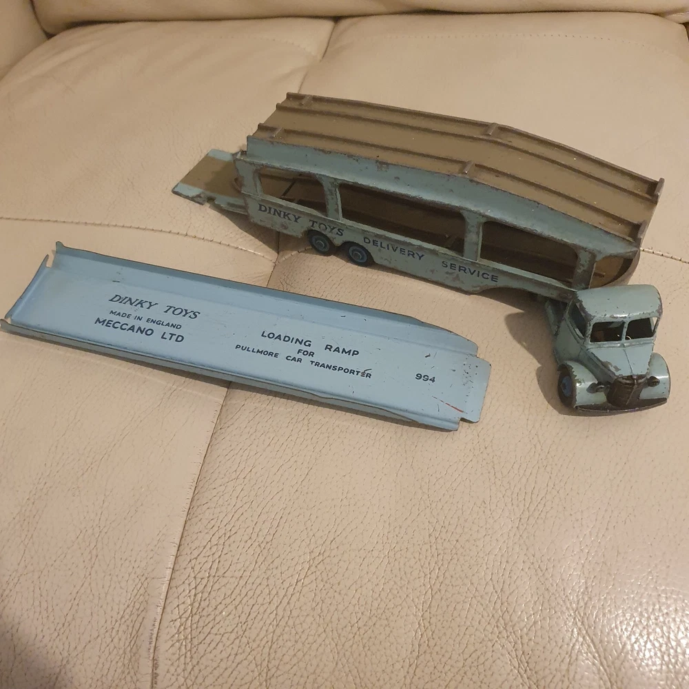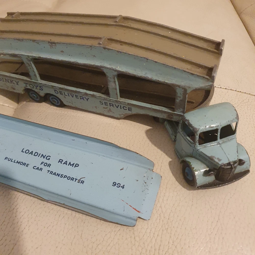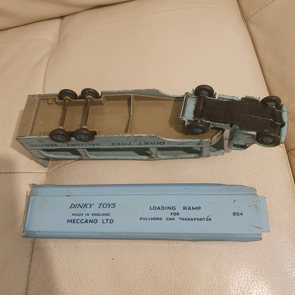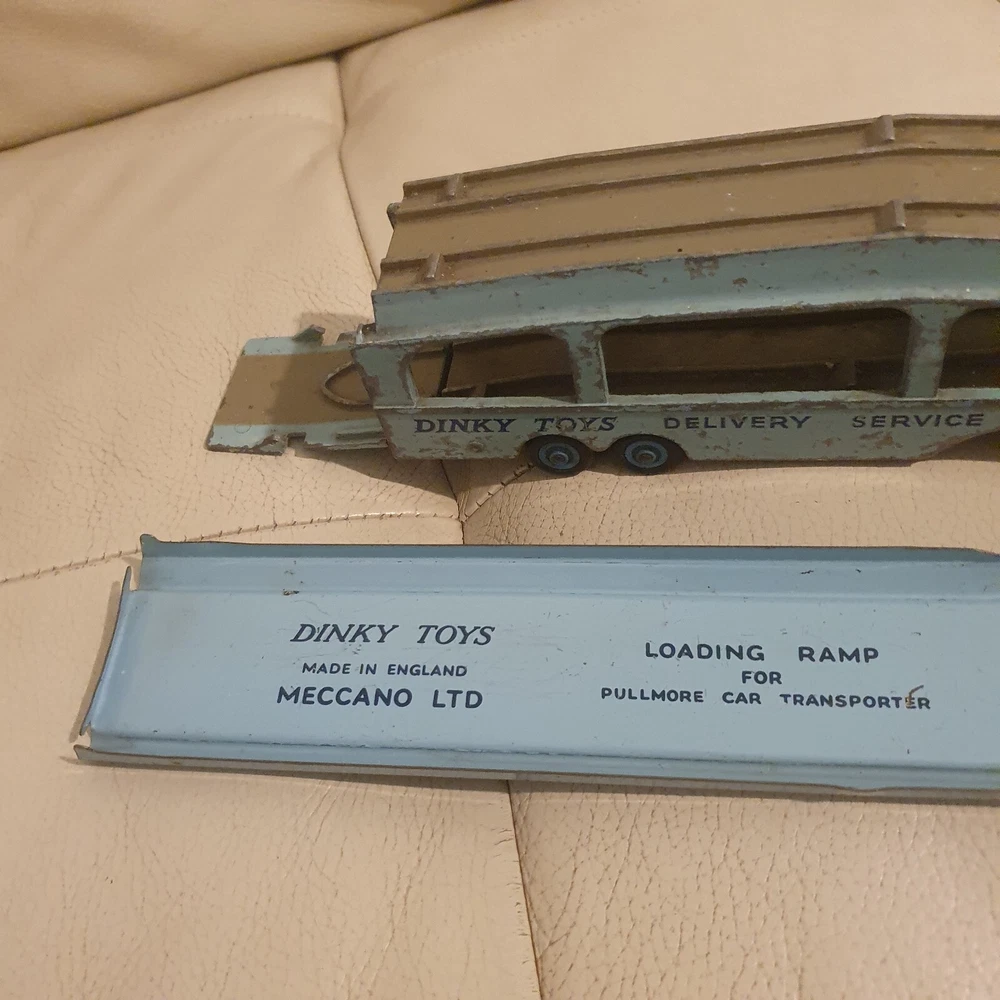 582 THE PULLMORE CAR TRANSPORTER ISSUED BETWEEN 1953-64. A VERY RARE VERSION OF THIS HIGHLY POPULAR DINKY SUPERTOYS. COMES COMPLETE WITH ORIGINAL LOADING RAMP . OVERALL THE MODEL IS IN VERY GOOD CONDITION FOR ITS AGE DISPLAYING SOME HANDLING/PAINT WEAR. PACKED WEIGHT 575gm