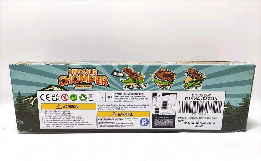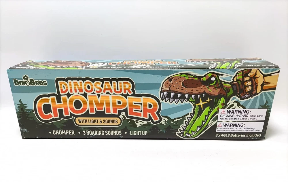 LIGHT AND SOUND EFFECTS: A 13.6 Inches dinosaur reacher grabber with light and sounds. Pull the handle on this T-Rex toy and the mouth snap, press the 3 sound button on the dino body to make 3 kind of prehistoric roaring sounds and light up. FUN DINOSAUR CHOMPER: This realistic dinosaur grabber toy is a fun way for kids to pick things up. A cool design dino toy inspire imagination and creative thinking, kids will enjoy playing this fun dinosaur snapper adventure game. BATTERIES INCLUDED: Each dinosaur pincher toy comes with 3 replaceable AG13 batteries. Ready to play when kids receive this dinosaur gift. Give these prehistoric dinsoaur toys to children who lover dinosaurs at a birthday party. DINSOAUR ADVENTURE: A dinosaur chomper toy that can help kids grab and pick up things. With the flashing light and 3 dinosaur sounds, children can play with other dino items together to build a fantastic dinosaur world. GREAT GIFT IDEA: Recommend dinosaur toy for boys and girls age 5 and up. dinosaur toy with sound makes a great party favor or a winning prize. Exciting party decoration, birthday gift, stocking stuffers, Christmas gift. Product Description Fun Dinosaur Chomper This realistic dinosaur chomper toy can help kids grab and pick up things. A cool design dino toy inspire imagination and creative thinking, kids will enjoy playing this fun dinosaur adventure game Light and Sounds Effects with light and sounds. Pull the handle on this T-Rex toy and the mouth snap, press the 3 sound button on the dino body to make 3 kind of prehistoric roaring sounds and light up. Great Gift Idea Kids can play with other dino items to build a fantastic Jurassic dinosaur world.Recommend dinosaur toy for boys and girls age 5 and up.Great party favor, winning prize,birthday, stocking stuffers, Christmas gift and so on. BATTERY INSTRUCTION 1. The Dinosaurs Chomper Toy is equipped with 3 non-rechargeable AG13(LR44) 1.5V button batteries, and the dinosaur chomper batteries can be reinstalled if it is dead. 2. Do not mix different types of batteries, only use AG13(LR44) 1.5V button batteries. 3. If the battery is out of power, use a screwdriver to open the battery cover and change three AG13(LR44) 1.5V button batteries, throw the dead battery into the waste battery recycling bin. 4. Due to the long transportation time, we have made battery isolation contacts for battery power loss. After receiving the product, please remove the isolation strip at the bottom, and you can play happily 5. Lease insert the isolation strip when not in use to keep the power lasting.