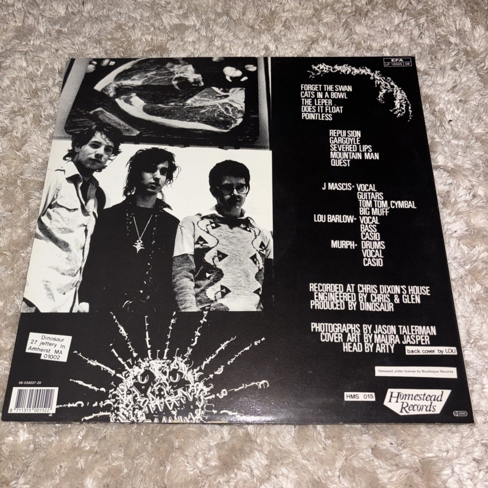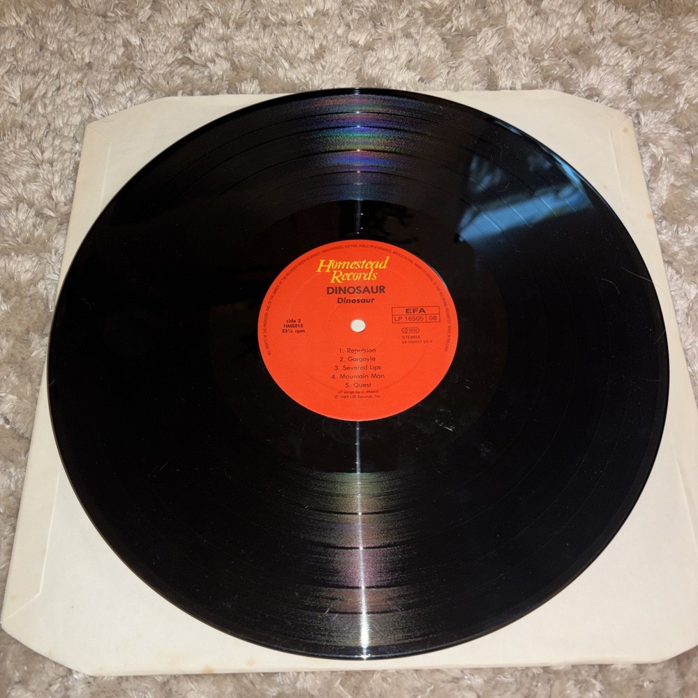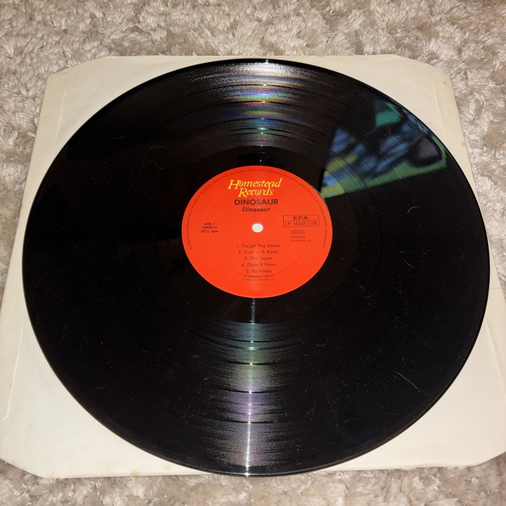 Likely early 80s due to forget the swan being the first song. This product is a vinyl LP pressing of Dinosaur Jr.'s self-titled album "Dinosaur" released in 1985 on Homestead Records. The record is a 33 RPM format, housed in a cardboard sleeve, and is in excellent condition. The album features a mix of indie, grunge, alternative, rock, and punk genres, reflecting the early days of the band's career. This pressing is a rare find for fans of Dinosaur Jr. and collectors of vintage vinyl records.