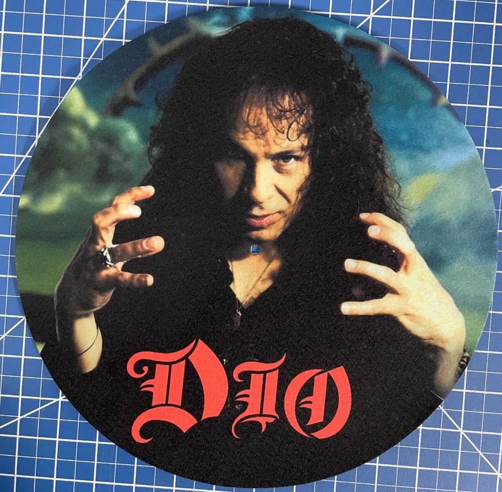 This is a DIO - Ronnie James Dio slipmat designed for 12-inch vinyl record players. It is compatible with any turntable model, made of polyester material, and has a thickness of 1/16 inch. The slipmat features a multicolor design and has a diameter of 11.75 inches. It is suitable for DJs and music enthusiasts looking to add a heavy metal touch to their vinyl spinning setup.
