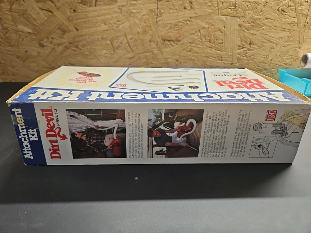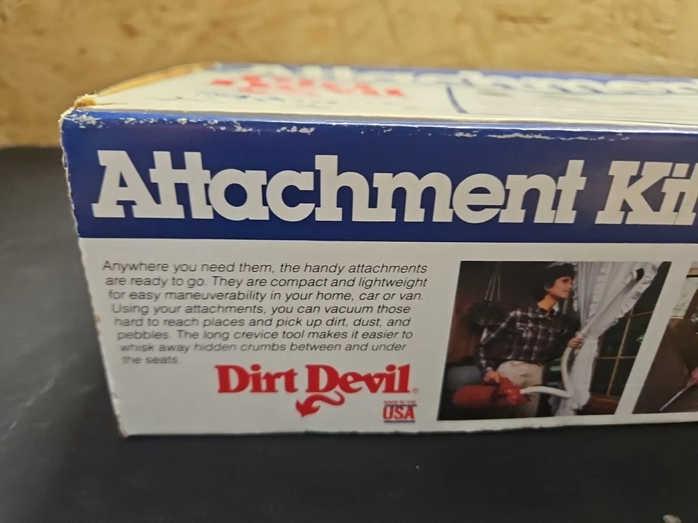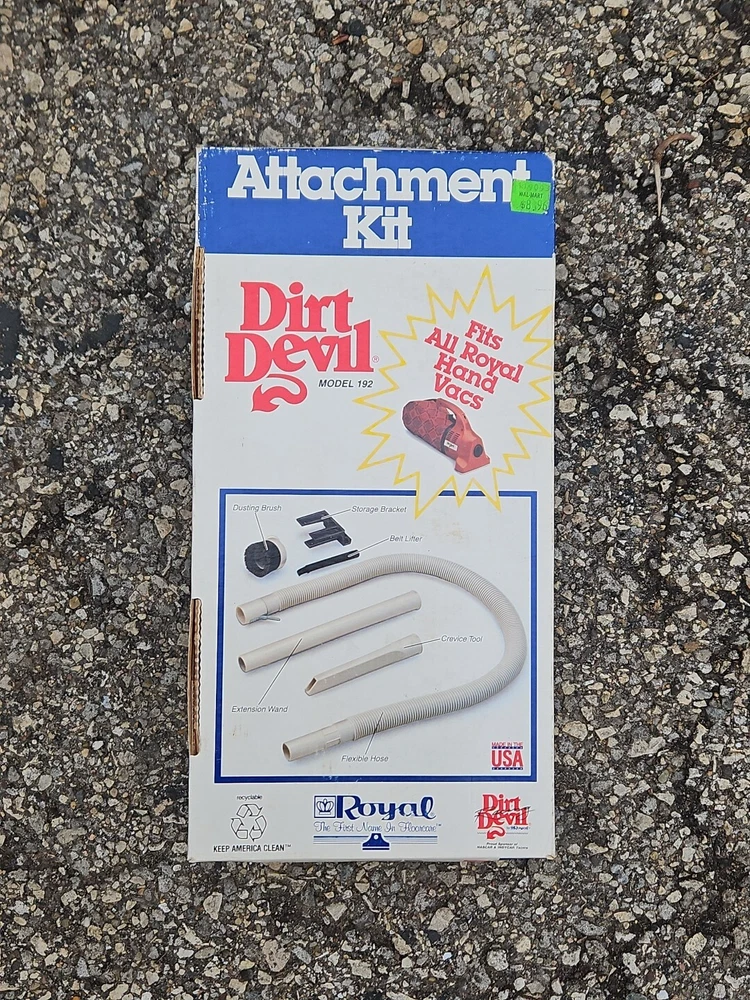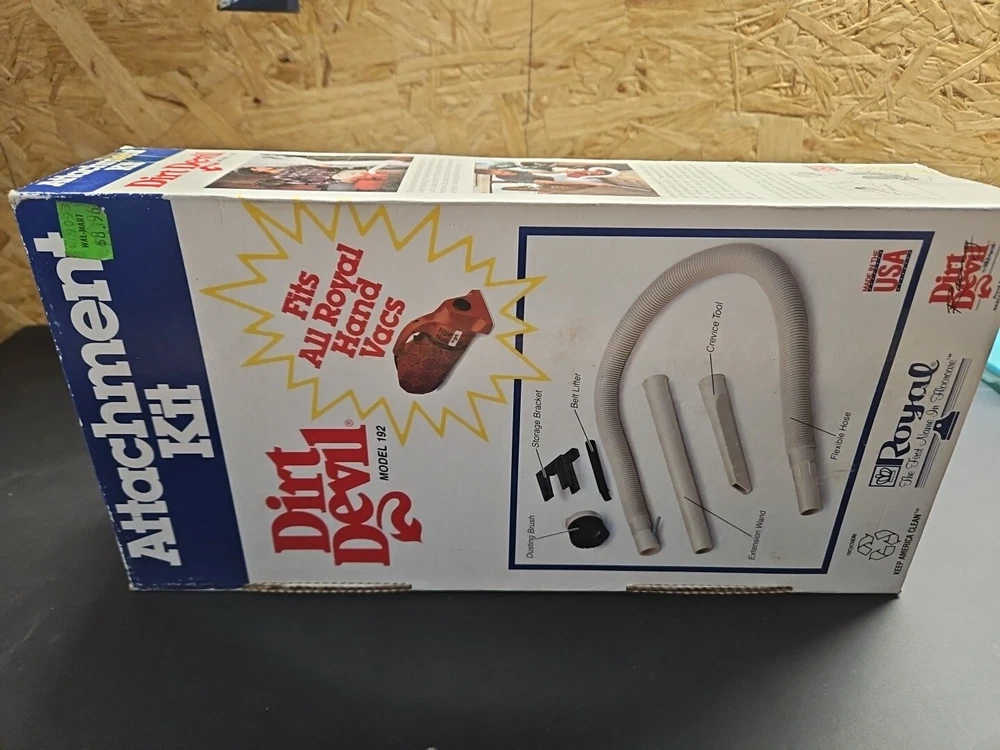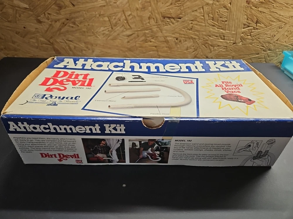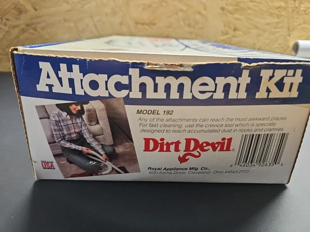 DIRT DEVIL ATTACHMENT KIT Model Number 192 Fits All Royal Hand Vacs Brands Original box. 4 piece attachment kit. See pictures. Flexible hose over 40" long, dusting brush, crevice tool, extension wand. See pictures. Product will be shipped timely and packaged with care. Offers are encouraged. Please feel free to reach out with questions. Please see pictures. Thank you. Good used condition. Light wear from age and use. Markings from age and use. See pictures This Dirt Devil Attachment Kit, model number 192, is compatible with Royal hand vacuums. The set includes four items: brush head/tool attachments designed for handheld use. The kit is lightweight and compact, suitable for various cleaning tasks. It is designed for electric corded power source and is in white color. BS2