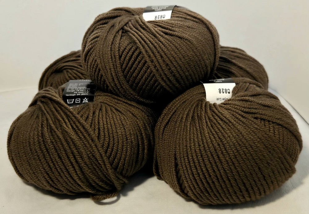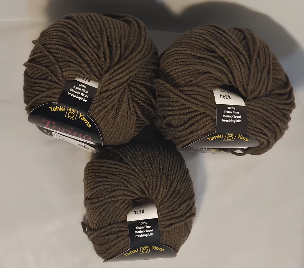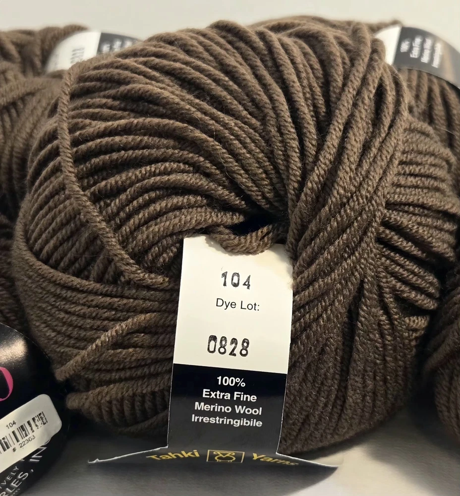 This lot features the highly sought-after, discontinued Tahki Yarns Torino, a luxury Italian merino wool. Perfect for high-quality garments and accessories. Known for its exceptional softness, luxurious feel, and machine-washable properties, Tahki Torino is a favorite for durable garments with great stitch definition. Since it is a discontinued luxury line, this quantity is hard to find. YARN DETAILS: ▪︎Origin - Made in Italy ▪︎Yarn Weight - # 4 Medium / Aran Weight ▪︎Fiber - 100% Extra Fine Merino Wool (Superwash) ▪︎Color - #108 "Chocolate" ▪︎Dye Lot - #0828 Quantity 5 x 50g Skeins ▪︎Skein Yardage - 94 yards | 86 meters (470 yards total) ▪︎Skein Weight - 50 grams (250 grams total) ▪︎Needle - US 8 (5 mm) ▪︎Gauge - 18 sts This rare lot of 5 skeins remains in its original labeling and unused. It has been stored away from all elements in a smoke-free, pet-free, and fragrance-free home. Don't miss out on this rare, high-quality Italian yarn!