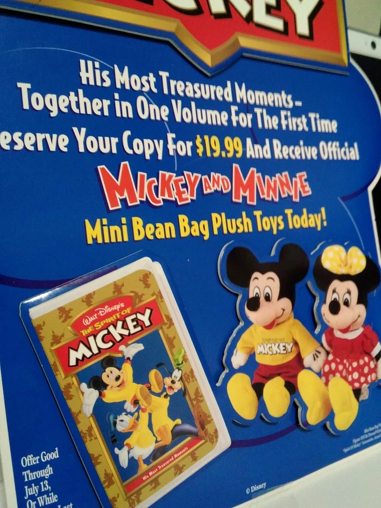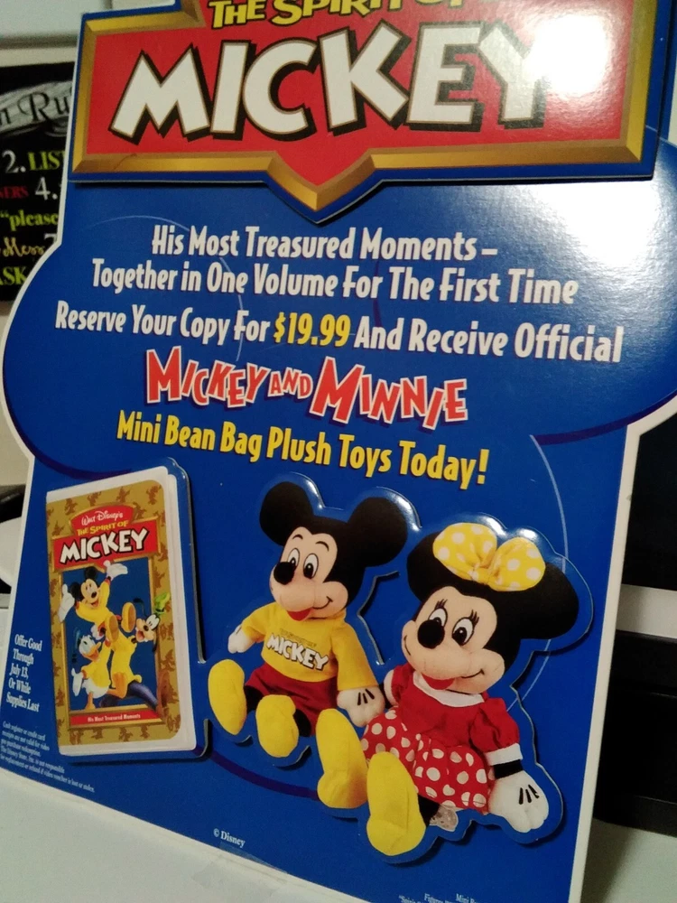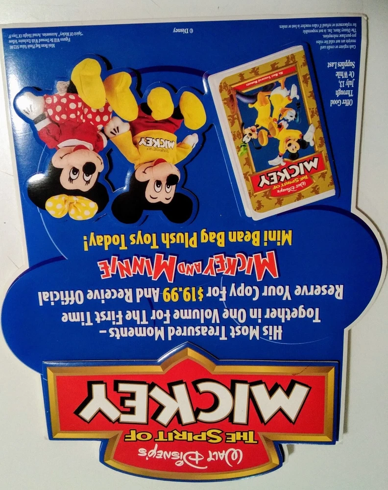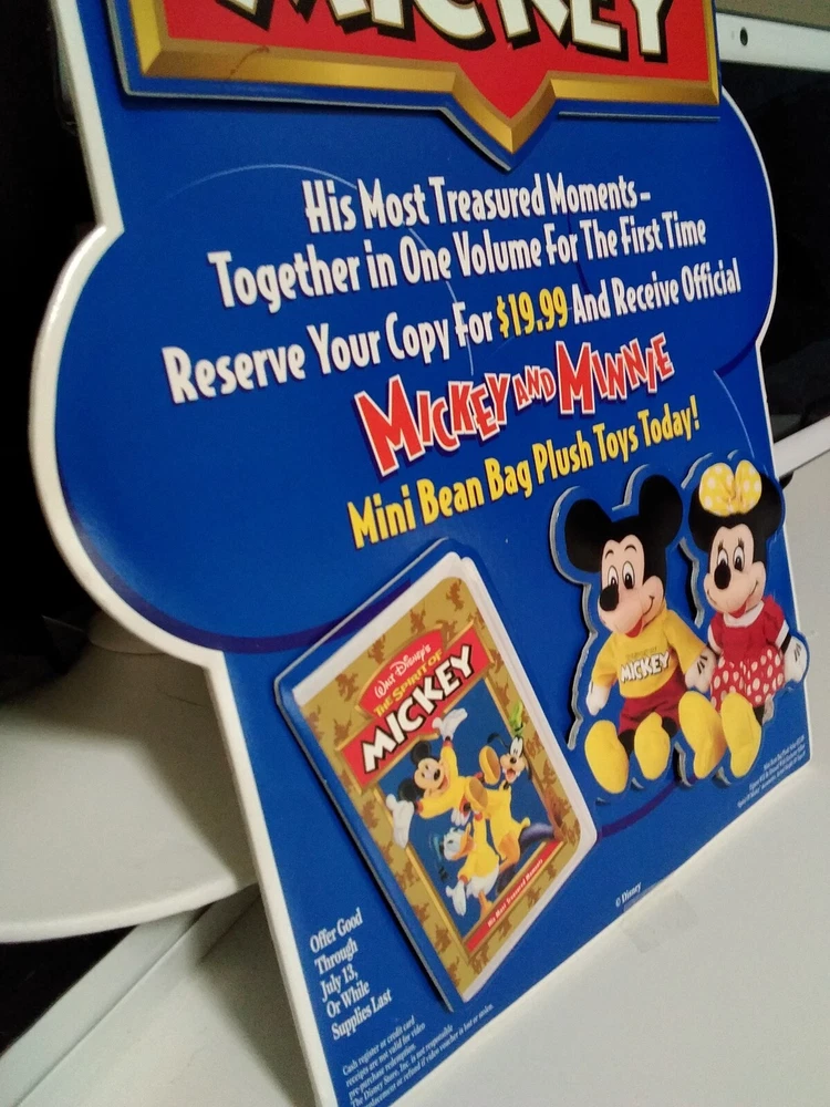 THIS IS A VINTAGE 1990S DISNEY STORE PROMOTIONAL ADVERTISEMENT FEATURING MICKEY MOUSE IN BEAUTIFUL COLORS AND IN 2- D. IN MINT PERFECT CONDITION. THIS PROMOTIONAL BOARD WAS NEVER USED AND THE BACK STAND PROP WAS NEVER OPENED. SUPER RARE TO FIND A DISNEY STORE PROMOTIONAL ADVERTISEMENT AND IN THIS PRISTINE CONDITION ALMOST NEVER HEARD OF. ADD THIS COLORFUL DISNEY ADVERTISEMENT TO YOUR COLLECTION TODAY. THIS BOARD IS 13 INCHES HIGH AND 10 INCHES WIDE AND HAS THE 2- D DIMENSIONAL ASPECT WHICH MAKES IT EVEN MORE UNIQUE.