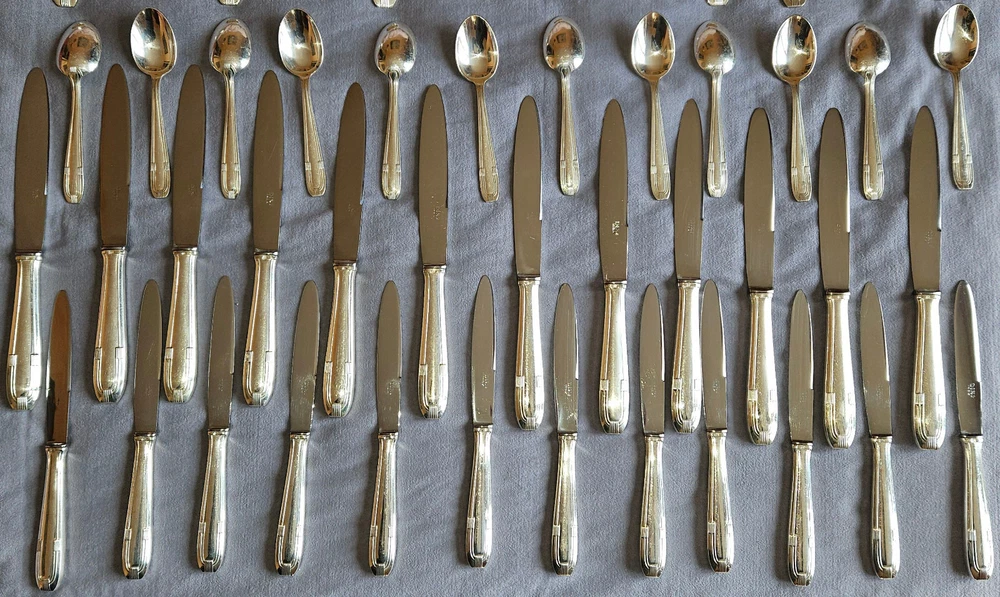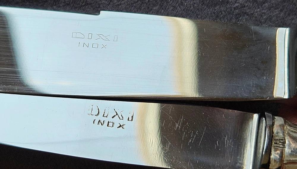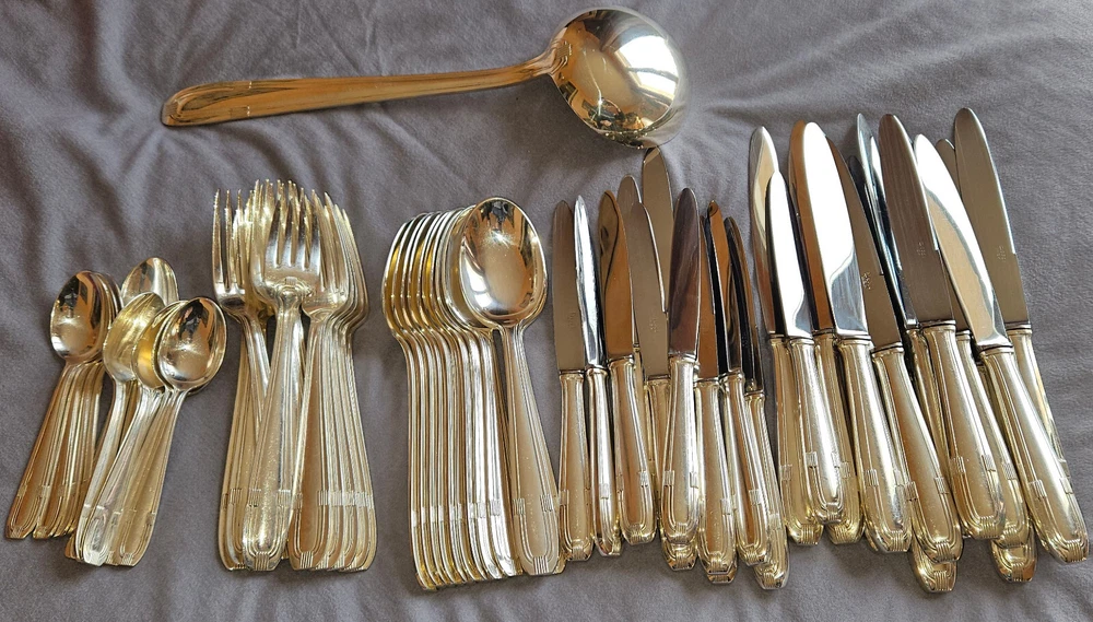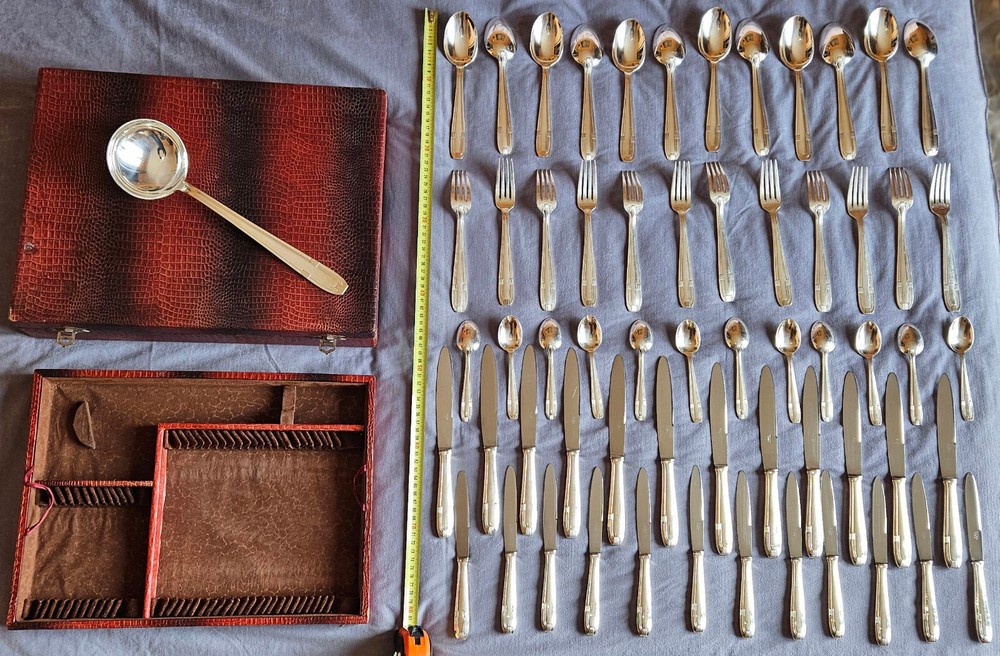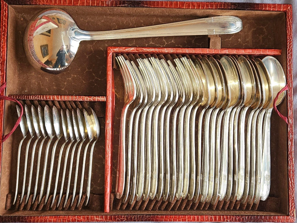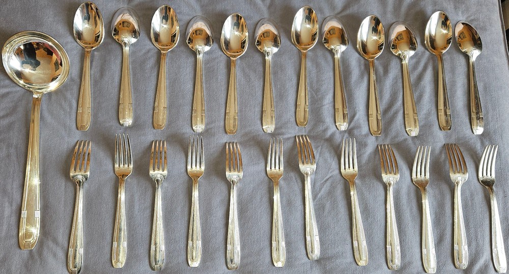 Tous mes objets sont soit des objets anciens de brocante ou antiquités, soit des objets d’occasion plus ou moins récents. A ce titre, ils ont des marques du temps et d’usage que j’essaye de signaler au mieux en mettant plusieurs photos et en décrivant l’objet. Je vous demande donc par avance de bien lire le descriptif et regarder les photos qui font partie de la description des objets. Si vous avez besoin d’informations ou de photos complémentaires, n’hésitez pas à m’écrire suffisamment tôt avant la fin de la vente pour demander des précisions , en me laissant votre adresse e-mail pour la réponse et l’envoi de photos complémentaires. Objet N° : 9683 Maison d'Orfèvrerie DIXI : Ménagère en métal argenté composée de 61 pièces d'un très élégant modèle art déco présentée dans son coffret d'origine. Bon état d’argenture avec micro-rayures habituelles et normales sur du métal argenté qui a été utilisé, cette ménagère a été très bien entretenue. Composition de la ménagère : * 12 Couteaux de Table : Poinçon " 18 G - DIXI " Lames marquées " DIXI INOX " Longueur : 24,5 cm environ. Poids d'1 : +/- 95 grammes environ. * 12 Couteaux à fromage : Poinçon " 12 G - DIXI " Lames marquées " DIXI INOX " Longueur : 20,5 cm environ. Poids d'1 : +/- 54 grammes environ. * 12 Fourchettes de Table : Poinçons " COUVERTS DIXI " et " 100 G - DIXI " Longueur : 19,8 cm environ. Poids d'1 : +/- 82 grammes environ. * 12 Cuillères à soupe : Poinçons " COUVERTS DIXI " et " 100 G - DIXI " Longueur : 20,2 cm environ. Poids d'1 : +/- 90 grammes environ. * 12 Cuillères à café / dessert : Poinçons " COUVERTS DIXI " et " 24 G - DIXI " Longueur : 13,5 cm environ. Poids d'1 : +/- 33 grammes environ. * 1 Louche à potage : Poinçon " 12 G - DIXI " Longueur : 31,5 cm environ. Poids : 278 grammes environ. Poids Total Coffret garni : +/- 6.850 grammes environ. Un envoi de plusieurs objets groupés dans un même colis est envisageable dans le monde entier si le montant de la commande est suffisamment important et si le colis est réalisable (selon poids et dimensions), n’hésitez pas à me contacter si vous désirez acheter plusieurs lots en m’indiquant les références pour une étude personnalisée. N’hésitez pas à consulter ma boutique et tous mes objets en vente !