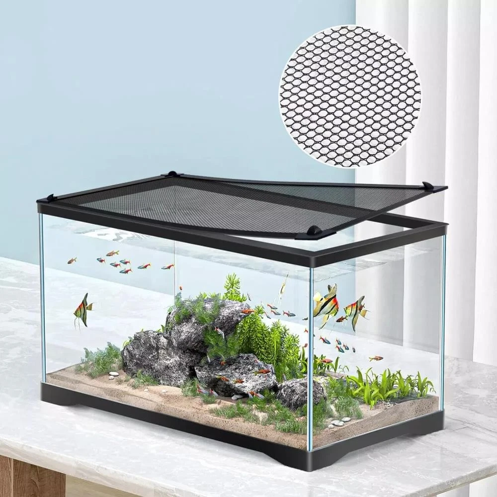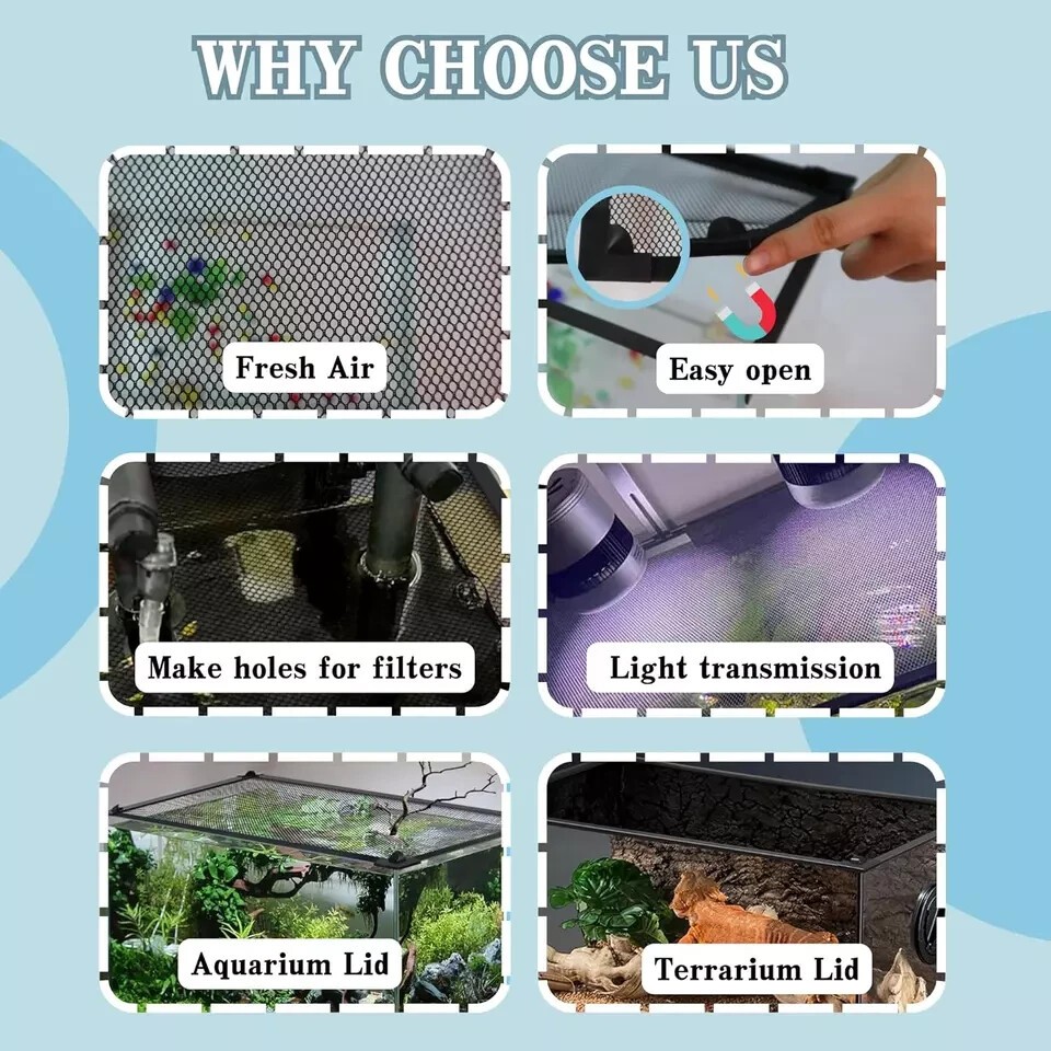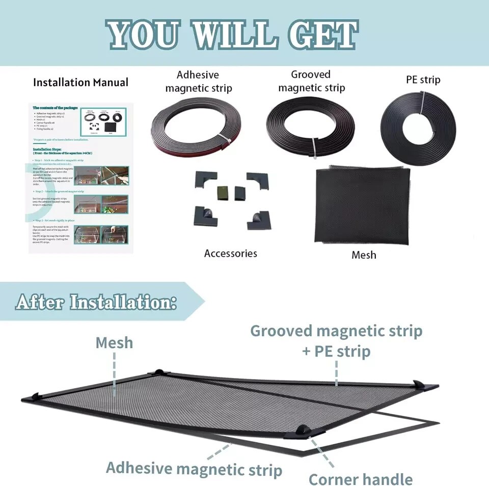 The Magnetic Fish Tank Lid is an emerging product that prevents fish from jumping out of the tank, prevents reptiles from escaping without harming them, and is suitable for use with a wide range of animals and tanks. 【Perfect Fit Aquarium Size】 Compared with traditional aquarium lid, our DIY lid is not only suitable for square tanks (29 gallon, 20gallon, 10 gallon, and other square aquariums less than 36" x 18"), but also can be used for non-standard size, round and curved fish tanks, the strips are very soft and bendable, the mesh can be cut, you can cover the different shapes of tanks on top. 【High Quality Netting】The netting is strong, corrosion-resistant, and can withstand the high temperature of the heating lamp; 5mm hole, is large enough to ventilate, and pets can get air circulation. 【Special Magnetic Design】 Strong magnetic suction, infinite switch, quick to open. The switch is soundless, will not scare the pets. With pull handle design, easy to open and close, easy to feed. 【Flexible Installation】Two kinds of installation methods: front installation -- the thickness of aquarium > 6 mm; side installation -- unlimited thickness, curved aquariums, shaped aquarium and so on.In addition, the mesh can be cut to install the filter air pump. Product Description Magnetic fish tank lid is a product that prevents fish from jumping out of the tank and reptiles from escaping without harming them, suitable for all kinds of animals and fish tanks. Compared with traditional fish tank covers (iron mesh, plastic, glass, etc.), our DIY fish tank cover is not only suitable for square fish tanks (29 gallon, 20gallon, 10 gallon, etc. less than 36" x 18" square fish tank), but also can be used for non-standard sizes of fish tanks, round, curved fish tanks. The magnetic and PE strips are very soft and can be bent, and the mesh can be cut, you can cover on top of different shapes of fish tanks, with very strong practicality. The cover mesh is made of high quality polyester fiber, soft and durable, won't hurt the fish jumping up, the mesh hole is big enough, not only good ventilation, but also allows the fish bait to pass through directly, easy to feed, the mesh can also be cut to allow filters, greenery to pass through, it is both beautiful and practical. On Aug 18, 2025 at 08:06:16 PDT, seller added the following information: