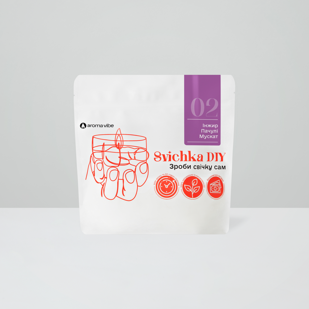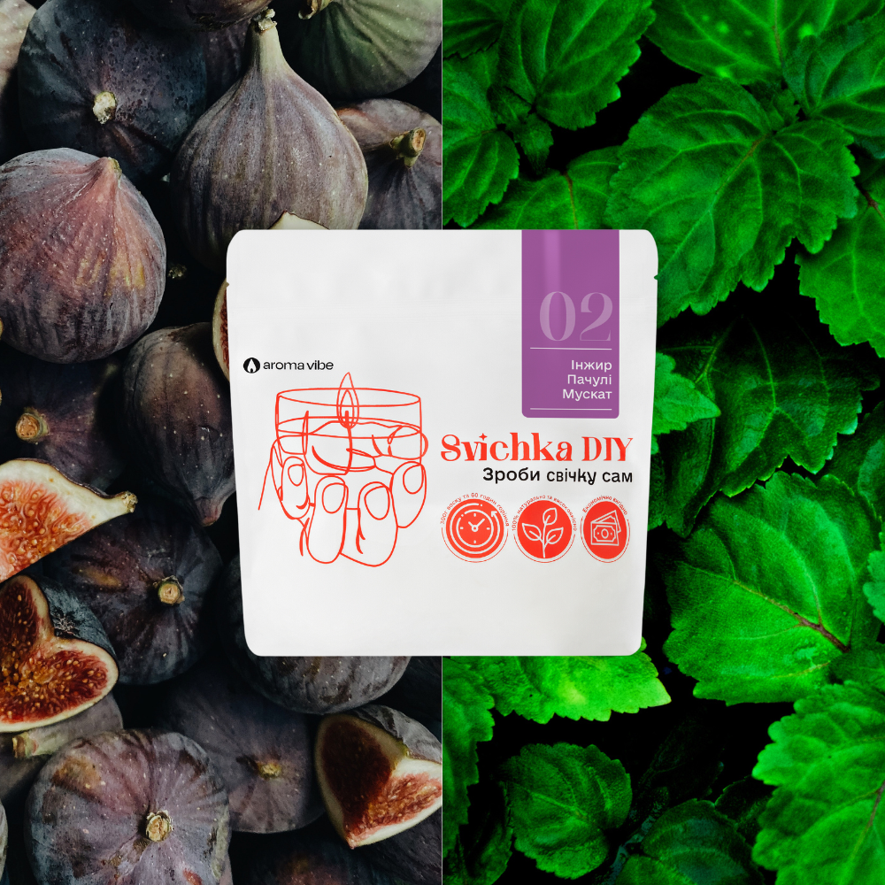Create Your Own Scented Candle: DIY Candle Kit with Natural Soy Wax, Fig Patchouli & Nutmeg On the streets of a quiet Mediterranean village, figs that have fallen from overripeness grind in the sun on stone roads. The wind from the sea mixes these heavy-sweet aromas with the tart freshness of patchouli bushes and musky tones of grapes. Fig scented candle. Patchouli candle. Nutmeg candle. Make your own candle kit In color solutions: white, green, olive, purple Space: living room, office, lobby, car interior Atmosphere : balance, confidence, leisure, calm Family: tree Notes: ripe figs, patchouli flowers, nutmeg Sweetness: ★★☆ Astringency: ★★☆ Freshness: ★★☆ Composition of the set 300 grams (10.5 ounces) of natural soy wax Cotton wick Centering rod Naturally DIY candle kit 300 grams (10.5 ounces) of natural, ecological soy-based wax with safe aromas and essential oils. Without parabens, paraffin and phthalates. A true perfume Perfumed aroma filling made in France. Smells like the best candle you could find anywhere. No apples and strawberries from China. Ecologically 100% recyclable packaging. The candle does not leave behind anything that can harm nature. Use and safety techniques Burning time is approximately 60 hours Cut the wick to a length of 0.5 cm (0,19 inch) before each smoking Never leave a lit candle unattended Avoid drafts and contact of the candle with flammable materials Keep away from small children and pets The recommended burning time is not less than 1 hour and not more than 4 hours in a row Soy wax We use exactly 100% soy wax. This wax is clean and safe for your health. It also provides the best aroma output and long-lasting burning. High-quality aroma oils The candles you make will not differ in aroma from the highest quality candles on the market. In addition, aroma oils are certified and do not contain parabens, phthalates and other harmful chemicals. Made in Ukraine Each set is made by hand in Kyiv with pride and care. Create comfort with your own hands You will be amazed by the quality of the candles that you will get, because we have developed a very high-quality mixture of soy wax and natural aroma oil on a par with premium candles of the highest quality. DIY Candle is a candle refill . Inside the package, you'll find everything you need to create a candle: pre-scented soy wax , a wick, and a stick to center the wick in your future candle. To make your own candle, you only need our kit, a container, a microwave or a pot of water, and 5 minutes Make candles as easy as one, two, three... Heat the bag in the microwave for 2.5 minutes. Pour the melted wax into your favorite container. Let the wax harden, trim the wick, and enjoy the fresh scent. How to choose a capacity: They fit Glazed ceramics Strong glass Soldered metal cans Enamel products Non-flammable glasses Do not fit Porous ceramics. For example, terracotta Wood, coconut shells, plastic All flammable materials Can't hold water Dimensions DIY candle kit We recommend using containers no larger than 10 cm (5.39 inches) in diameter, because this is how the wick is calculated. The set includes a 12 cm (6.47 inch) long wick, so the capacity should not be higher than 11.5 cm (6.20 inch) Frequently asked questions (FAQ) DIY candle kit Where can I find a wick and a wick holder? Everything in the package! Yes, everything goes together and in order to make a candle you don't need anything except the DIY Candle package How should I choose a glass? It must be a leak-proof glass with a diameter of up to (10 cm 5.39 inch). Can I make a candle without a microwave? Yes, you can put the DIY Candle package in a pot of water. The package should stand upright over medium heat until the wax in it is completely melted. It takes different time from 8 to 15 minutes depending on your stove and pot. How many candles can be made from one set? Contains 300 grams (10.5 ounces) of wax. This is definitely enough for almost any candle you can find at home. But there is only 1 wick in the set, so if you have wax left after you make a candle, you can order more wicks and make more!