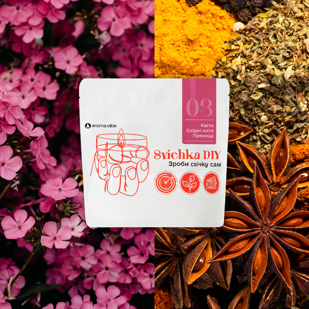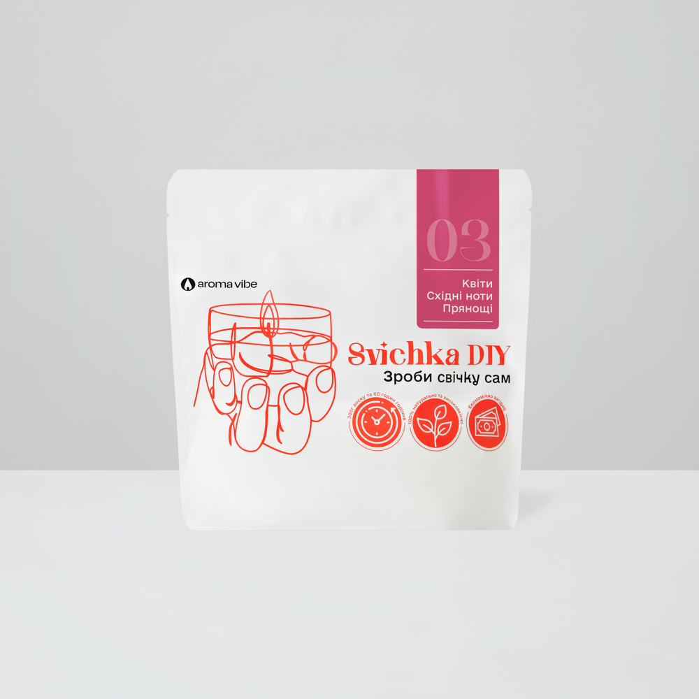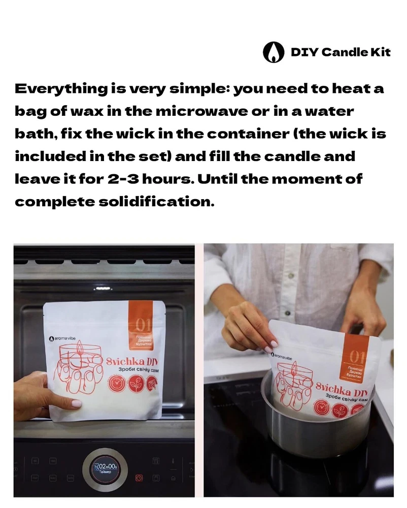 Create Your Own Scented Candle: DIY Candle Kit with Natural Soy Wax, Flowers, Eastern Notes & Spices Imagine relaxing in a greenhouse filled with bright flowers that saturate the air with the light sweetness and mystery of the East. In color solutions: pink, purple, orange Space: bedroom, living room, bathroom, building, jewelry store, beauty salon Atmosphere : luxury, sophistication, romance, mystery Family: flowers Notes: flowers, strawberry, powder Sweetness: ★★☆ Tolerance: ★☆☆ Freshness: ★☆☆ Composition of the set 300 grams (10.5 ounces) of natural soy wax Cotton wick Centering rod Naturally DIY candle kit 300 grams (10.5 ounces) of natural, ecological soy-based wax with safe aromas and essential oils. Without parabens, paraffin and phthalates. A true perfume Perfumed aroma filling made in France. Smells like the best candle you could find anywhere. No apples and strawberries from China. Ecologically 100% recyclable packaging. The candle does not leave behind anything that can harm nature. Use and safety techniques Burning time is approximately 60 hours Cut the wick to a length of 0.5 cm (0,19 inch) before each smoking Never leave a lit candle unattended Avoid drafts and contact of the candle with flammable materials Keep away from small children and pets The recommended burning time is not less than 1 hour and not more than 4 hours in a row Soy wax We use exactly 100% soy wax. This wax is clean and safe for your health. It also provides the best aroma output and long-lasting burning. High-quality aroma oils The candles you make will not differ in aroma from the highest quality candles on the market. In addition, aroma oils are certified and do not contain parabens, phthalates and other harmful chemicals. Made in Ukraine Each set is made by hand in Kyiv with pride and care. Create comfort with your own hands You will be amazed by the quality of the candles that you will get, because we have developed a very high-quality mixture of soy wax and natural aroma oil on a par with premium candles of the highest quality. DIY Candle is a candle refill . Inside the package, you'll find everything you need to create a candle: pre-scented soy wax , a wick, and a stick to center the wick in your future candle. To make your own candle, you only need our kit, a container, a microwave or a pot of water, and 5 minutes Make candles as easy as one, two, three... Heat the bag in the microwave for 2.5 minutes. Pour the melted wax into your favorite container. Let the wax harden, trim the wick, and enjoy the fresh scent. How to choose a capacity: They fit Glazed ceramics Strong glass Soldered metal cans Enamel products Non-flammable glasses Do not fit Porous ceramics. For example, terracotta Wood, coconut shells, plastic All flammable materials Can't hold water Dimensions DIY candle kit We recommend using containers no larger than 10 cm (5.39 inches) in diameter, because this is how the wick is calculated. The set includes a 12 cm (6.47 inch) long wick, so the capacity should not be higher than 11.5 cm (6.20 inch) Frequently asked questions (FAQ) DIY candle kit Where can I find a wick and a wick holder? Everything in the package! Yes, everything goes together and in order to make a candle you don't need anything except the DIY Candle package How should I choose a glass? It must be a leak-proof glass with a diameter of up to (10 cm 5.39 inch). Can I make a candle without a microwave? Yes, you can put the DIY Candle package in a pot of water. The package should stand upright over medium heat until the wax in it is completely melted. It takes different time from 8 to 15 minutes depending on your stove and pot. How many candles can be made from one set? Contains 300 grams (10.5 ounces) of wax. This is definitely enough for almost any candle you can find at home. But there is only 1 wick in the set, so if you have wax left after you make a candle, you can order more wicks and make more!