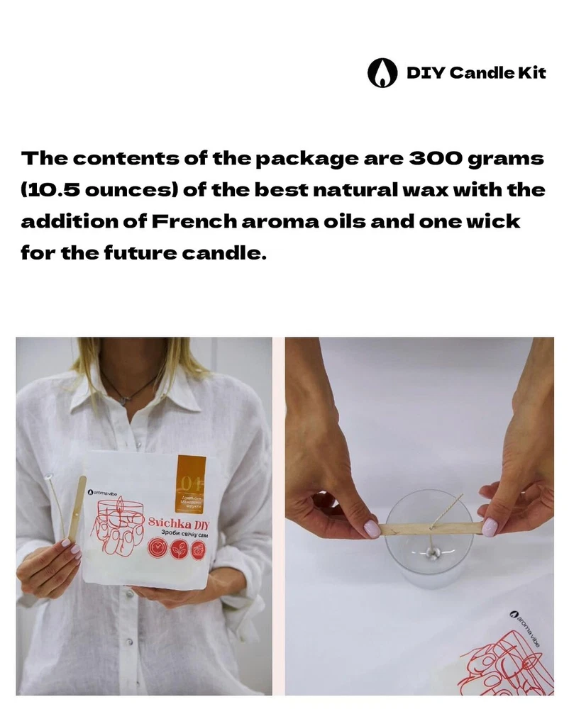 Create Your Own Scented Candle: DIY Candle Kit with Natural Soy Wax, Grapefruit, Apricot & Freshness Citrus aroma with notes of grapefruit and ripe apricot. DIY candle making kit. Natural soy wax candles. Grapefruit scented candle. Apricot candle. Fresh scented candle. Handmade candles kit Family: tree Notes: ripe figs, patchouli flowers, nutmeg Sweetness: ★★☆ Astringency: ★★☆ Freshness: ★★☆ Composition of the set 300 grams (10.5 ounces) of natural soy wax Cotton wick Centering rod Naturally DIY candle kit 300 grams (10.5 ounces) of natural, ecological soy-based wax with safe aromas and essential oils. Without parabens, paraffin and phthalates. A true perfume Perfumed aroma filling made in France. Smells like the best candle you could find anywhere. No apples and strawberries from China. Ecologically 100% recyclable packaging. The candle does not leave behind anything that can harm nature. Use and safety techniques Burning time is approximately 60 hours Cut the wick to a length of 0.5 cm (0,19 inch) before each smoking Never leave a lit candle unattended Avoid drafts and contact of the candle with flammable materials Keep away from small children and pets The recommended burning time is not less than 1 hour and not more than 4 hours in a row Soy wax We use exactly 100% soy wax. This wax is clean and safe for your health. It also provides the best aroma output and long-lasting burning. High-quality aroma oils The candles you make will not differ in aroma from the highest quality candles on the market. In addition, aroma oils are certified and do not contain parabens, phthalates and other harmful chemicals. Made in Ukraine Each set is made by hand in Kyiv with pride and care. Create comfort with your own hands You will be amazed by the quality of the candles that you will get, because we have developed a very high-quality mixture of soy wax and natural aroma oil on a par with premium candles of the highest quality. DIY Candle is a candle refill . Inside the package, you'll find everything you need to create a candle: pre-scented soy wax , a wick, and a stick to center the wick in your future candle. To make your own candle, you only need our kit, a container, a microwave or a pot of water, and 5 minutes Make candles as easy as one, two, three... Heat the bag in the microwave for 2.5 minutes. Pour the melted wax into your favorite container. Let the wax harden, trim the wick, and enjoy the fresh scent. How to choose a capacity: They fit Glazed ceramics Strong glass Soldered metal cans Enamel products Non-flammable glasses Do not fit Porous ceramics. For example, terracotta Wood, coconut shells, plastic All flammable materials Can't hold water Dimensions DIY candle kit We recommend using containers no larger than 10 cm (5.39 inches) in diameter, because this is how the wick is calculated. The set includes a 12 cm (6.47 inch) long wick, so the capacity should not be higher than 11.5 cm (6.20 inch) Frequently asked questions (FAQ) DIY candle kit Where can I find a wick and a wick holder? Everything in the package! Yes, everything goes together and in order to make a candle you don't need anything except the DIY Candle package How should I choose a glass? It must be a leak-proof glass with a diameter of up to (10 cm 5.39 inch). Can I make a candle without a microwave? Yes, you can put the DIY Candle package in a pot of water. The package should stand upright over medium heat until the wax in it is completely melted. It takes different time from 8 to 15 minutes depending on your stove and pot. How many candles can be made from one set? Contains 300 grams (10.5 ounces) of wax. This is definitely enough for almost any candle you can find at home. But there is only 1 wick in the set, so if you have wax left after you make a candle, you can order more wicks and make more!