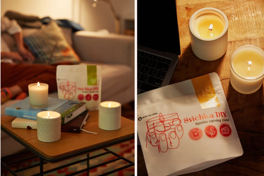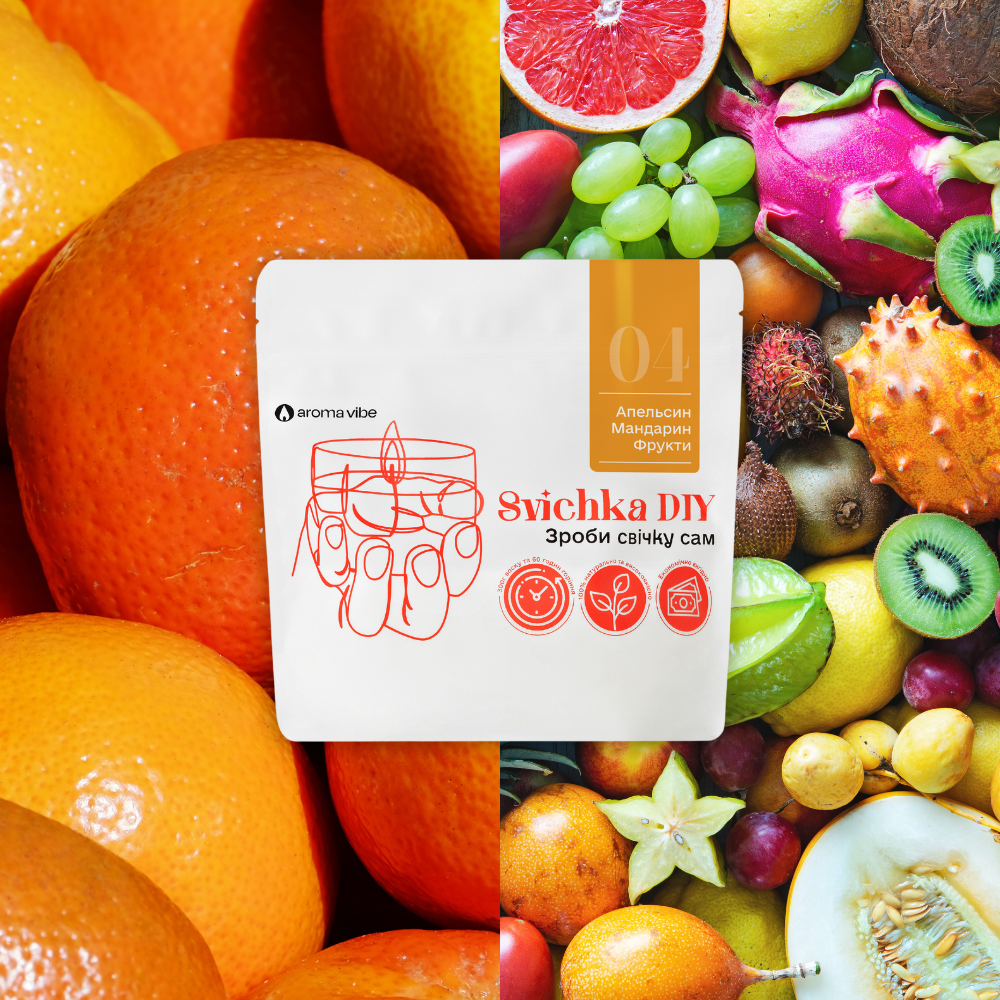 Create Your Own Scented Candle: DIY Candle Kit with Natural Soy Wax, Flowers, Orange, Tangerine & Fruit This fragrance creates a real celebration of freshness in any place. It can be winter outside the window, and in the center - the summer coolness of the shade of a citrus garden filled with ripe fruits. Bright orange peel gives its juices to the air under the gentle sunlight. Orange scented candle. Tangerine candle. Fruit scented candle Space: home, office, clothing or jewelry store, grocery store, clinic Atmosphere: focus, concentration, cleanliness, health Aroma card Family: Citrus Notes: tangerine, orange peel, summer fruits Sweetness: ★☆☆ Tolerance: ★☆☆ Freshness: ★★★ Composition of the set 300 grams (10.5 ounces) of natural soy wax Cotton wick Centering rod Naturally DIY candle kit 300 grams (10.5 ounces) of natural, ecological soy-based wax with safe aromas and essential oils. Without parabens, paraffin and phthalates. A true perfume Perfumed aroma filling made in France. Smells like the best candle you could find anywhere. No apples and strawberries from China. Ecologically 100% recyclable packaging. The candle does not leave behind anything that can harm nature. Use and safety techniques Burning time is approximately 60 hours Cut the wick to a length of 0.5 cm (0,19 inch) before each smoking Never leave a lit candle unattended Avoid drafts and contact of the candle with flammable materials Keep away from small children and pets The recommended burning time is not less than 1 hour and not more than 4 hours in a row Soy wax We use exactly 100% soy wax. This wax is clean and safe for your health. It also provides the best aroma output and long-lasting burning. High-quality aroma oils The candles you make will not differ in aroma from the highest quality candles on the market. In addition, aroma oils are certified and do not contain parabens, phthalates and other harmful chemicals. Made in Ukraine Each set is made by hand in Kyiv with pride and care. Create comfort with your own hands You will be amazed by the quality of the candles that you will get, because we have developed a very high-quality mixture of soy wax and natural aroma oil on a par with premium candles of the highest quality. DIY Candle is a candle refill . Inside the package, you'll find everything you need to create a candle: pre-scented soy wax , a wick, and a stick to center the wick in your future candle. To make your own candle, you only need our kit, a container, a microwave or a pot of water, and 5 minutes Make candles as easy as one, two, three... Heat the bag in the microwave for 2.5 minutes. Pour the melted wax into your favorite container. Let the wax harden, trim the wick, and enjoy the fresh scent. How to choose a capacity: They fit Glazed ceramics Strong glass Soldered metal cans Enamel products Non-flammable glasses Do not fit Porous ceramics. For example, terracotta Wood, coconut shells, plastic All flammable materials Can't hold water Dimensions DIY candle kit We recommend using containers no larger than 10 cm (5.39 inches) in diameter, because this is how the wick is calculated. The set includes a 12 cm (6.47 inch) long wick, so the capacity should not be higher than 11.5 cm (6.20 inch) Frequently asked questions (FAQ) DIY candle kit Where can I find a wick and a wick holder? Everything in the package! Yes, everything goes together and in order to make a candle you don't need anything except the DIY Candle package How should I choose a glass? It must be a leak-proof glass with a diameter of up to (10 cm 5.39 inch). Can I make a candle without a microwave? Yes, you can put the DIY Candle package in a pot of water. The package should stand upright over medium heat until the wax in it is completely melted. It takes different time from 8 to 15 minutes depending on your stove and pot. How many candles can be made from one set? Contains 300 grams (10.5 ounces) of wax. This is definitely enough for almost any candle you can find at home. But there is only 1 wick in the set, so if you have wax left after you make a candle, you can order more wicks and make more!