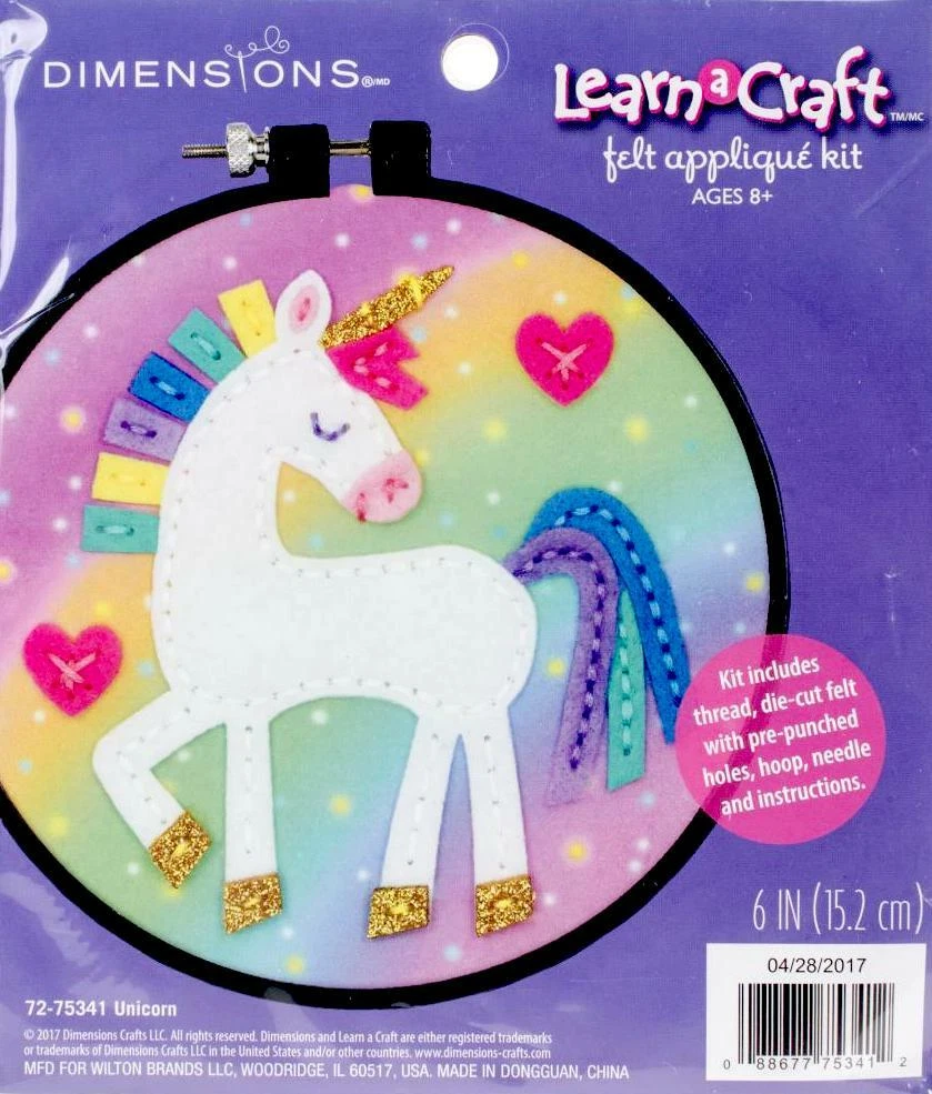 Unicorn Beginner Felt Craft Kit * Brand - Dimensions * Size - 6" * Package Condition - New in Original Package * Skill Level - Beginner - Ages 8+ Kit contains - die-cut felt with pre-punched holes hoop thread needle instructions ** Many of our craft kits are older or vintage and will have some wear to the outside packaging (including price tag residue in some cases). If there is anything worth noting (a tear, missing pieces, open package, etc.), it will be noted in the package condition above. Otherwise, while they may not be in pristine condition, they are sealed and complete with no damage to the contents. ** Feel Free to Ask Questions