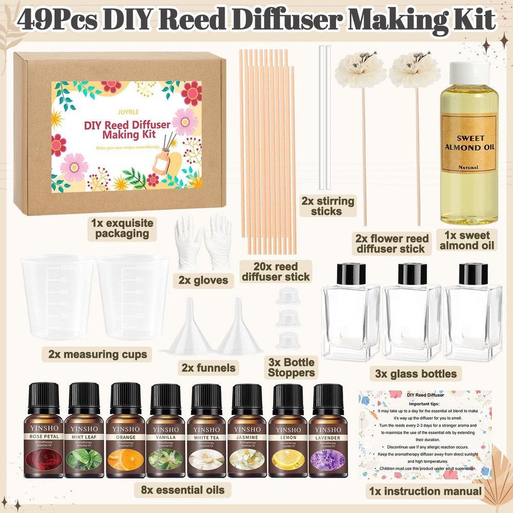 DIY Reed Diffuser Making Kit- Reed Diffuser Making Set with Essential Oils, Flower Reed Diffuser Sticks, 50ml Empty Diffuser Bottle, Home Fragrance Reed Diffuser Gift for Men & Women Craft Your Signature Reed Diffuser: Make your own luxurious diffusers for home! The fragrance diffuser set includes: 1x sweet almond oil, 8x essential oils, 3x glass bottles, 20x reed diffuser sticks, 2x floral reed diffuser sticks, 2x funnels, 2x measuring cups, 2x stirring sticks, 2x gloves, 1x instruction manual and 1x exquisite packaging. Discover the joy of creating personalized scents that reflect your unique style - a truly rewarding creative experience. The Art of Diffuser Scentmaking: Enjoy our essential oils that delicately scent your space for 4-6 weeks. Mix and match our collection of 8 essential oils for diffusers for home to create your perfect aroma: Top Notes: Orange, Lemon, Lavender. Middle Notes: Jasmine, White Tea, Rose. Base Notes: Peppermint, Vanilla. Aroma diffuser isn't just a craft project - home fragrance products is a sensory journey of self-expression and artistic creation. Premium Glass Bottles & Adjustable Scent: 1.7 oz clear glass diffuser bottle crafted with premium-quality glass and durable components, featuring a minimalist design perfect for home use. Reed diffuser set easily customize your fragrance intensity by adding or removing diffuser sticks. For best results, flip the reeds 2-3 times weekly to refresh the scent distribution. Scent Every Space: Dream of a home filled with perfect home fragrance products? DIY diffuser making kit system enhances every environment: bathroom decor, bookshelf decor, hotel collection diffuser, bathroom shelf decor, entryway table decor, room diffuser, bedroom decor, home scent, living rooms, offices. Transform your space into a fresh, peaceful retreat with our long-lasting, mood-boosting fragrances. Best Girls Gift: When you are worried about what gift to give, our DIY reed diffuser set can always impress people. Our indoor fragrance set uses elegant packaging, which is perfect for creating atmosphere on important occasions and festivals. It can be used as a female gift, a teenage girl gift, a perfect gift for mom, Mother's Day gift, Christmas gift, birthday gift, Valentine's Day anniversary gift for women, adults, friends or yourself.