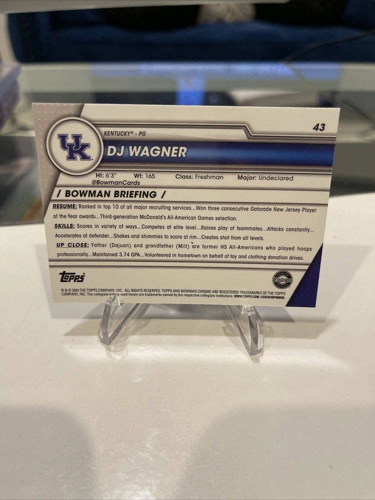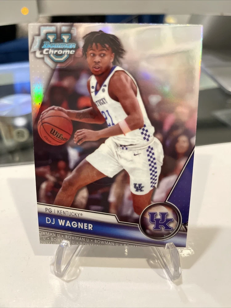 This rare DJ Wagner 2023 Bowman Chrome trading card features a stunning image variation SSP case hit, making it a must-have for any serious collector. With its Chrome Refractor parallel/variety and unique features, this card is sure to be a standout addition to your collection. The card showcases DJ Wagner, a former player for the Arkansas Razorbacks and Kentucky Wildcats, and is part of the National Collegiate Athletic Association (NCAA) league. The card number is 43 and it is from the 2023 season. Don't miss out on the opportunity to own this highly sought-after sports trading card.
