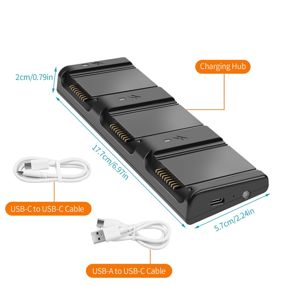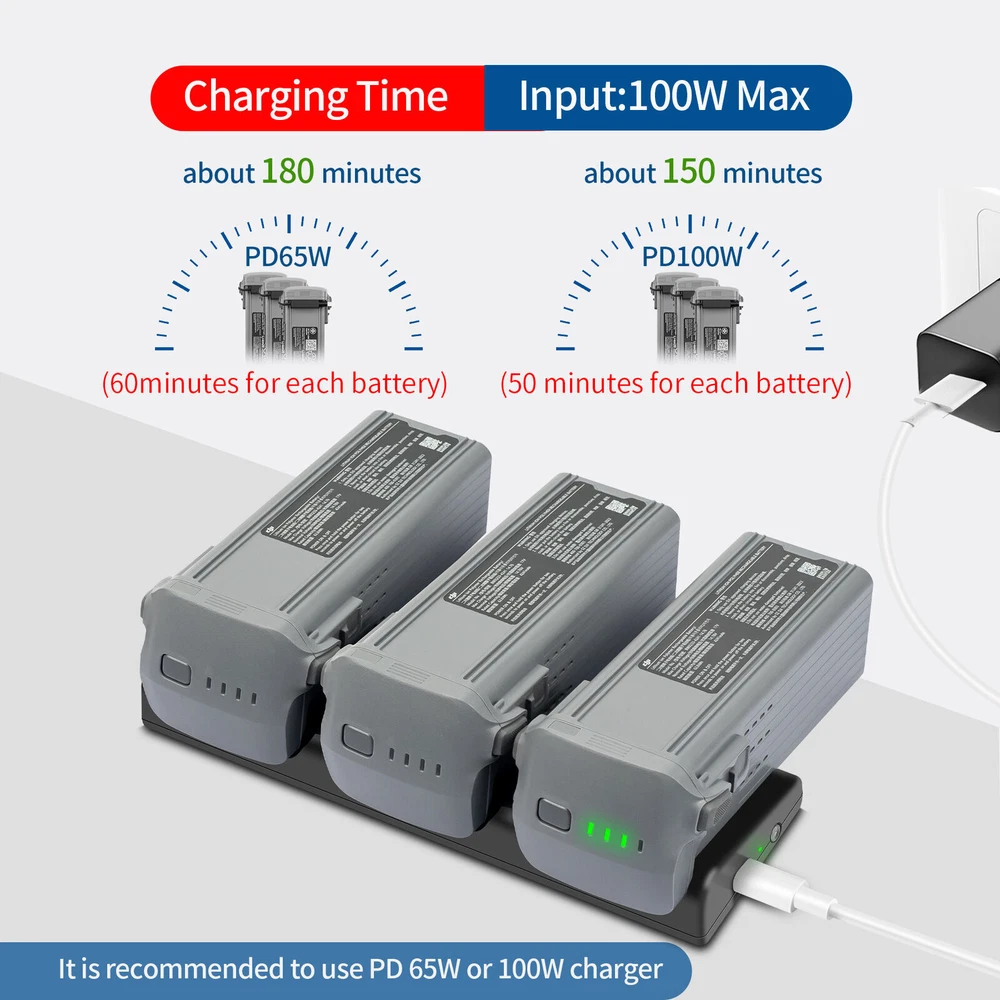 SAFE & SECURE SHOPPING 100% SATISFACTION GUARANTEED FAST SHIPPING Store Categories Store Categories You may also like 3 Way Fast Battery Charger USB Charging Hub Dock Station For DJI AIR 3 Drone C Product Description Features: Three way battery manager, supporting 5V-20V/5A (Max); PD65W and 100W. Charging mode; Battery maintenance storage mode: When inputting PD100W, it only takes 50 minutes to fully charge one battery Storage mode: The storage mode can automatically stop charging batteries with a battery level below about 60% after reaching about 60%. Storage with no or full charge of the drone's battery can cause battery decay and swelling. Long term storage requires a battery level of about 60%. Note: Long press and hold the button for 3 seconds to switch modes. Note: In this mode, batteries with a battery level above about 60% will no longer be charged Discharge mode: can be used as a power bank, convert the for Air3 battery into a power bank, which can charge USB devices (i.e. discharge the battery) Specifications: Input voltage: 5V-20V/5A(Max) Output: 17.0V/5.0A(Max) TYPE-C output: 5V/9V/12V/15V-3A; 20V-3.25A Charging time: About 60 minutes for each battery with 65W input; about 180 minutes for 3 batteries; About 50 minutes for each battery with 100W input, about 150 minutes for 3 batteries. Product weight: 97g Suitable for DJI AIR 3 Battery Package includes: 1x Three-way battery charger 1x USB-A to USB-C charging cable 1x USB-C to USB-C charging cable Shipping Returns Contact Us Payment Shipping We ship most of our orders within 24 hours, and may up to 48 hours. If you want faster shipping way, please contact us before making a payment. Sometimes due to problems with our transportation company system, your shipping information may be delayed to update. We recommend that you try again after 3-4 days. If you still haven't checked the shipping information, you can contact us via ebay message. Returns 1. 30 days warranty from the purchased date. Please contact us via email before returning the defective item. 2.Our warranty does not extended to any product that are physically damaged or that are not under normal operating conditions as result of misuse or improper installation on the buyer/user's part. 3.Return items should include the original packaging and all accessories. buyers MUST contact us for the returning address. 4.In all cases, buyers pay shipping fees at their own cost to return products for exchange or refund. We will be responsible for the postage of replacements. Refund will be made upon receipt of the returned item. Contact Us Pls contact us if you have any problems,we will try our best to solve for you Payment We accept all verified payment from eBay. Copyright © 2022 Tongtool