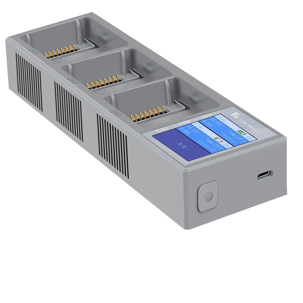 Features: 1. You can check the battery level 2. You can put up to 3 batteries, and charge them in order from high to low. High-powered batteries are charged first (not simultaneously). 3. Storage mode: In charging mode, press and hold the button for 2 seconds to switch to storage mode. The best electric power for long-term storage of drones is 60%. In storage mode, the battery with power below 60% can be charged to 60% and then automatically stopped. . After the storage, Done will be displayed, (Only the battery with the power below 60% can be stored and charged, and the storage function cannot be used when the power is greater than 60%. 4. Support PD fast charging 5. Connect the original 65W portable charger] about 85 minutes per battery 3 × 85 = 255 minutes for 3 batteries Specifications: 100% brand new Name: Digital Display Charging Butler Material: ABS color: Grey Input; 5V/9V/12V/15V—3A; 20V—5A; Output: 17.6V/4A(65max) Product net weight: 129G Product size: 18*5.5*3CM Suitable For DJI MAVIC 3 Drone Package includes: 1 x Digital Display Charging