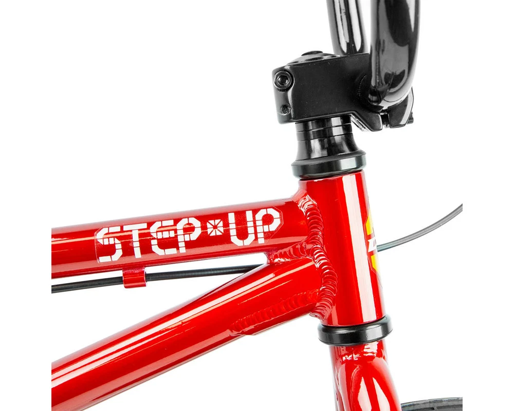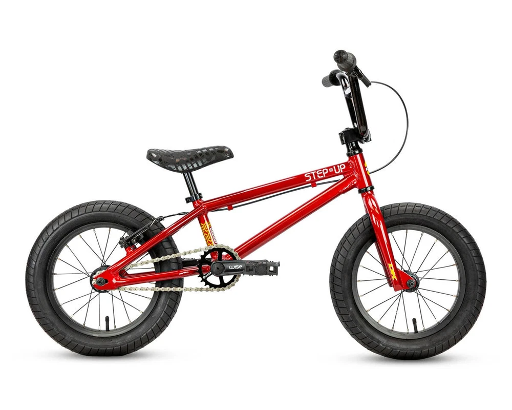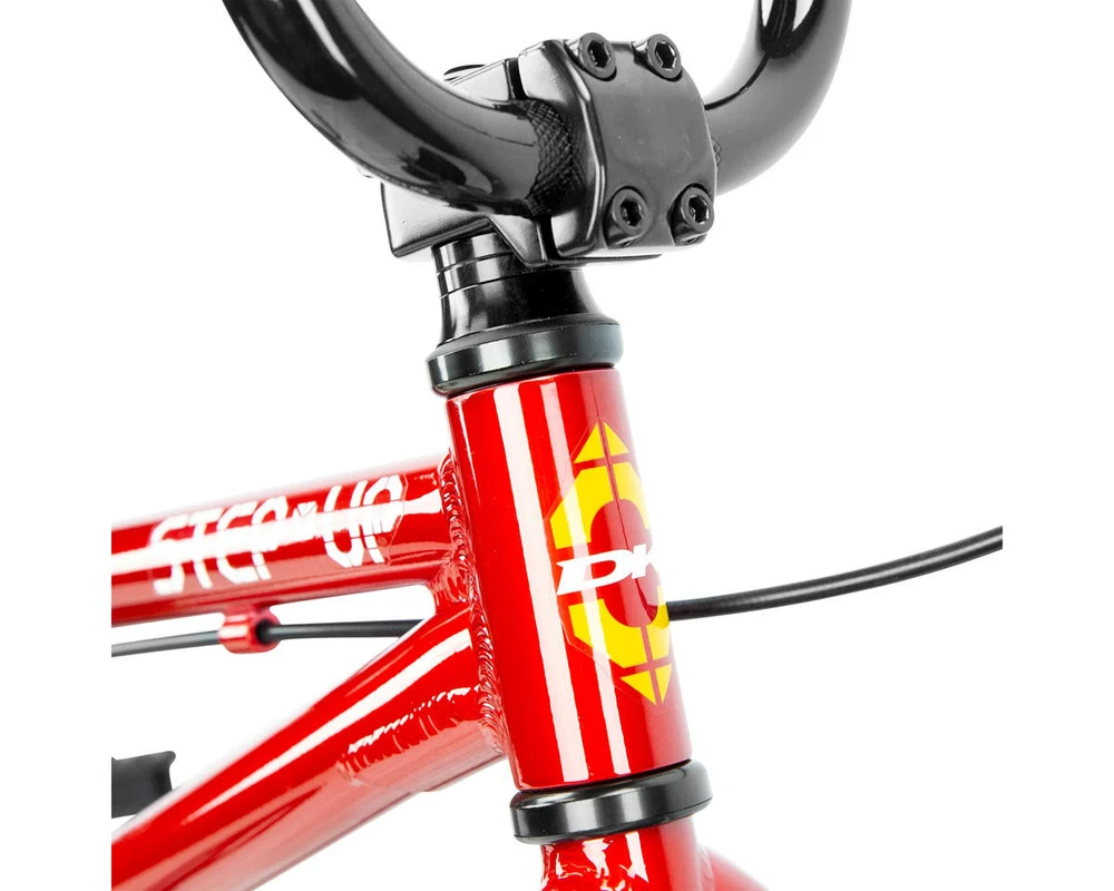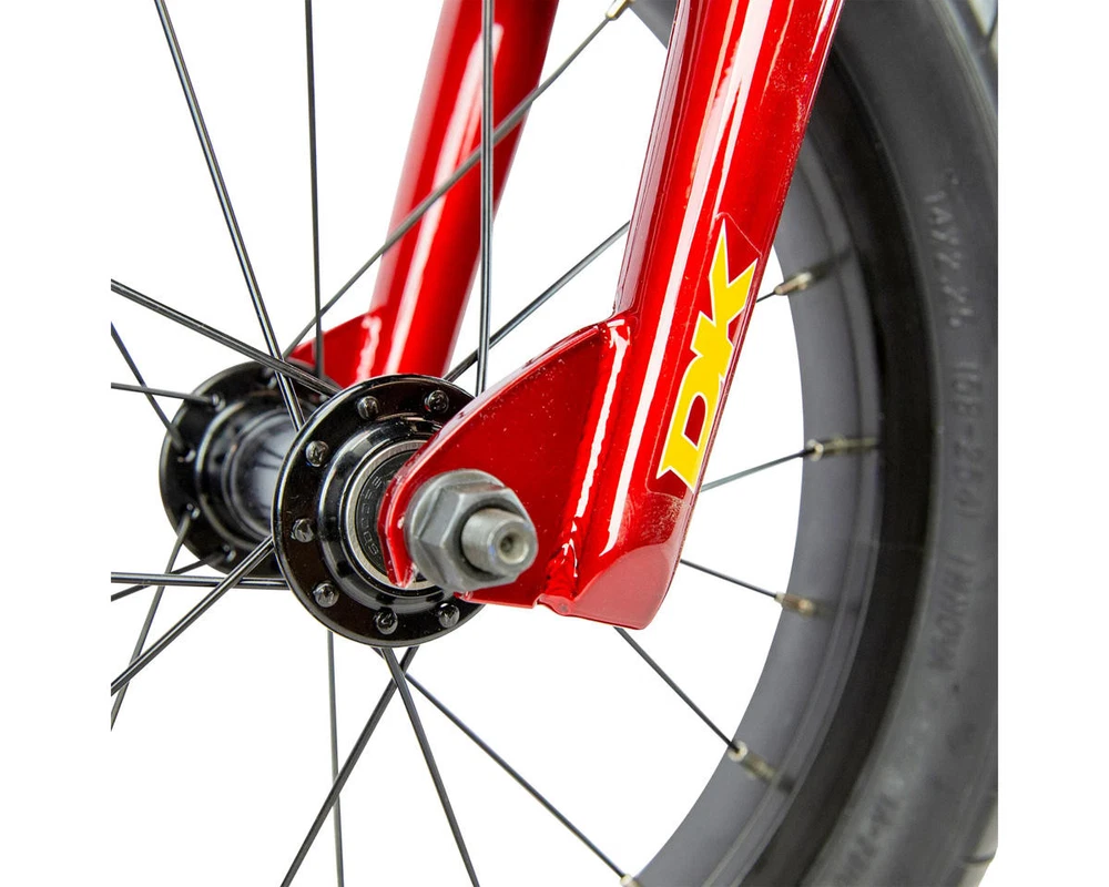 DK Step Up 14" BMX Bike Description: The DK Step Up 14" BMX bike is perfect for young riders wanting to improve their skills. It has a lightweight 6061 aluminum frame and a 15.5” top tube for easy handling. Key features include 14-inch wheels with street tires, a safe linear V-brake, and 102mm Wise alloy cranks. The front load stem has a 30mm reach, and the 6" rise handlebars offer a comfy grip. Weighing just 15lbs 8oz, this bike is ideal for little BMX fans ready for new adventures! Specifications: Frame: 6061 Aluminum Fork: 4130 Chromoly Steerer w/ Tapered Legs and Integrated Crown Race Headset: Standard Threadless (1") Stem: Alloy Front Load (30mm Reach) Bars: Alloy (6" Rise) Grips: DUO Mini Grips Cranks: Wise Alloy 3-Piece (102mm Length) Bottom Bracket: Euro w/ 4130 Chromoly Spindle Pedals: PC Mini Platform Sprocket: DK (25 Tooth) Chain: KMC Z-510 Front Hub: Alloy Sealed (3/8" Axle) Rear Hub: Alloy Sealed (3/8" Axle) Driver: 9 Tooth Front Rim: Alloy (Single Wall) (20 Hole) Rear Rim: Alloy (Single Wall) (20 Hole) Front Tire: Street (14" x 2.25") Rear Tire: Street (14" x 2.25") Seat: DK Padded (Combo) Seat Post: Combo (22.2mm) Seat Clamp: Alloy Brake Lever: Wise Short Reach Brakes: Linear V-brake Alloy Gyro: - Gyro Tabs: None Brake Mounts: Welded Extras: - Color: Red Weight: 15.5 lbs Geometry: Toptube Length: 15.5” Chainstay Length: 11.75” Headtube Angle: 74° Seattube Angle: 71° Bottom Bracket Height: - Standover: - Recommended Sizing Guide: 2'8" to 3'6" Note: To ensure that every component on your bicycle is working properly, we recommend that all bikes be assembled by a qualified mechanic. Improper assembly of your bicycle may lead to premature wear or failure of individual components such as headsets, crank assembly and wheels. Failure to do so may void the manufacturer warranty. About Us | View Store