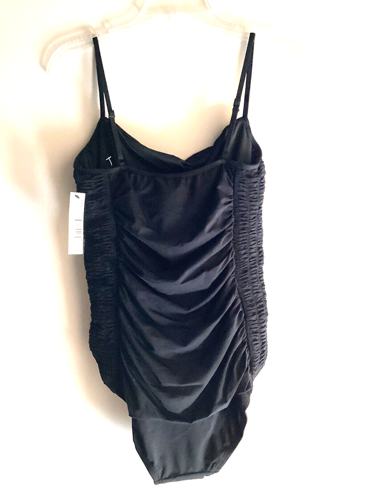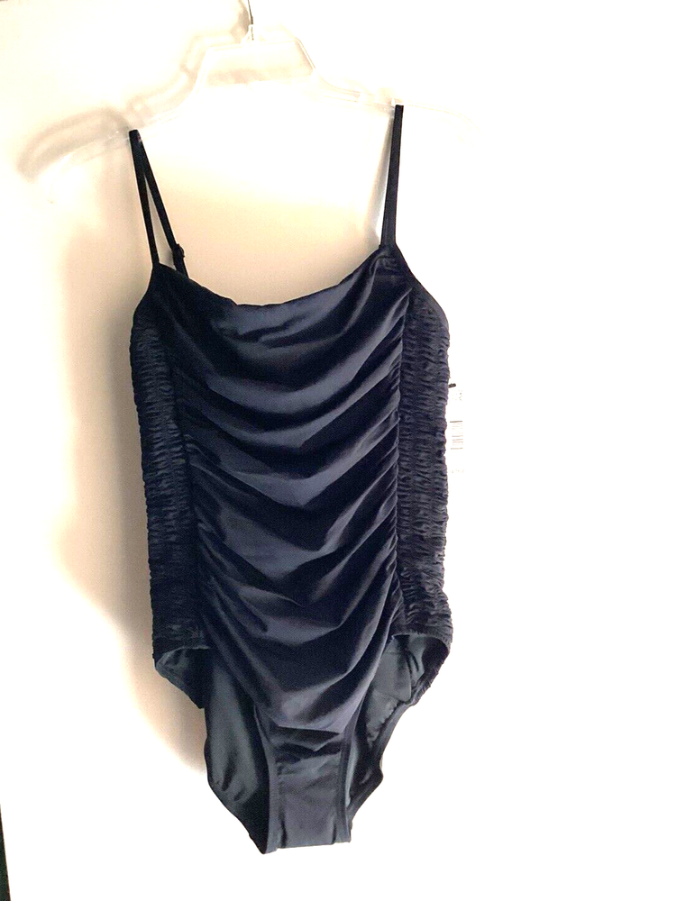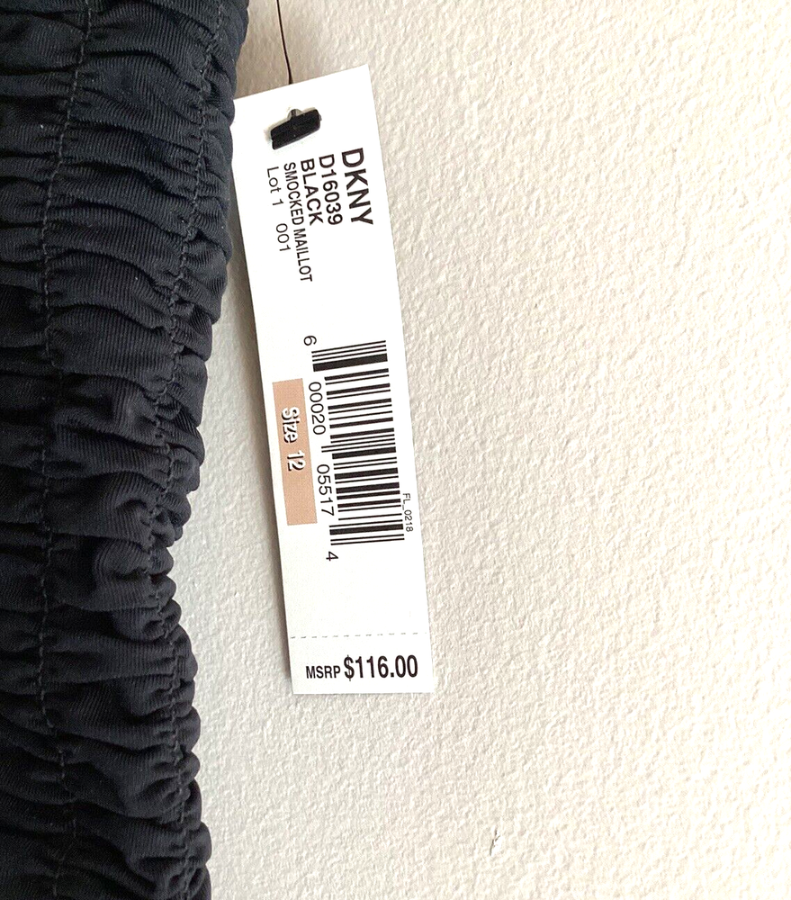 Make a statement at the beach with this stunning DKNY black one-piece bathing suit in size 12. The bandeau top style exudes elegance and sophistication, while the solid pattern and black color make it a versatile piece for any swimming enthusiast. The suit is made of a blend of polyester and spandex, providing a comfortable and compression fit that will not budge. This women's one-piece bathing suit is designed with a C cup size, perfect for providing ample support while enjoying the water. The suit is also lined, ensuring that you stay comfortable and confident all day long. Whether you're lounging by the pool or taking a dip in the ocean, this DKNY one-piece bathing suit is the perfect addition to your swimwear collection. NEW with tags, MSRP $116.00, please see pictures for details! Thanks for looking!