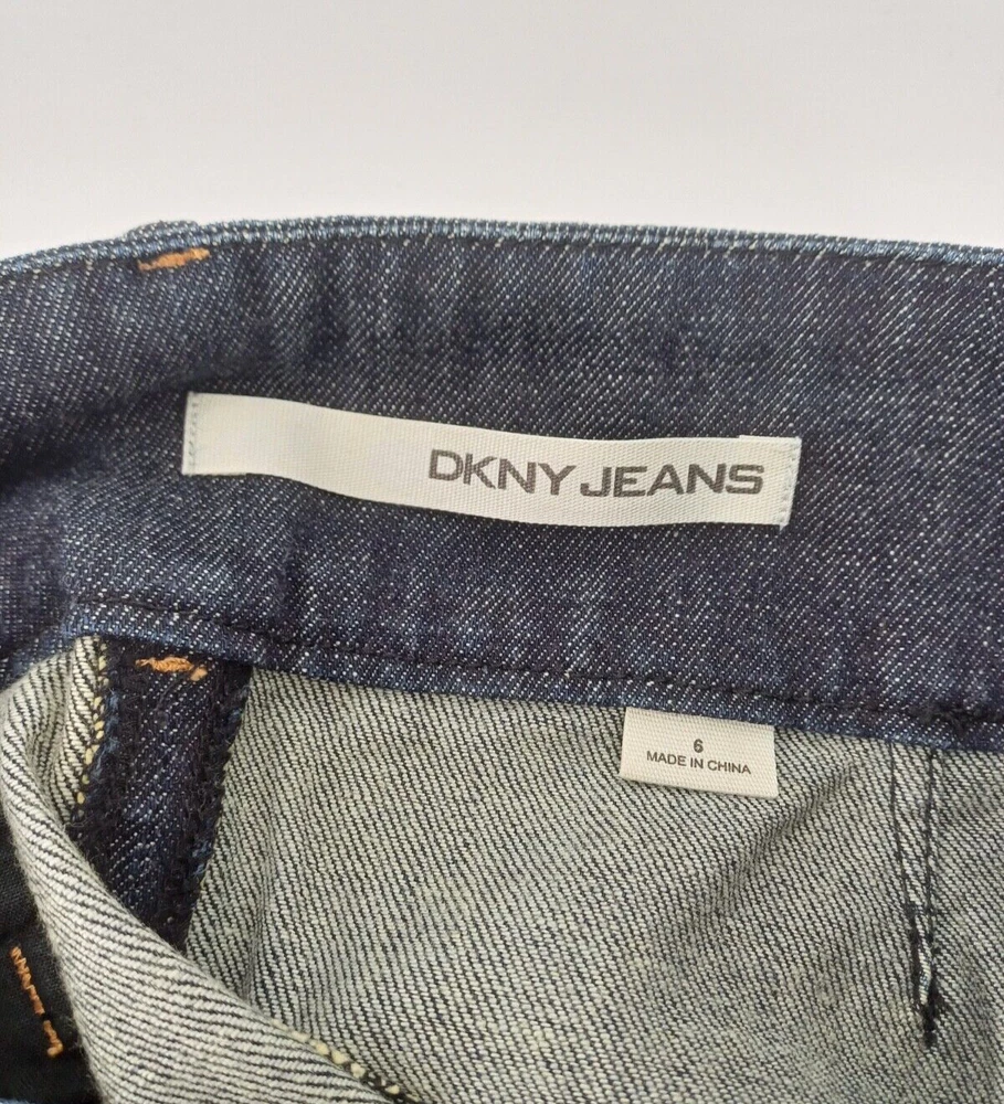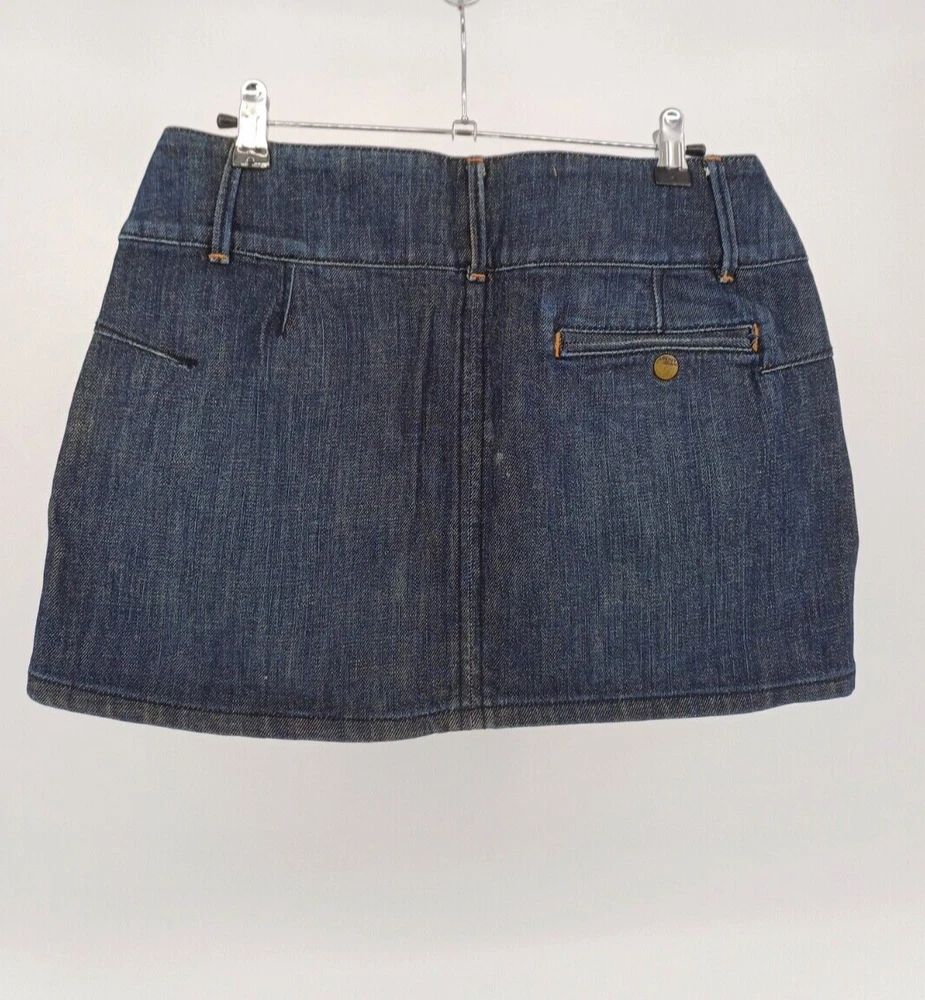 DKNY Jeans Denim Mini Skirt Women's UK Size 6. A dark blue mini skirt with zipper pockets on the front and a pocket on the back. It’s in good condition however there is some discolouration on the inside of the skirt and a light mark on the back. Measurements: Waist size: 30 inch Length: 13.5 inch