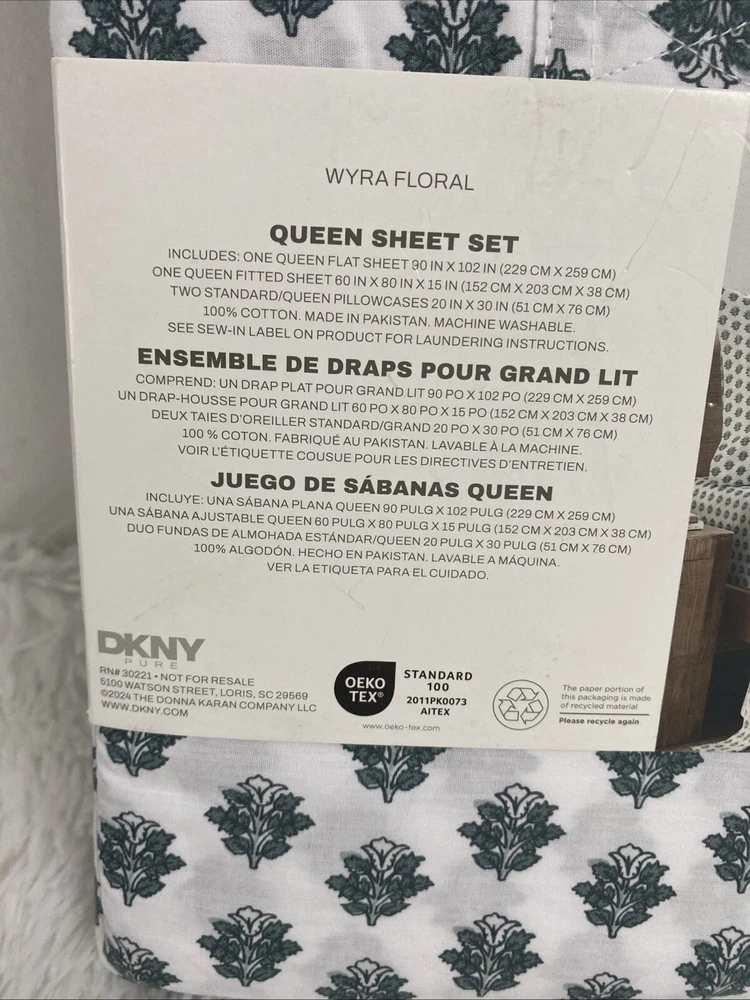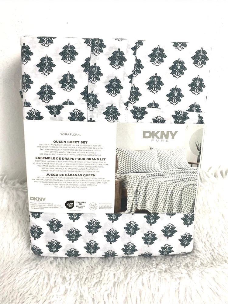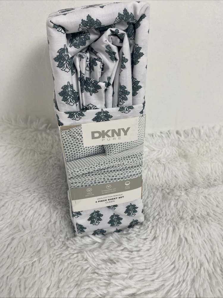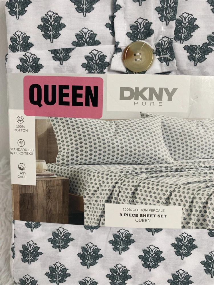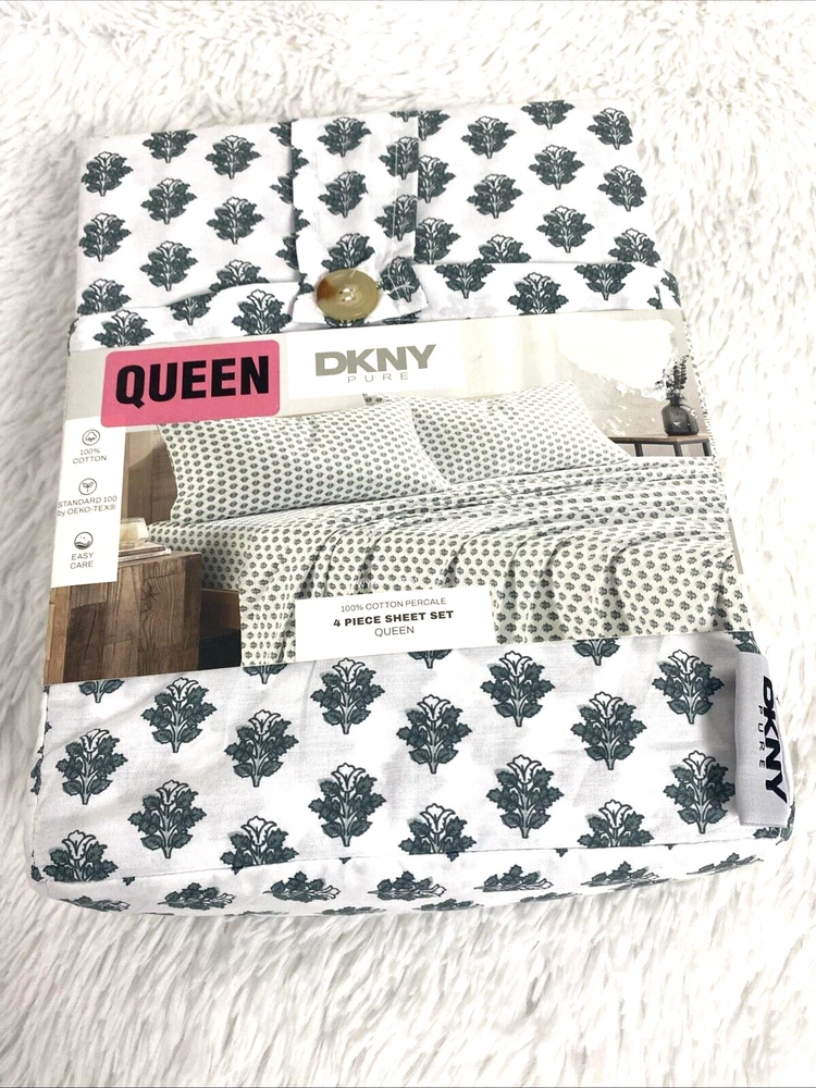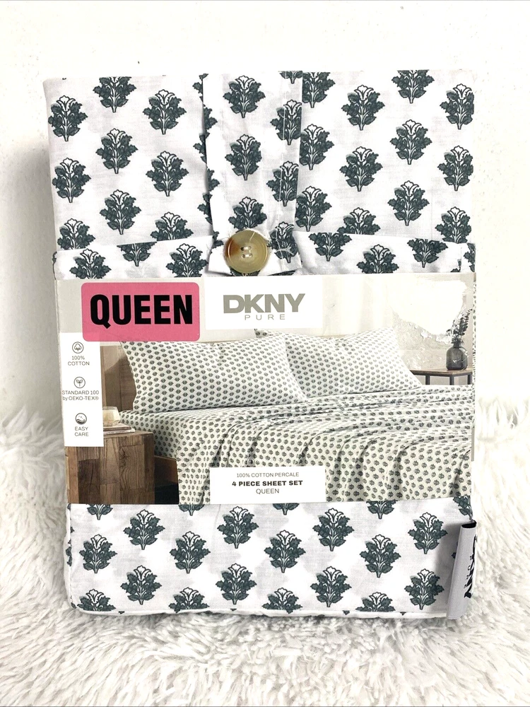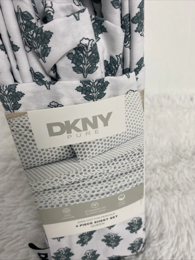 DKNY Queen Sheet Set Donna Karan New York Standard OEKO TEX 100% Cotton Percale 4 Pieces Wyra Floral White Green new please see pictures for more details