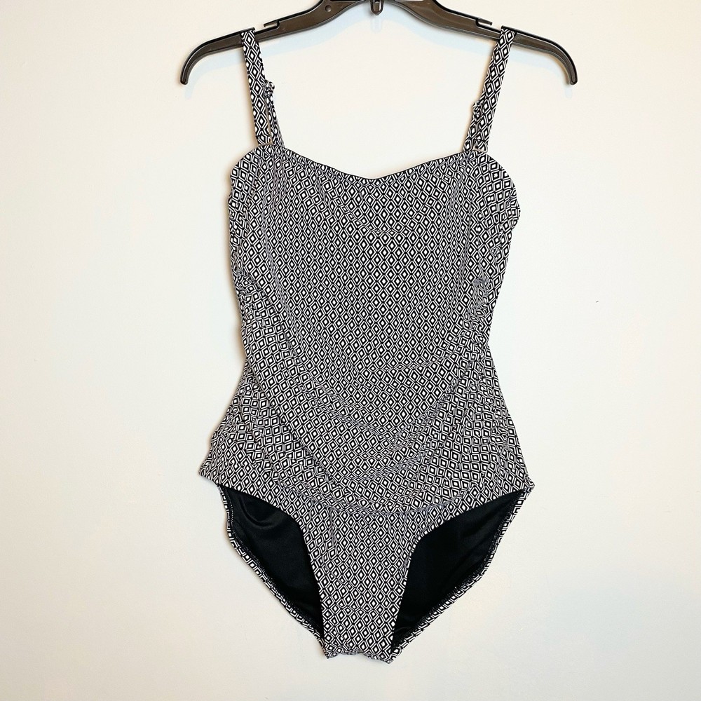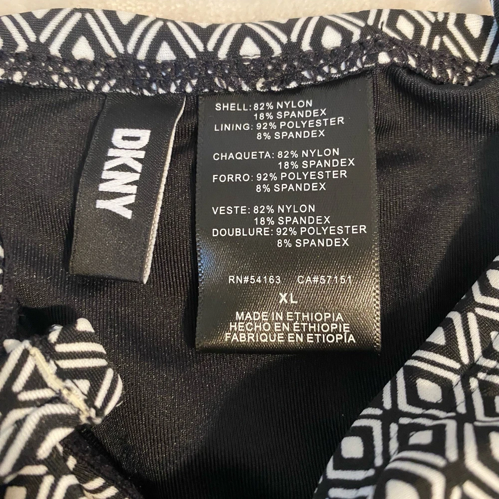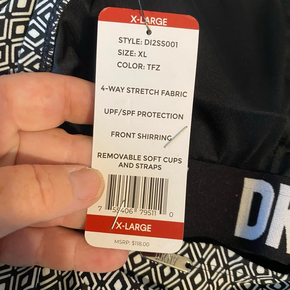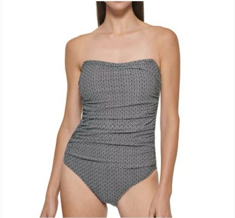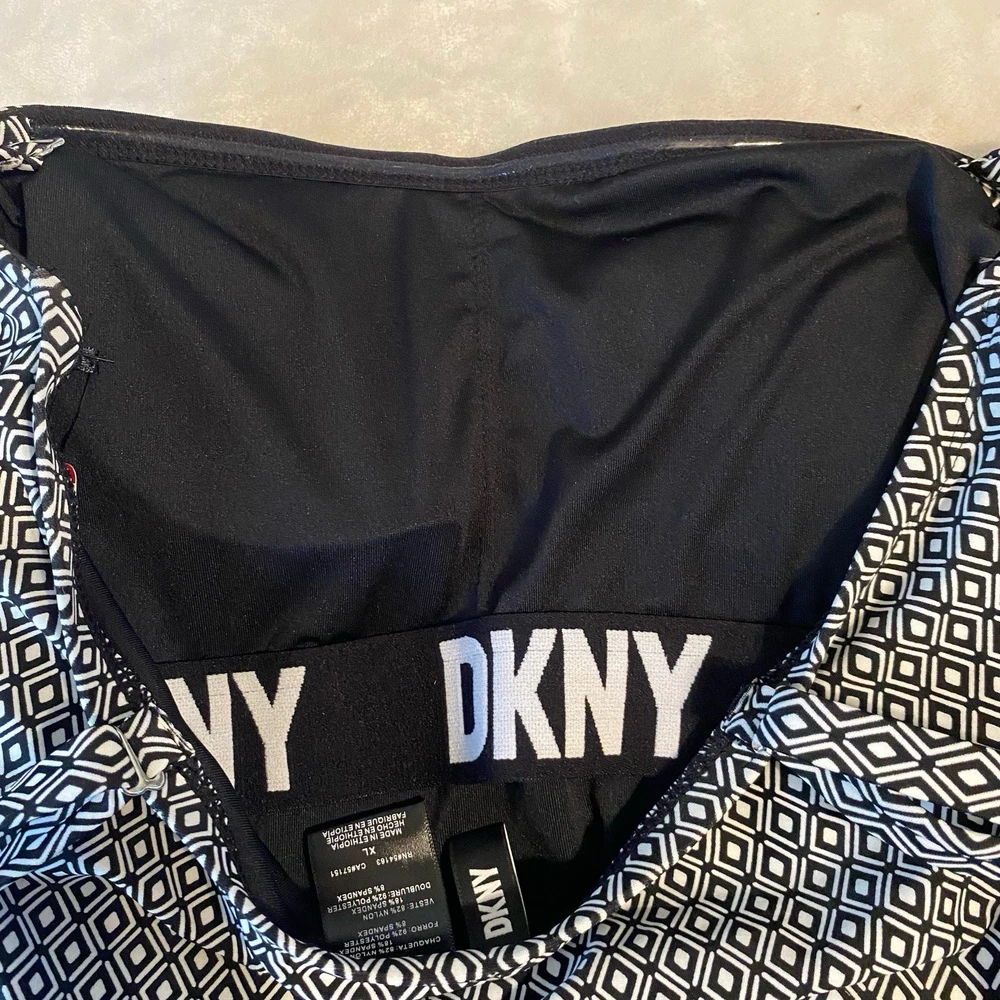 DKNY Women's One Piece Bandeau Maillot Swimsuit DKNY has feminine shapes in smooth, quick-drying fabric, with comfortable stretch and complete lining for a flattering and modern swimsuit. Removable soft cups and straps Straps can be worn straight, crossed or removed Shelf bra with padding Front body shirring for tummy camouflage 4 way stretch fabric UPF/SPF protection Quick drying fabric Moderate Bottom Coverage 82% Nylon, 18% Spandex Size XL Please use the included size chart for best fit Smoke free home Fast shipping