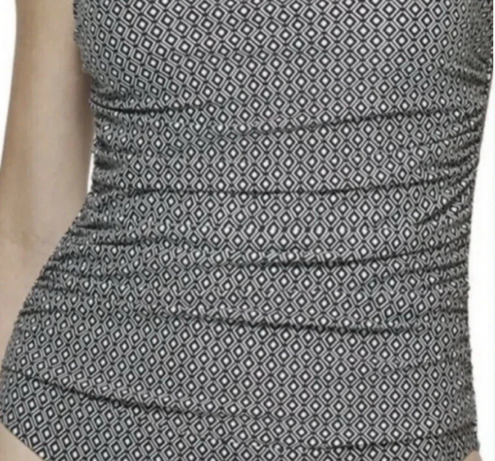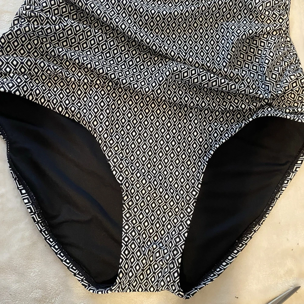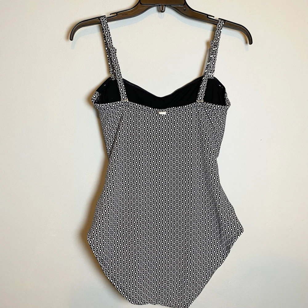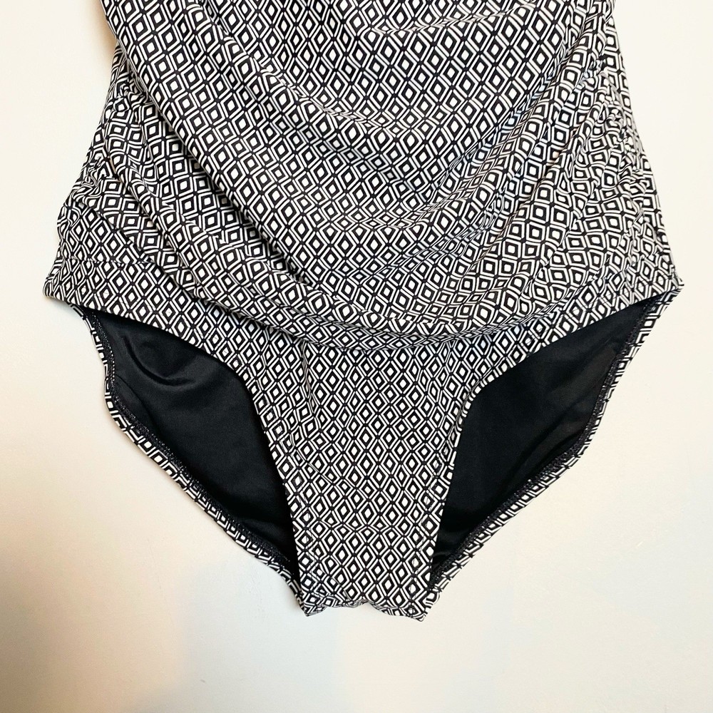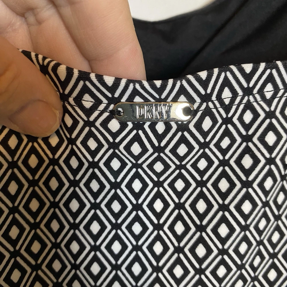 DKNY Women's One Piece Bandeau Maillot Swimsuit DKNY has feminine shapes in smooth, quick-drying fabric, with comfortable stretch and complete lining for a flattering and modern swimsuit. Removable soft cups and straps Straps can be worn straight, crossed or removed Shelf bra with padding Front body shirring for tummy camouflage 4 way stretch fabric UPF/SPF protection Quick drying fabric Moderate Bottom Coverage 82% Nylon, 18% Spandex Size XL Please use the included size chart for best fit Smoke free home Fast shipping