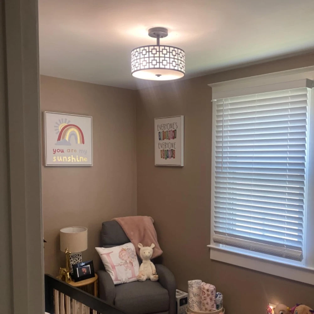 Exquisite Carved Art Lampshade: This flush mount ceiling light showcases an astonishing geometric design, setting it apart from traditional fabric shade ceiling lights. The square grid pattern meticulously carved into the metal frame strikes a perfect balance between precision and elegance. The open spaces within the carving allow soft ambient light to filter through the frosted shade, providing a warm and even glow Semi-Flush Mount Ceiling Light: Compared to chandeliers, semi flush mount lights are installed closer to the ceiling, making them ideal for rooms with lower ceilings. Additionally, the design of kitchen light fixture complements a variety of styles, from modern to traditional, seamlessly blending with different interior decorations Durable and Timeless: Each drum lighting fixture is a testament to the home. Our metal drum shade ceiling light, with its exceptional durability, carries the memories of home and passes on its warmth. Compared to fabric shade counterparts, our metal and acrylic double-layer lampshade design is easy to maintain, retaining its original state with a simple wipe, and will not bend or deform over time, ensuring a consistently high-quality lighting experience for years to come 3 x E26 Bulbs (Bulbs Not Included): Our 3-light ceiling light fixture comes with 3xE26 sockets, providing even and bright illumination suitable for living rooms, kitchens, hallways, and other spaces that require good lighting. Moreover, it supports dimming functionality, allowing you to adjust the brightness according to different occasions and needs, creating the ideal ambiance. The bedroom ceiling lamp is compatible with E26-based bulbs, including LED, CFL, incandescent, and halogen bulbs Perfect Size for Versatile Applications: With its perfect size of 12.6"L x 12.6"W x 10.2"H, gold light fixture provides ample ambient light without taking up too much space. Suitable for various settings such as bedrooms, kid’s rooms, bathrooms, home offices, dining rooms, laundry rooms, entrances, study areas, and more, it caters to a wide range of users including interior designers, homeowners, tenants, families, parents, artists, and home decorators Satisfaction Guarantee: We offer a 12-month quality guarantee and a 30-day refund policy. If you are not satisfied with our close to ceiling light fixtures, please contact us at any time, and we will resolve any issues for you promptly within 24 hours Product Description 1 Entrance 2 Kitchen 3 Living Room 4 Bedroom 10+ years of industry experience, 1930+ reviews, and 4.7+ rating. Our high-quality drum ceiling lights are both stylish and reliable. 1 Why choose us? 2 Customer Sharing Semi-Flush Drum Light DLLT Drum Light Fixture 12.6Inch Size: 12.6Inch Metal+Acrylic Materials: Metal+Acrylic Black Color: Silver 3×E26 Bulb Base: 3×E26 12.6Inch Size: 12.6Inch Metal+Acrylic Materials: Metal+Acrylic Black Color: Gold 3×E26 Bulb Base: 3×E26 Semi-Flush Drum Light Semi-Flush Drum Light